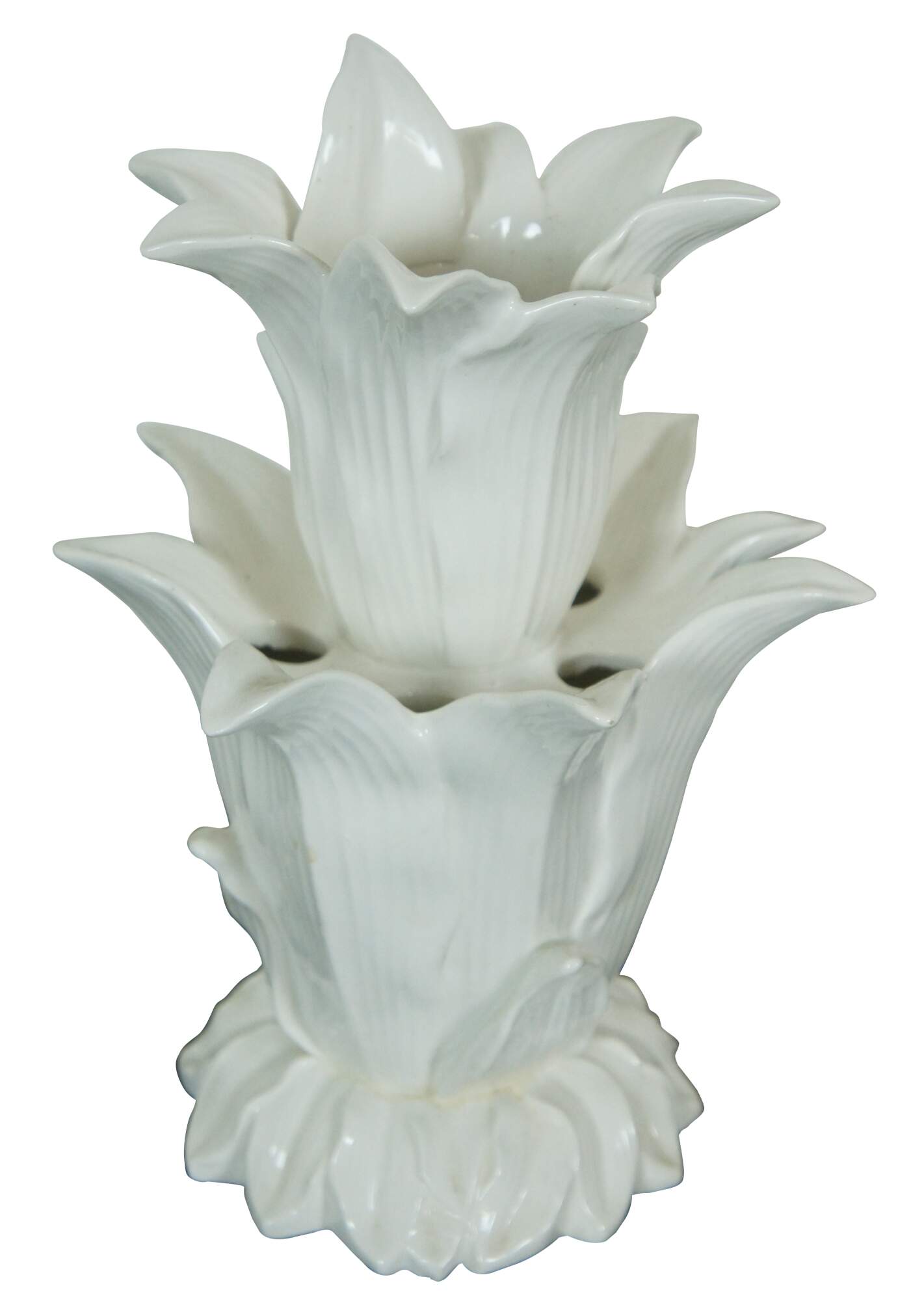 Pair of vintage white porcelain artichoke or tulipiere tiered bud vases in the shape of stacked tulip blossoms on top of each other, providing two levels for displaying flowers; made in Italy.