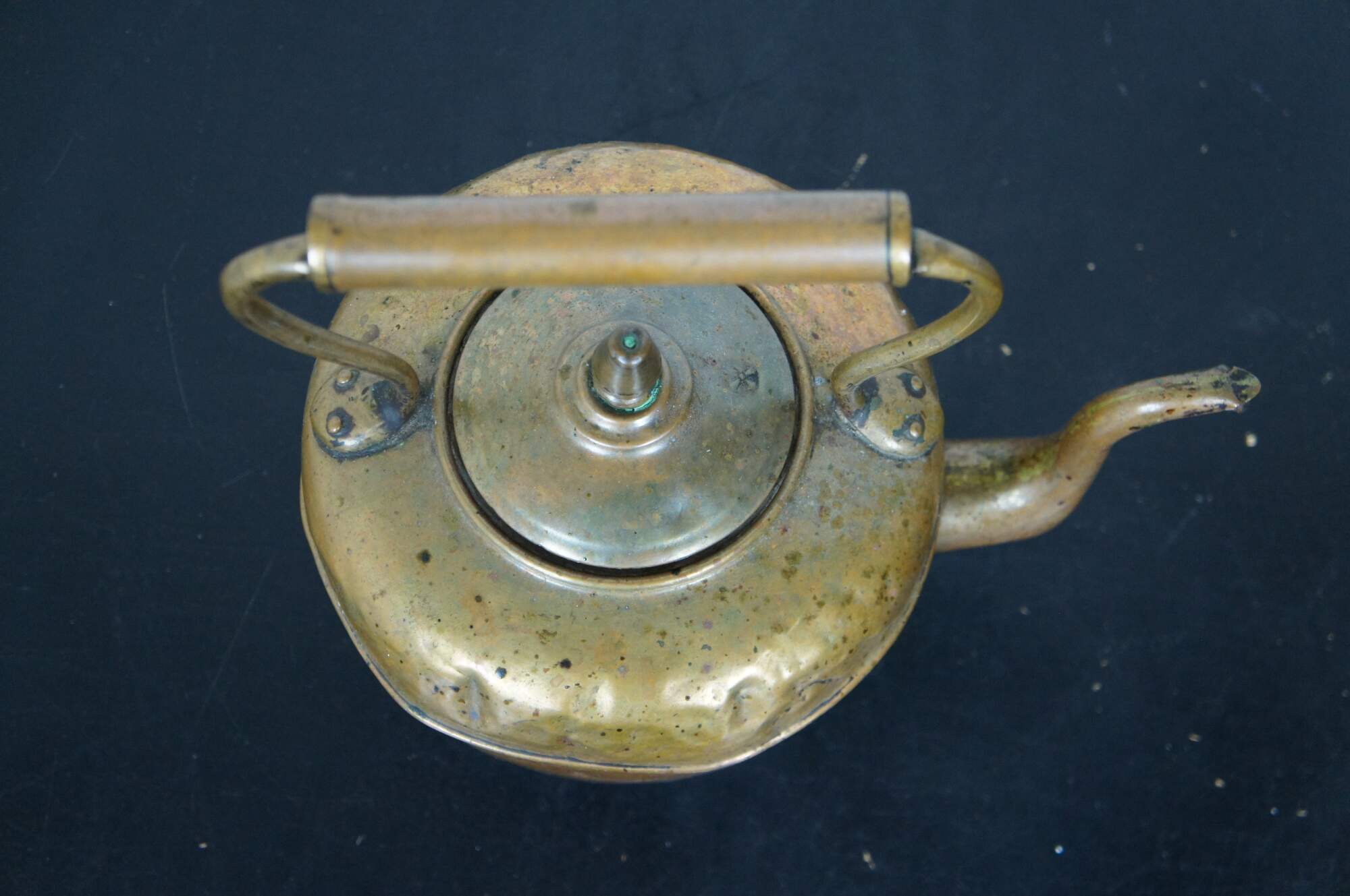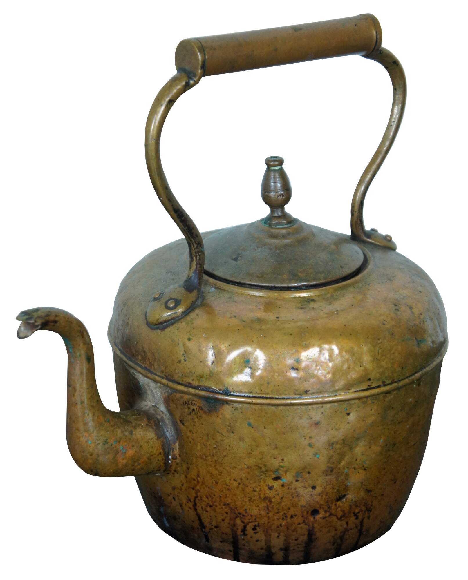 Antique 19th century French copper tea kettle with fixed handle, acorn shaped finial, gooseneck spout and beautiful patina. Base marked with the words Marque Deposse surrounding a weaving snake; lid marked with a windmill.