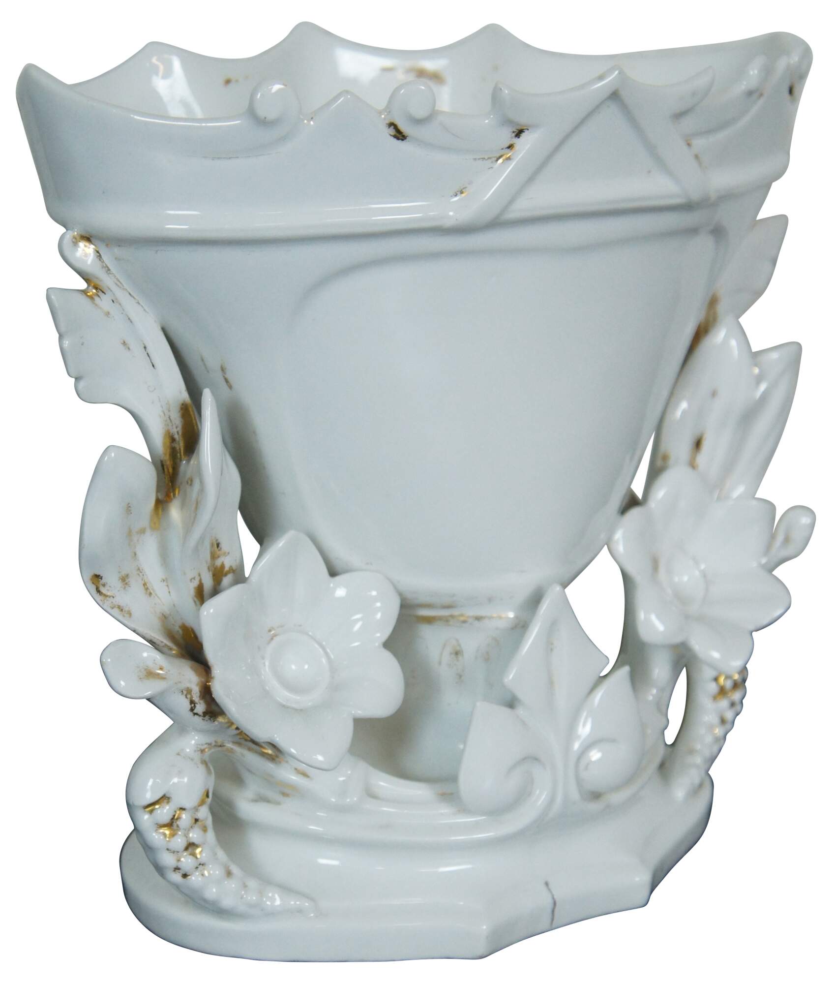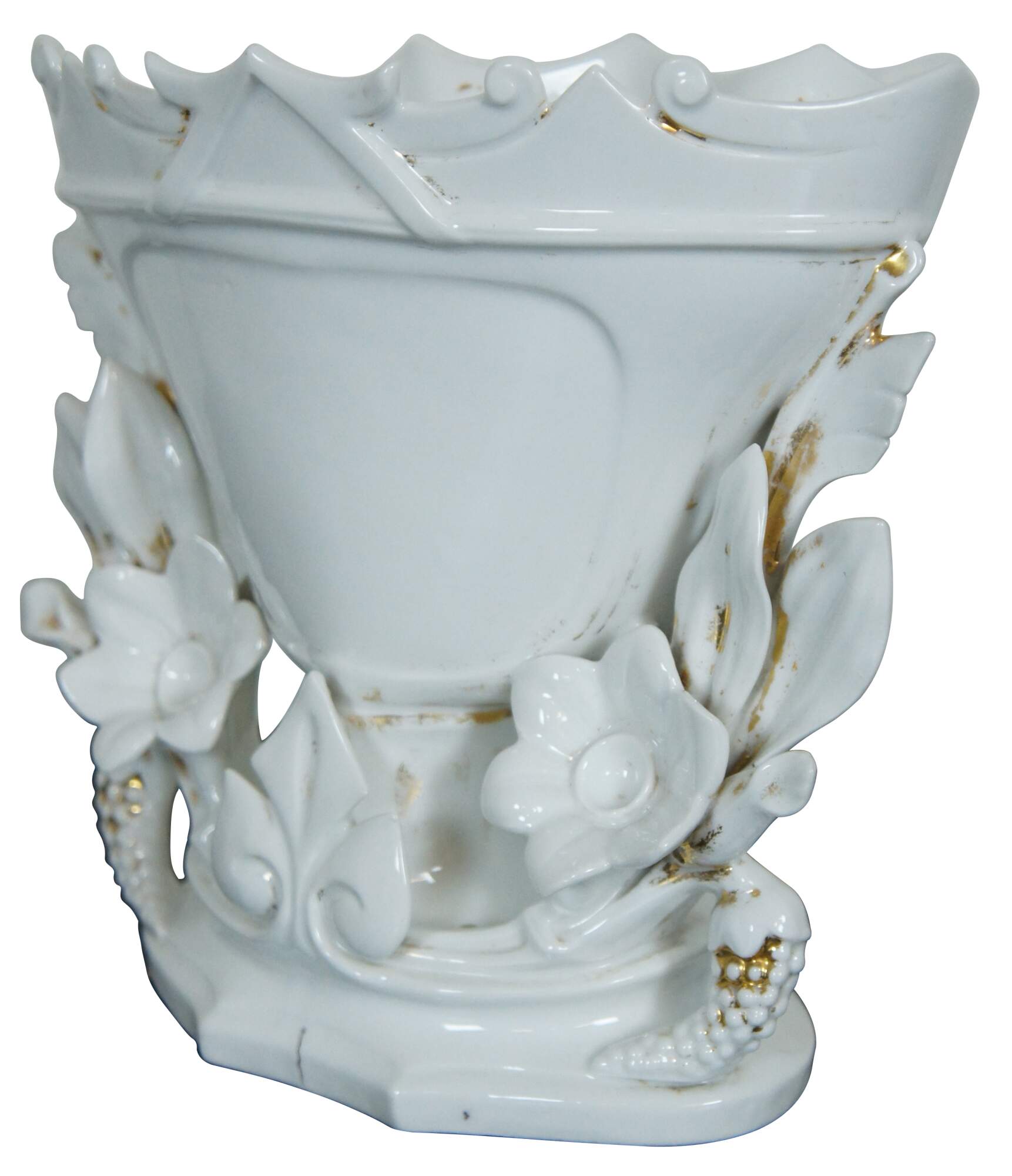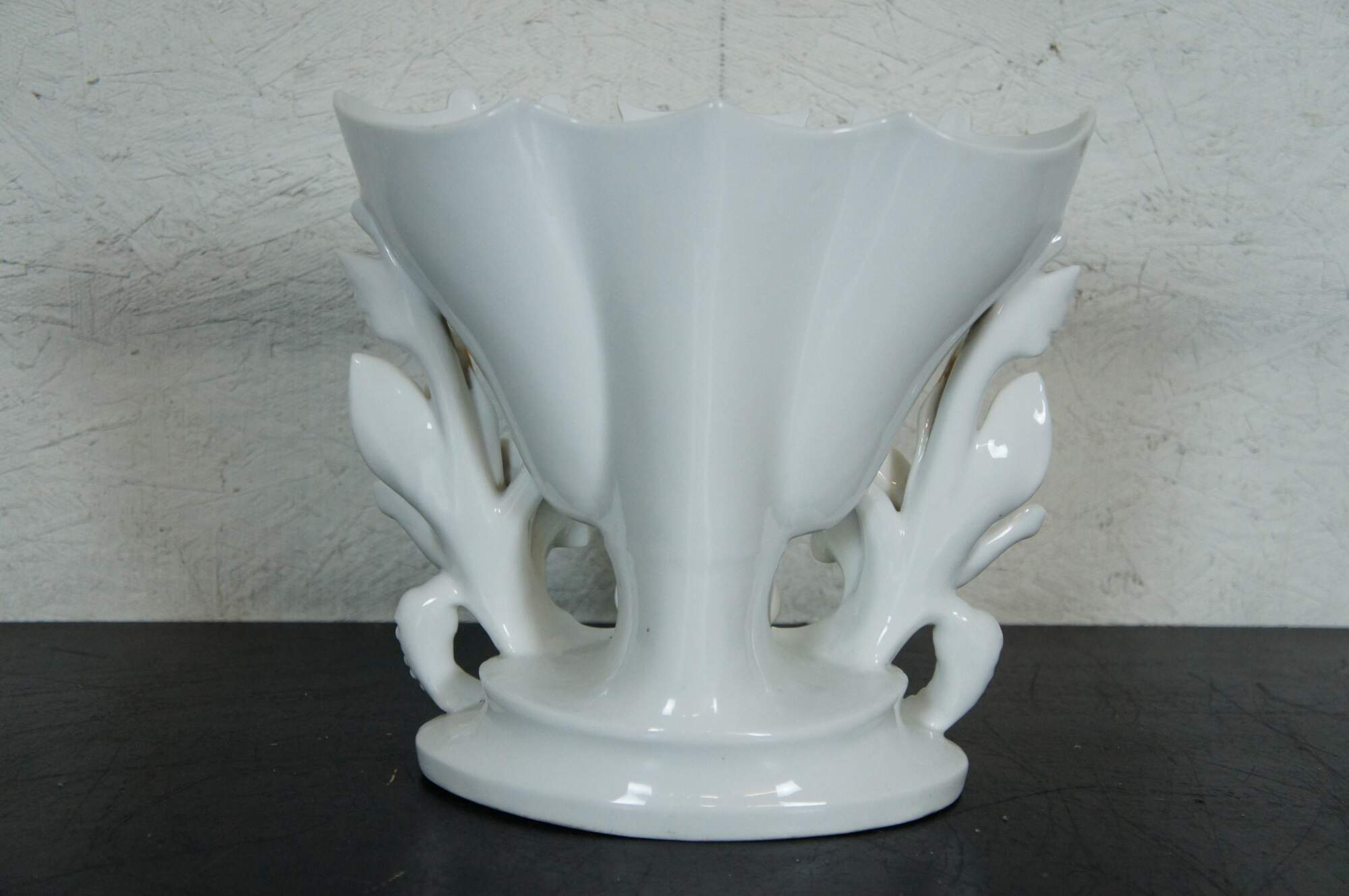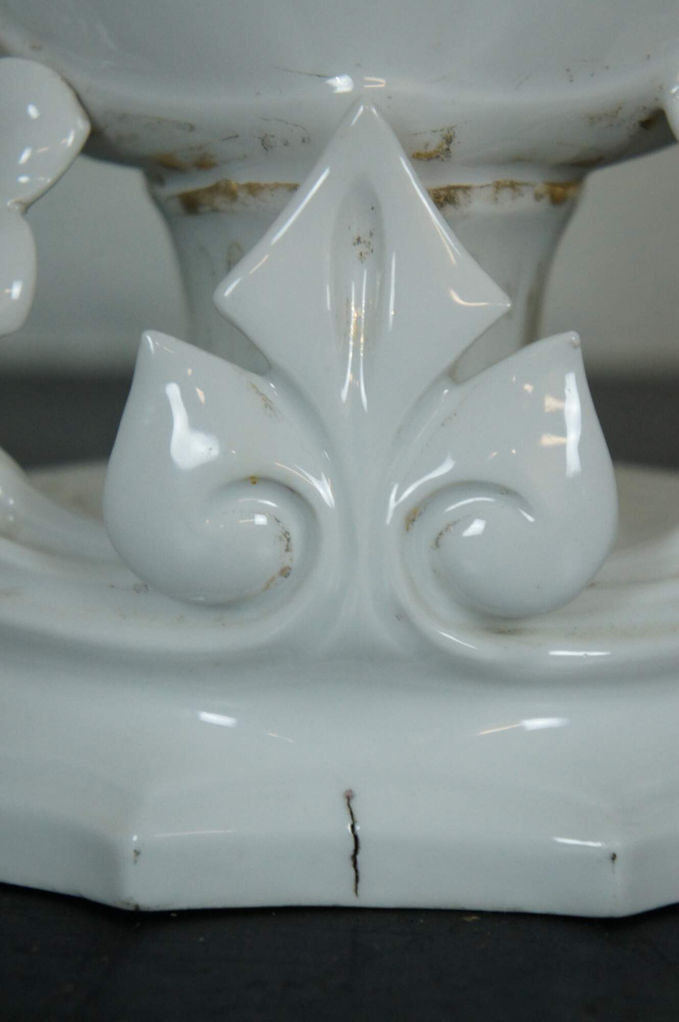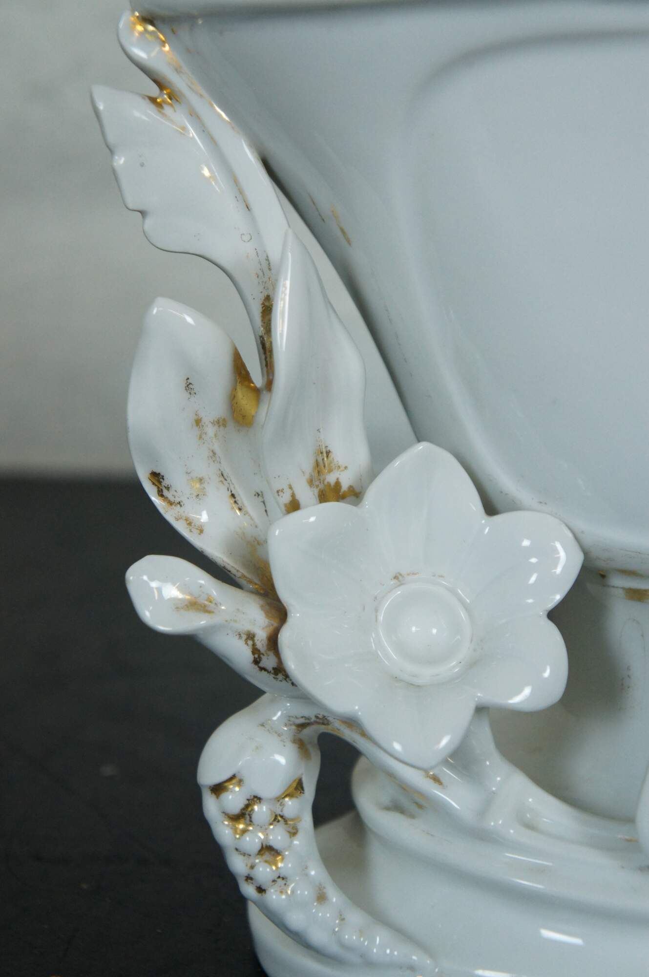 Antique French Vieux Old Paris white porcelain centerpiece vase with a footed goblet or trophy life form with pieced floral accents and scalloped rim.