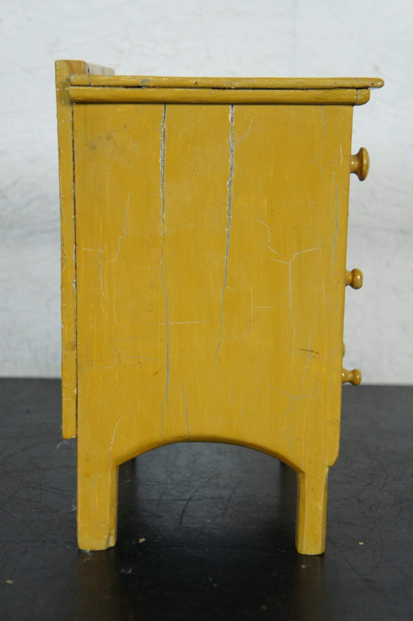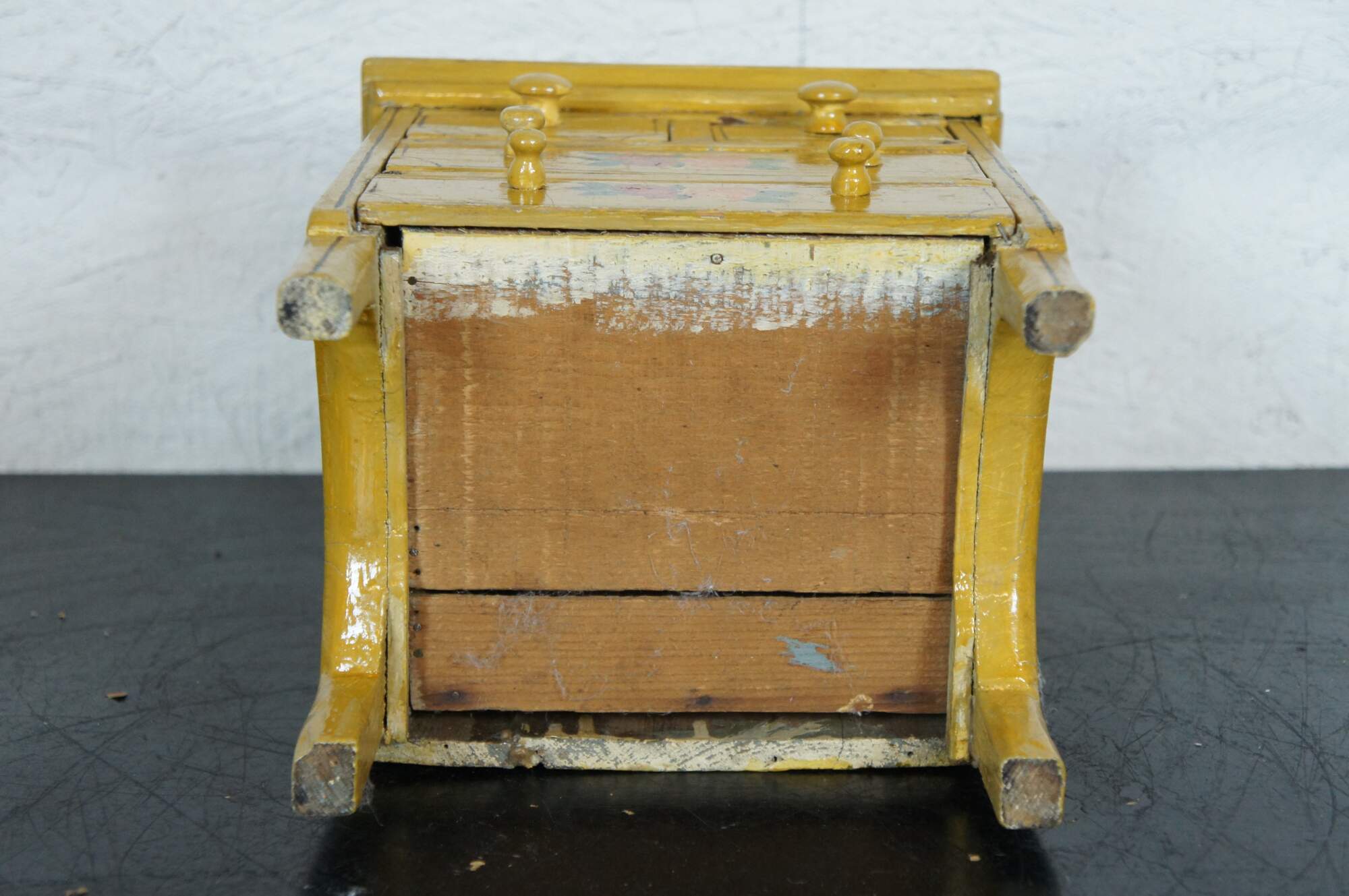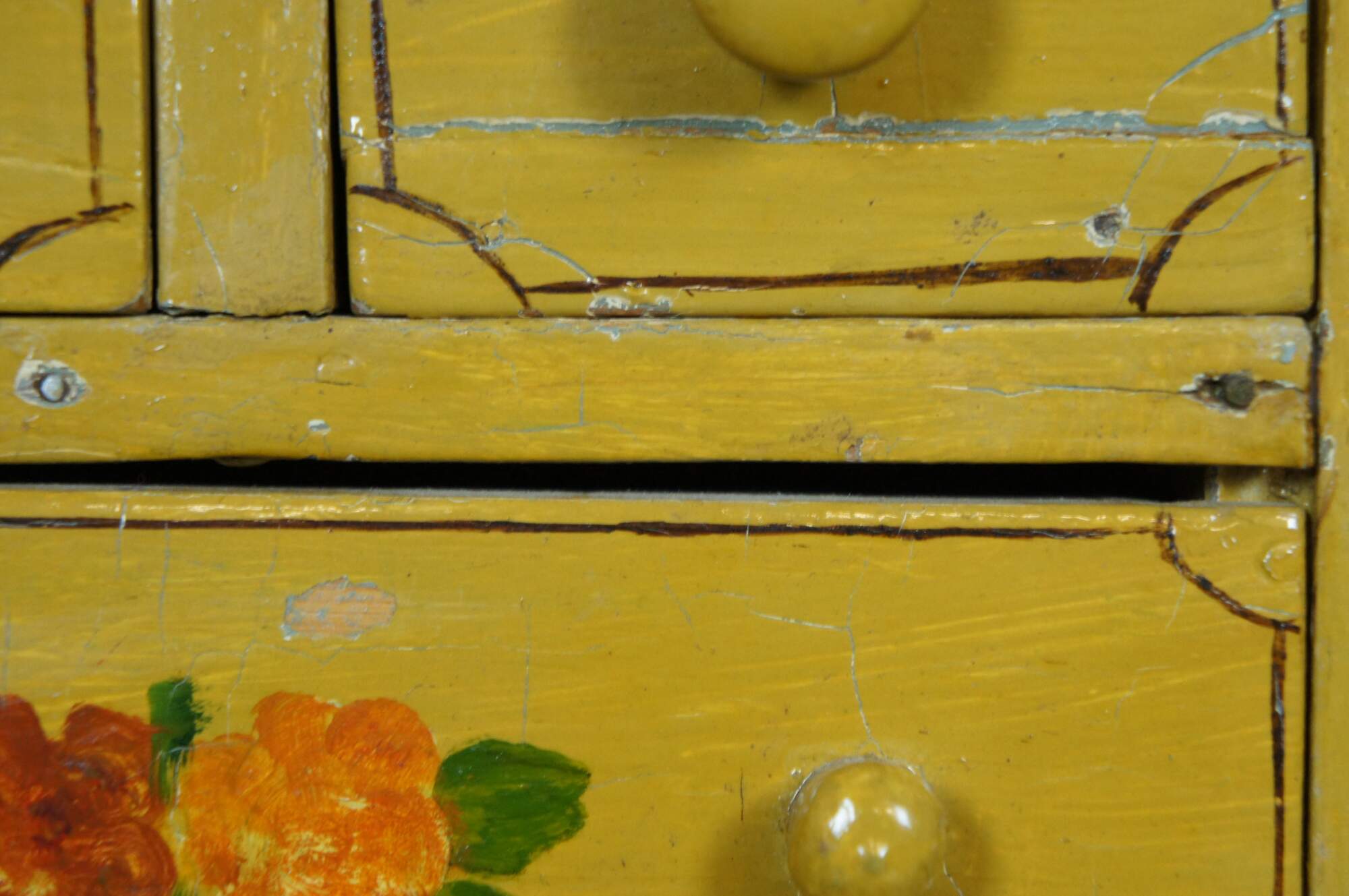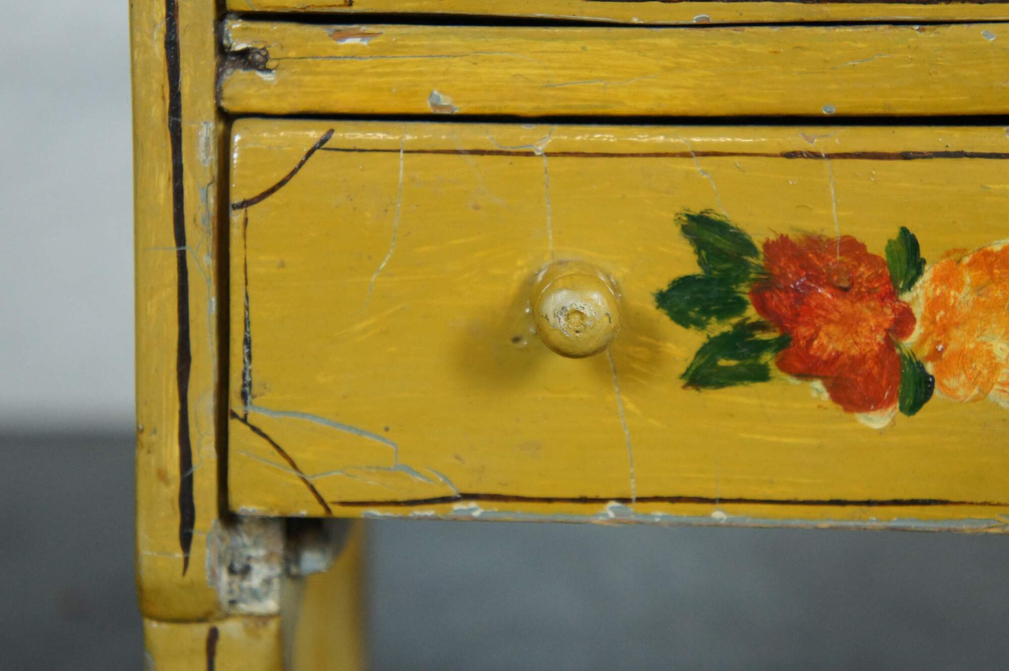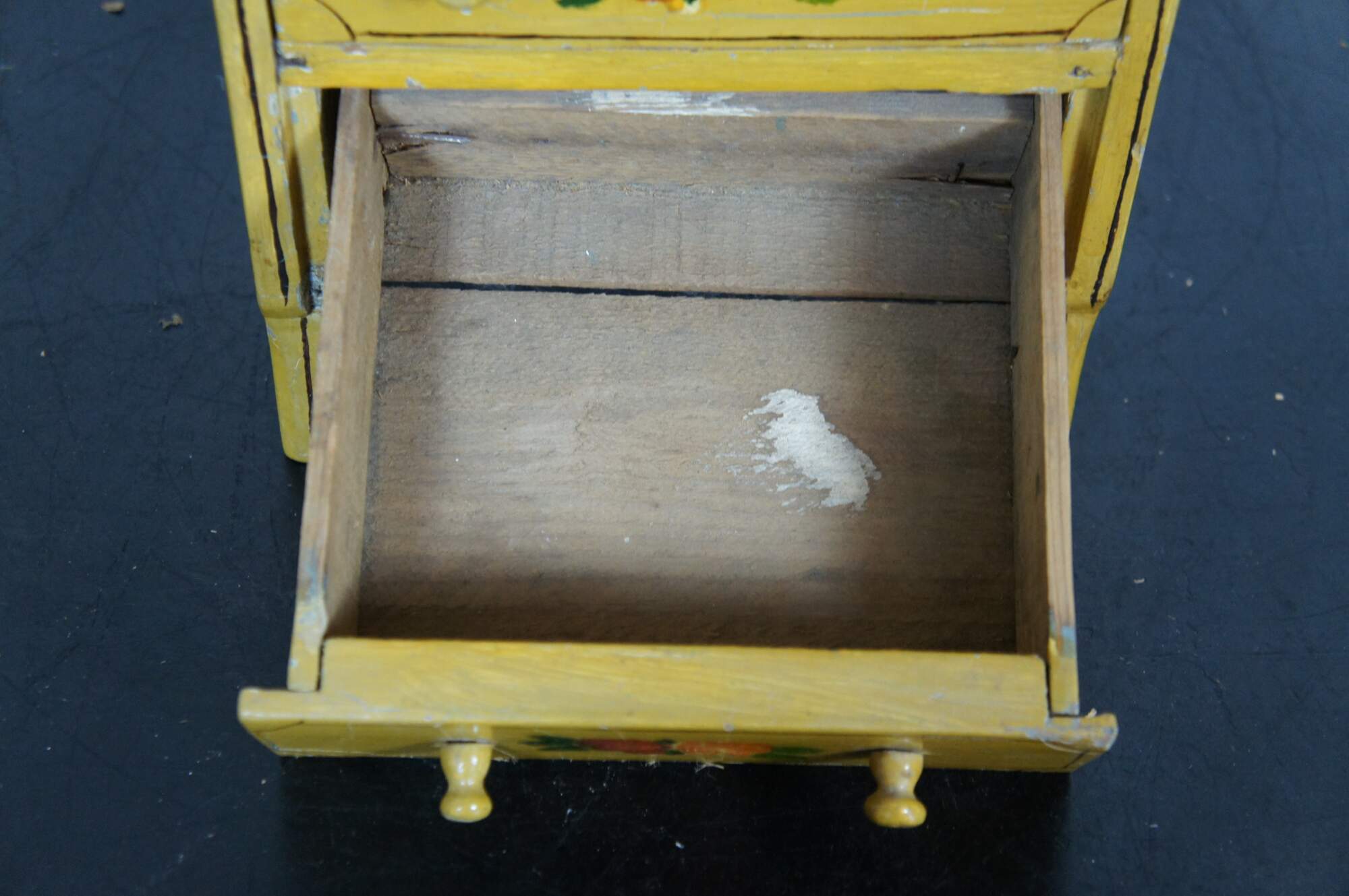 Antique miniature chest of four drawers, painted in yellow with brown details and red and orange folk art style flowers.