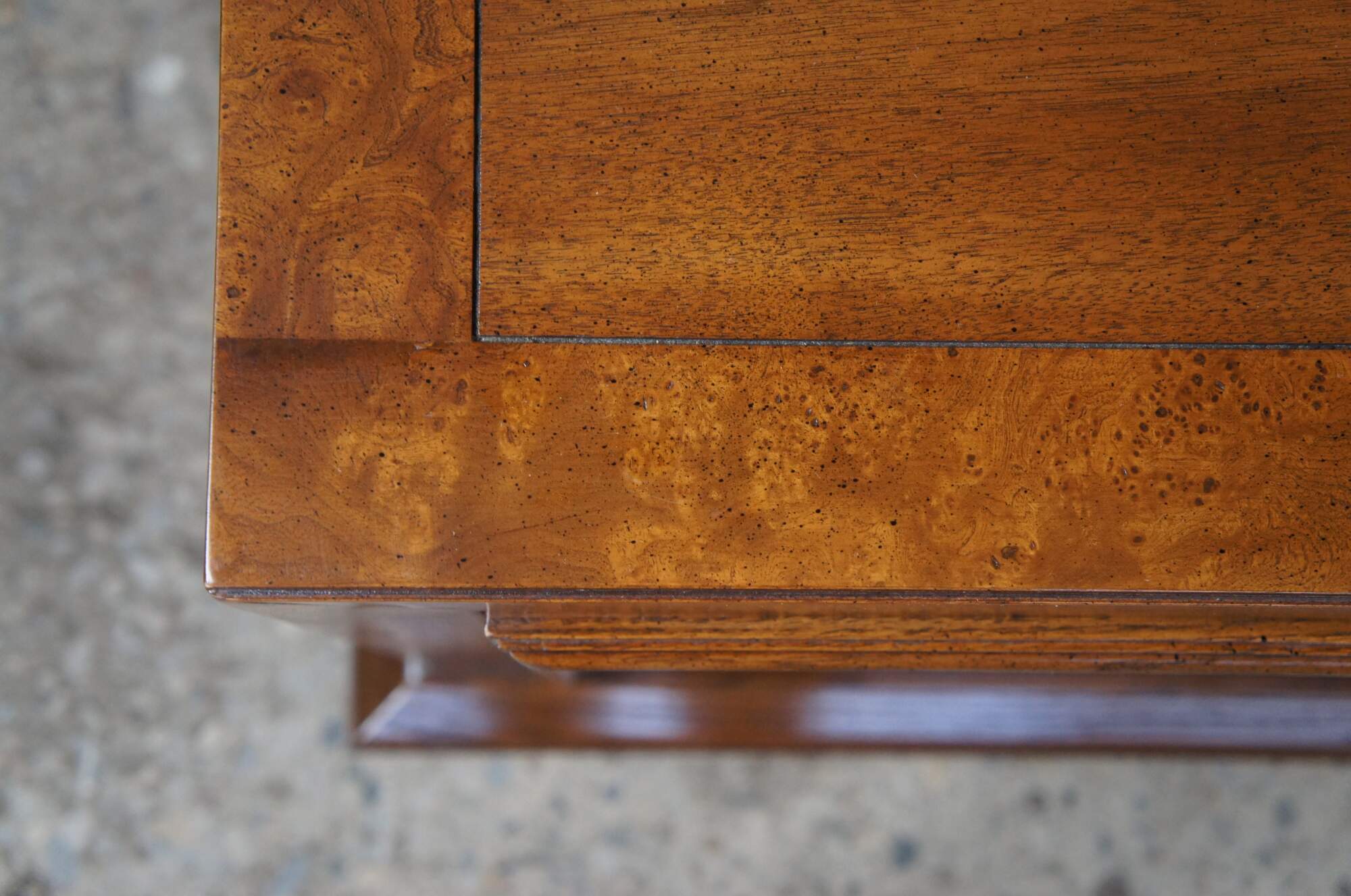 Vintage Italian Provincial console or credenza by Fancher Furniture, cica 1970s. A rectangular form made from walnut with burled accents. Features four acanthus carved doors that open to three dovetailed drawers along the left and storage to the right