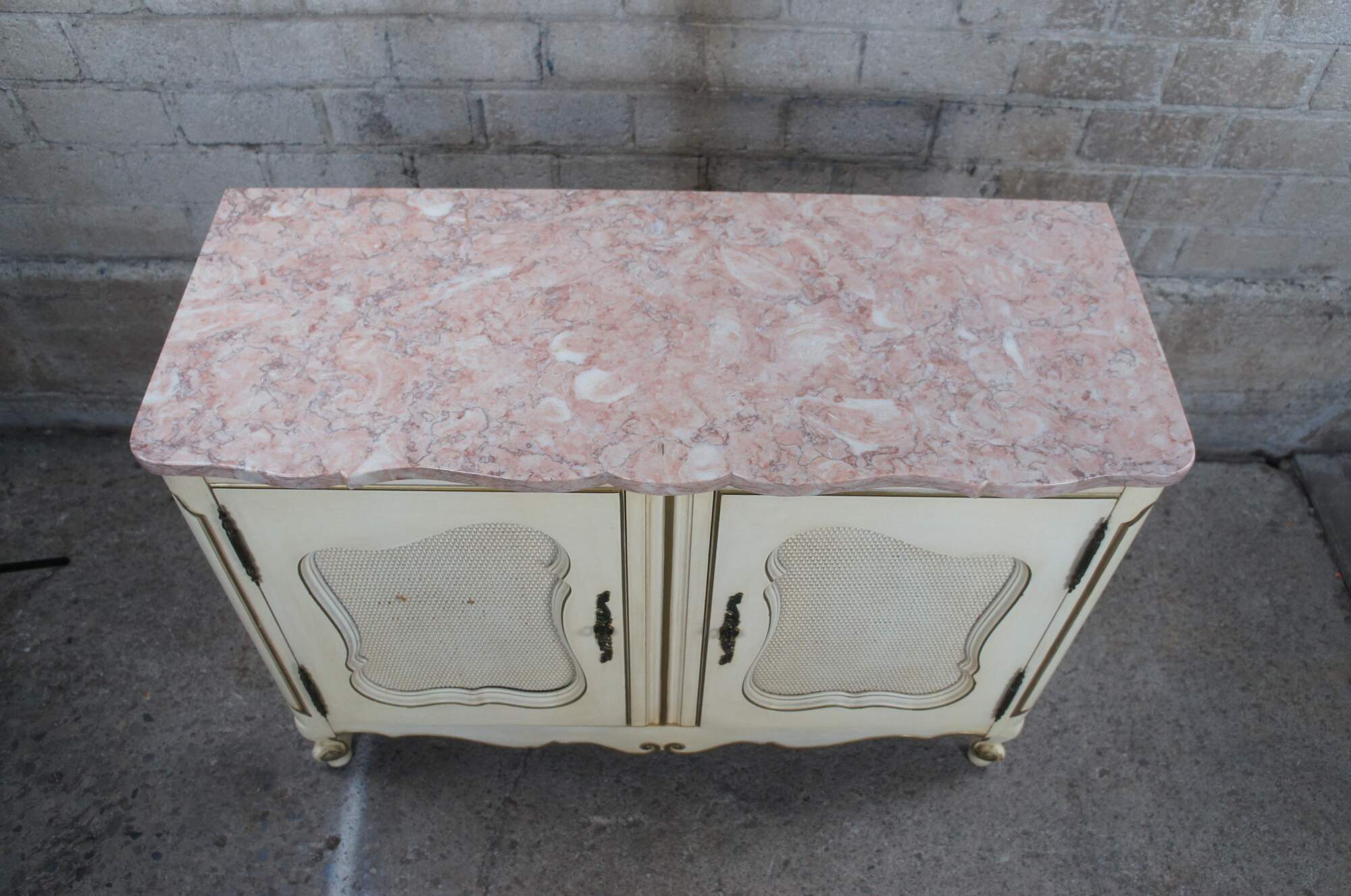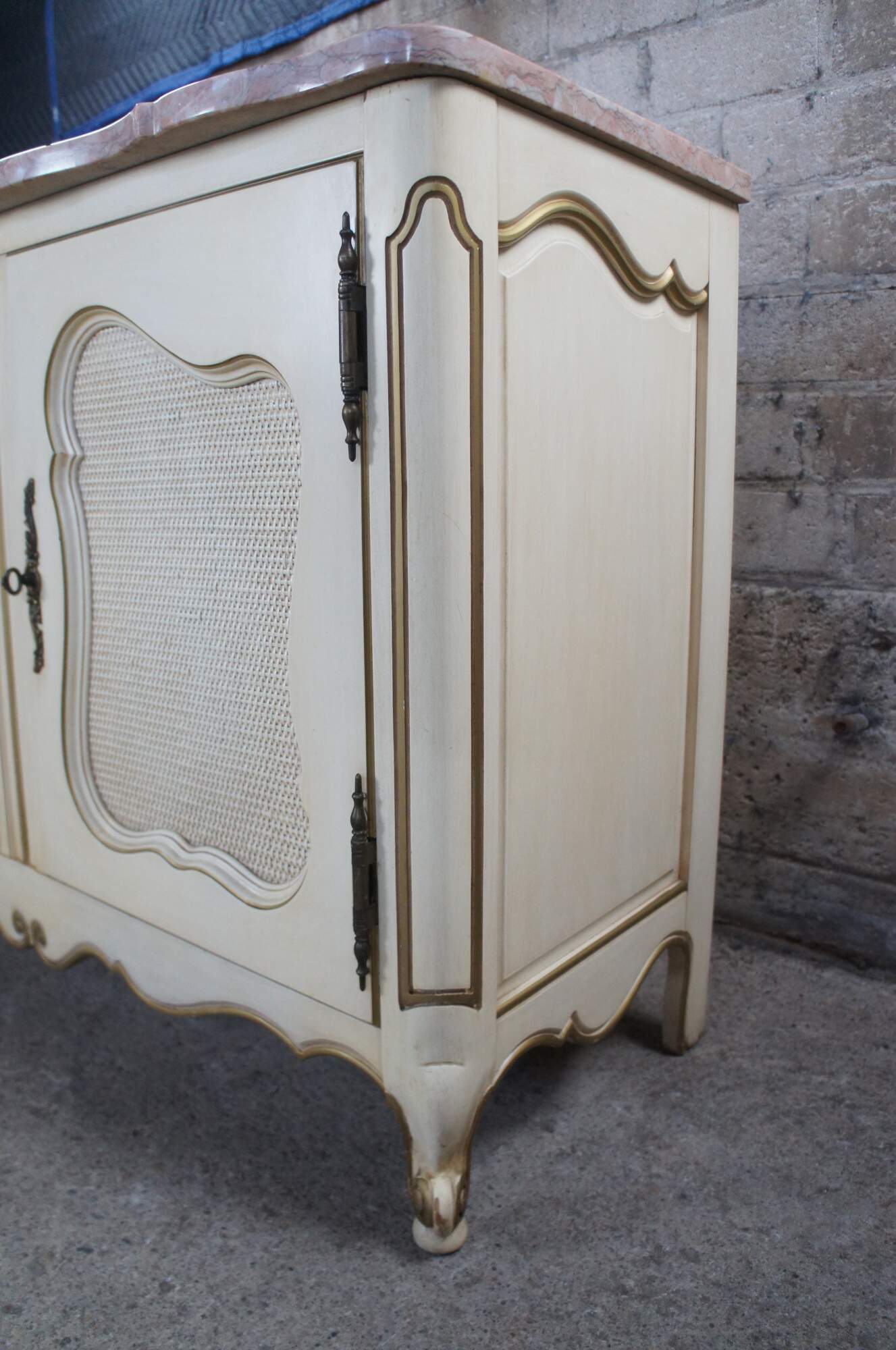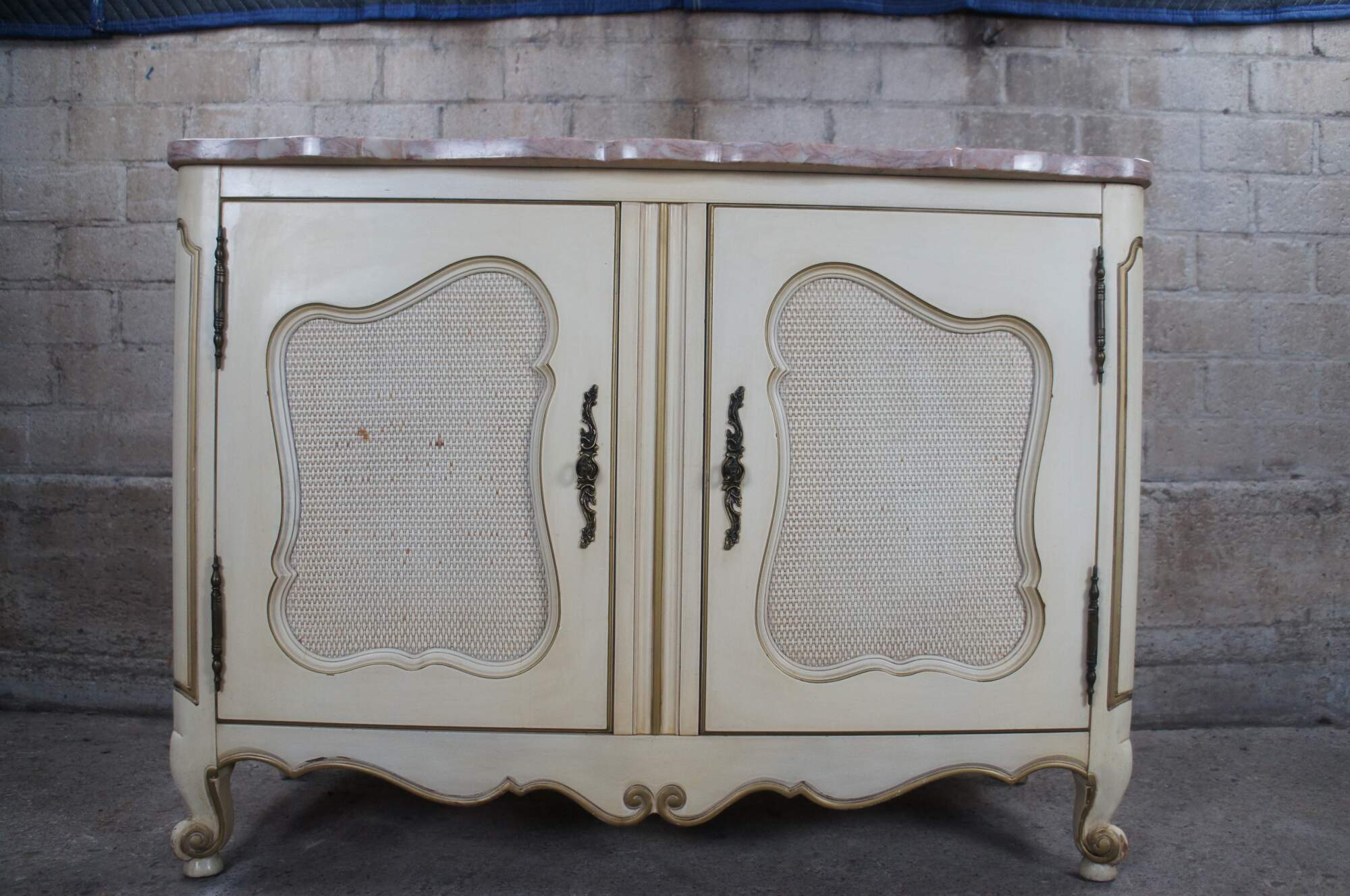 French Provincial Console or Cabinet, circa 1959. Features a serpentine pink marble top over rectangular base of two doors with inset rattan backing and cabriole scrolled feet. The cabinet is enhanced by shapely molding trimmed in gold and scrolling lower aprons. Opens to one interior shelf.
