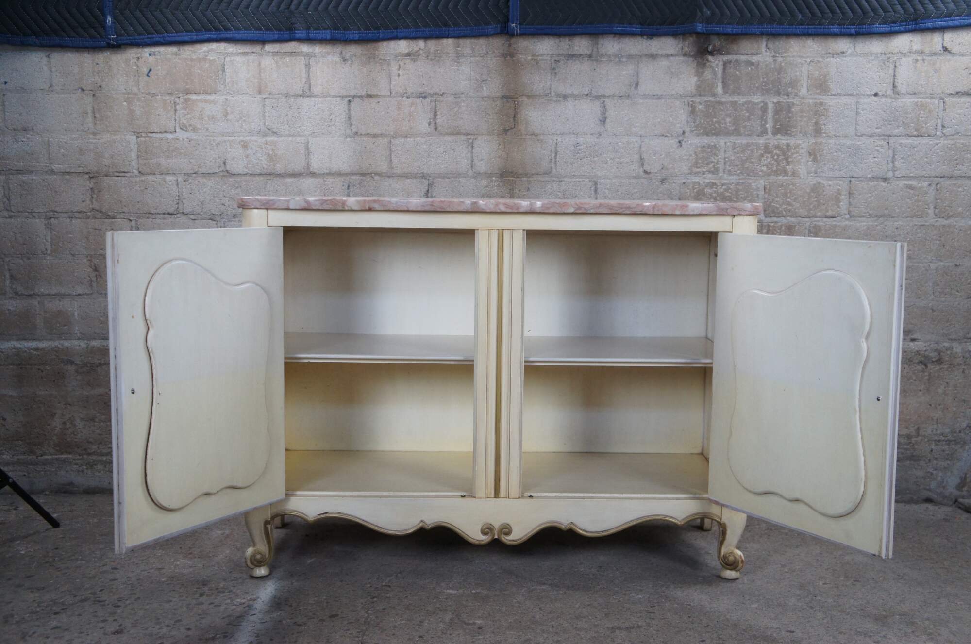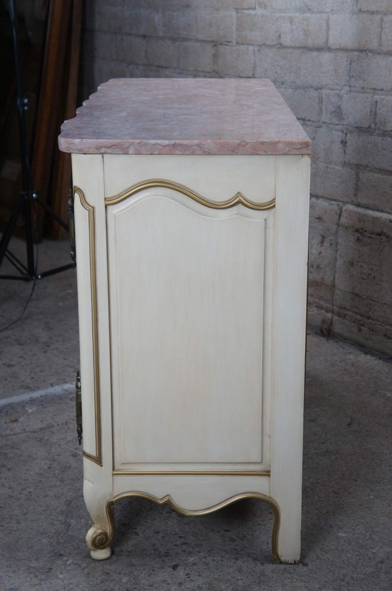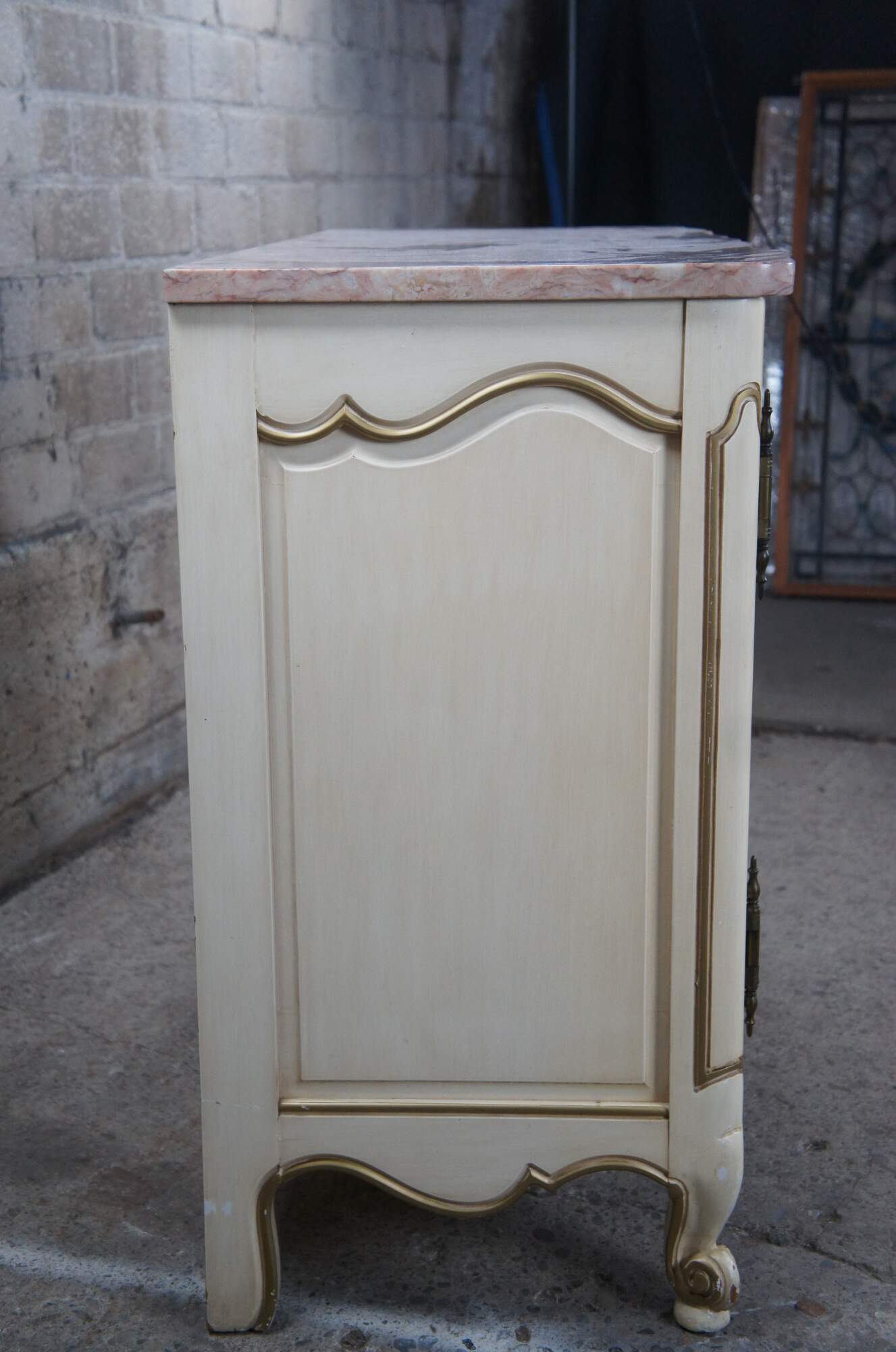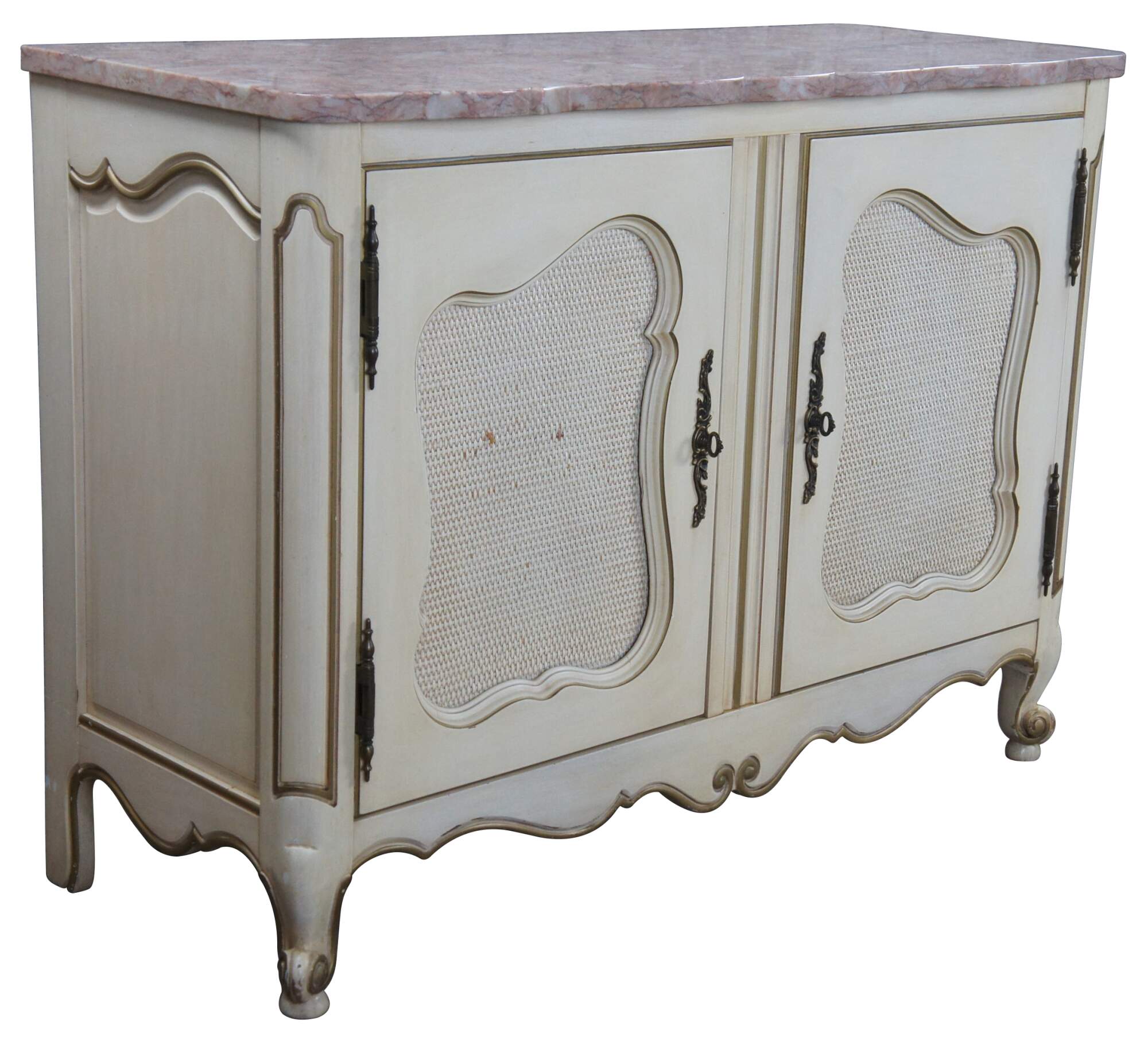 French Provincial Console or Cabinet, circa 1959. Features a serpentine pink marble top over rectangular base of two doors with inset rattan backing and cabriole scrolled feet. The cabinet is enhanced by shapely molding trimmed in gold and scrolling lower aprons. Opens to one interior shelf.