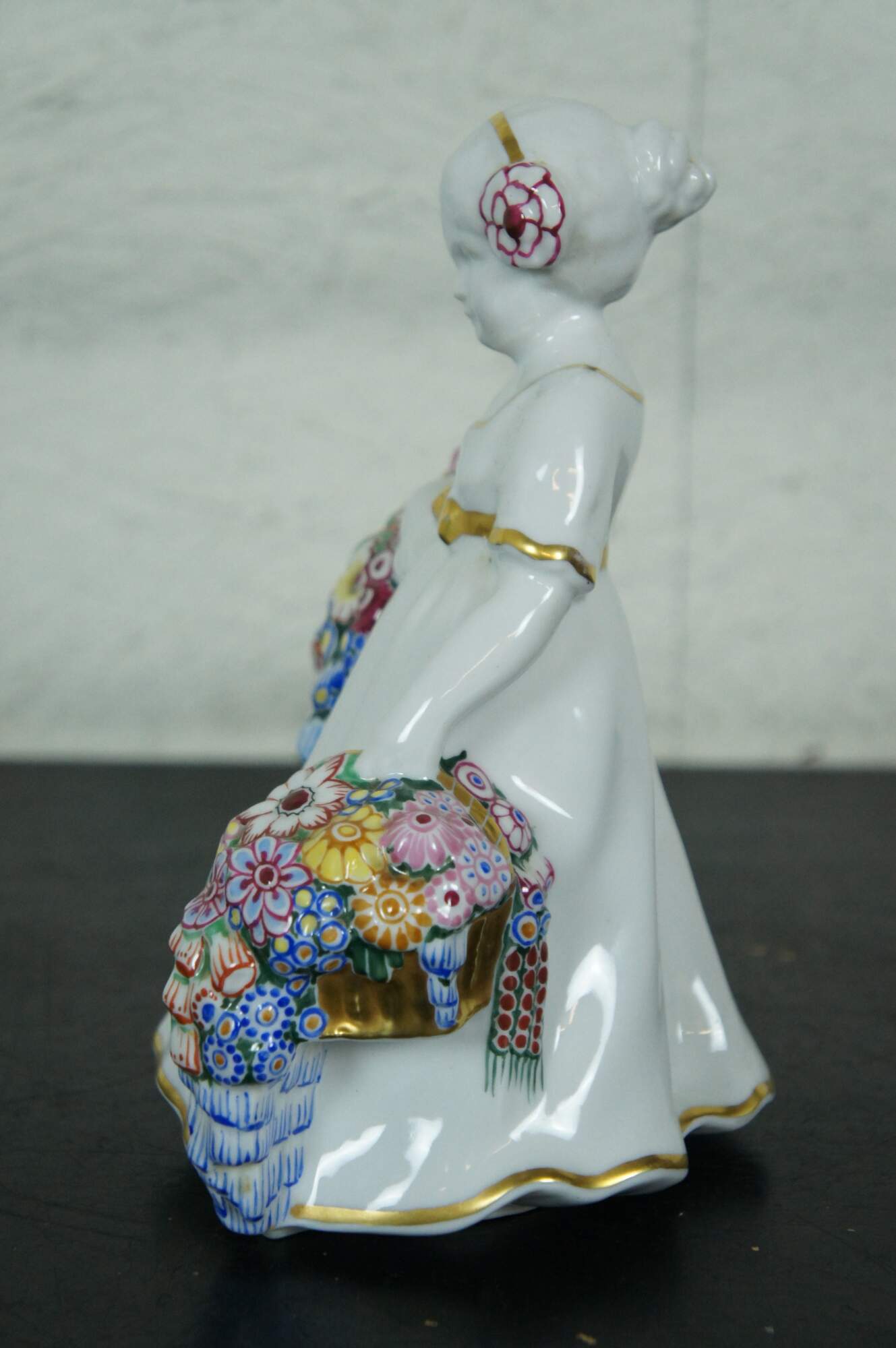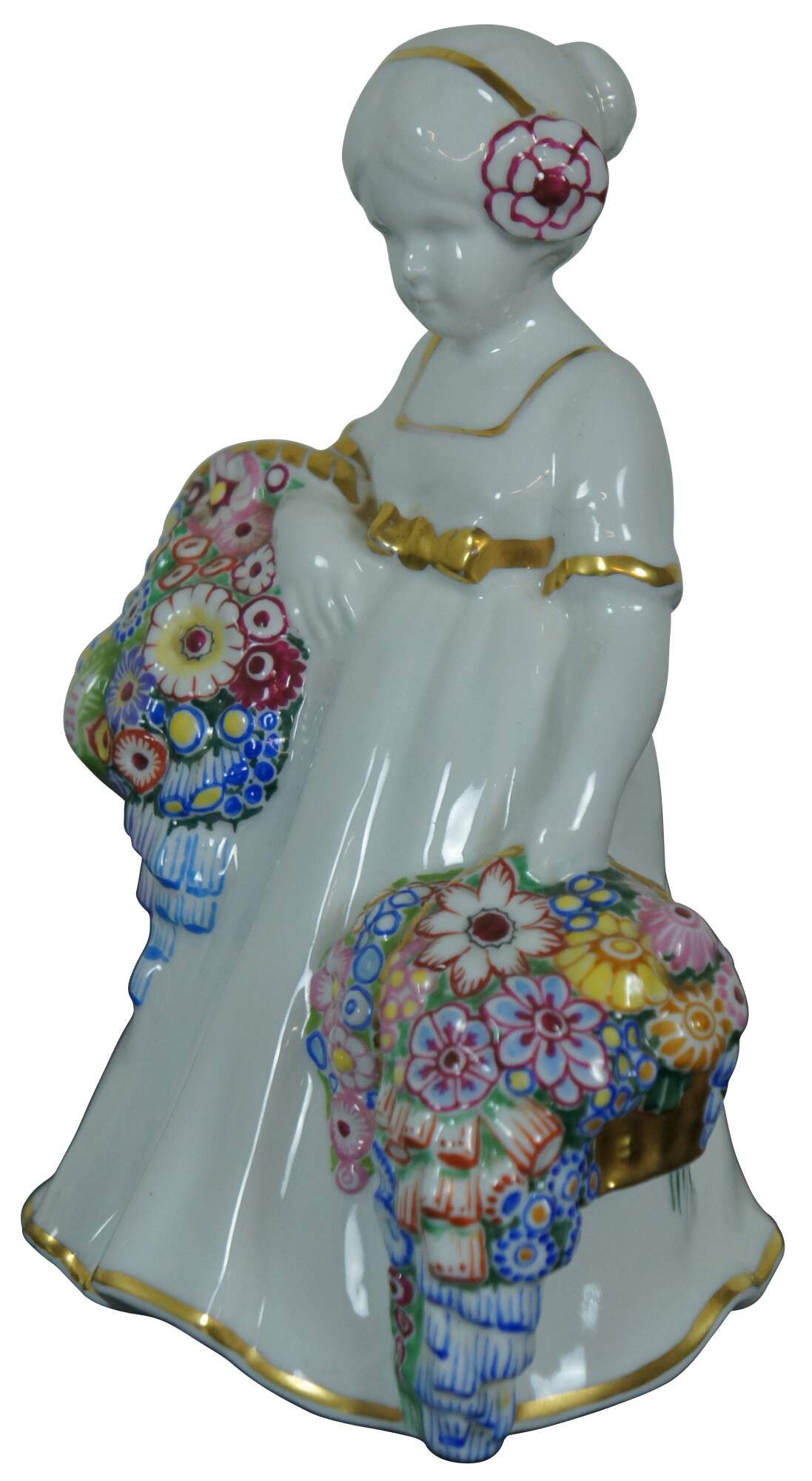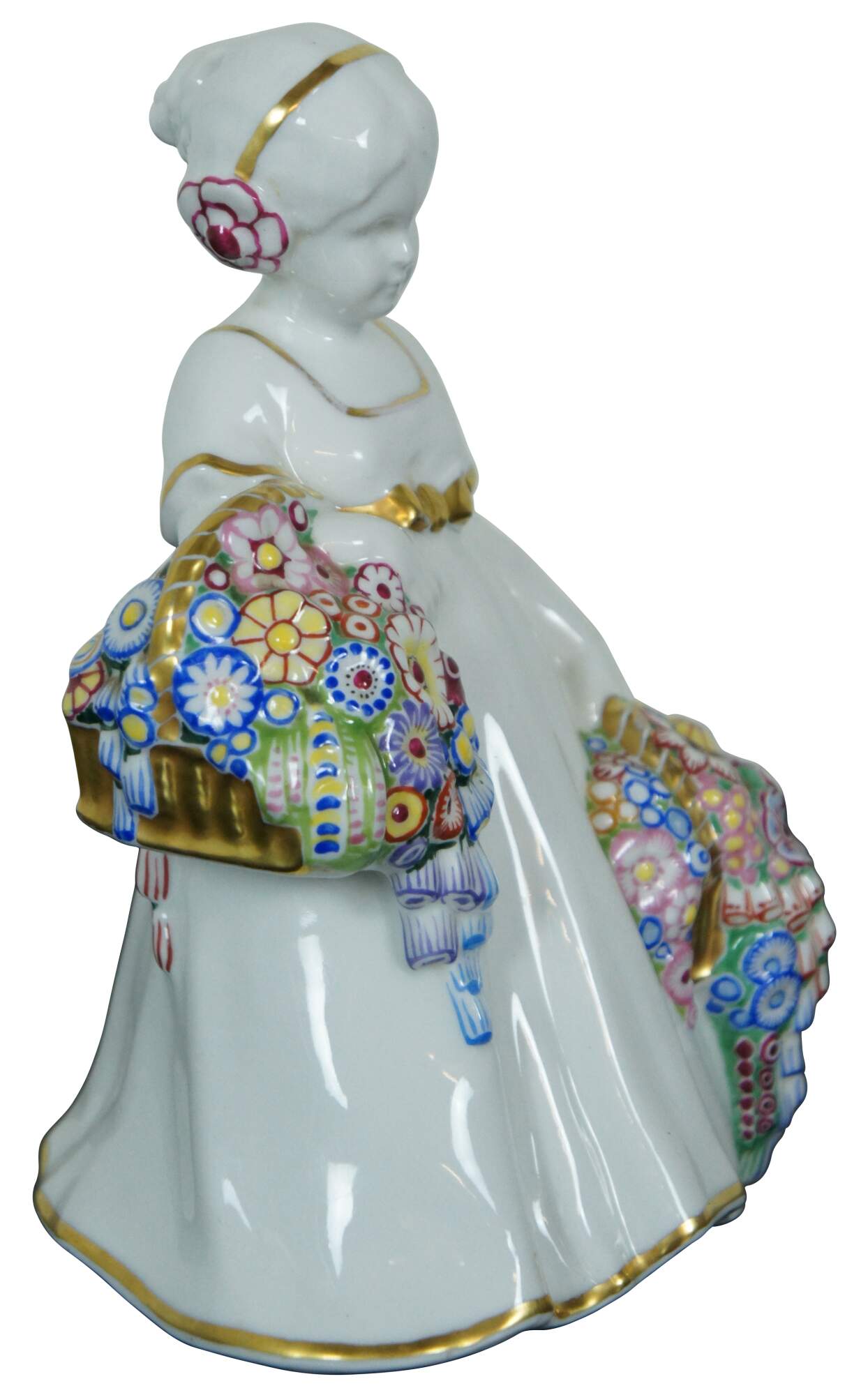 Rare antique circa 1910-1923 painted and gilded porcelain figurine titled Blumenmädchen or Flower Girl by Pirkenhammer Kunst-Abteilung of Czecholslovaki (Bohemia). Marked Prof. W Gerstner and EFI, E. (Epiag) F. I. Mädchen mit Blumenkörben, Entwurf Prof. Wilhelm Gerstner, Fischer & Mieg, Pirkenhammer.