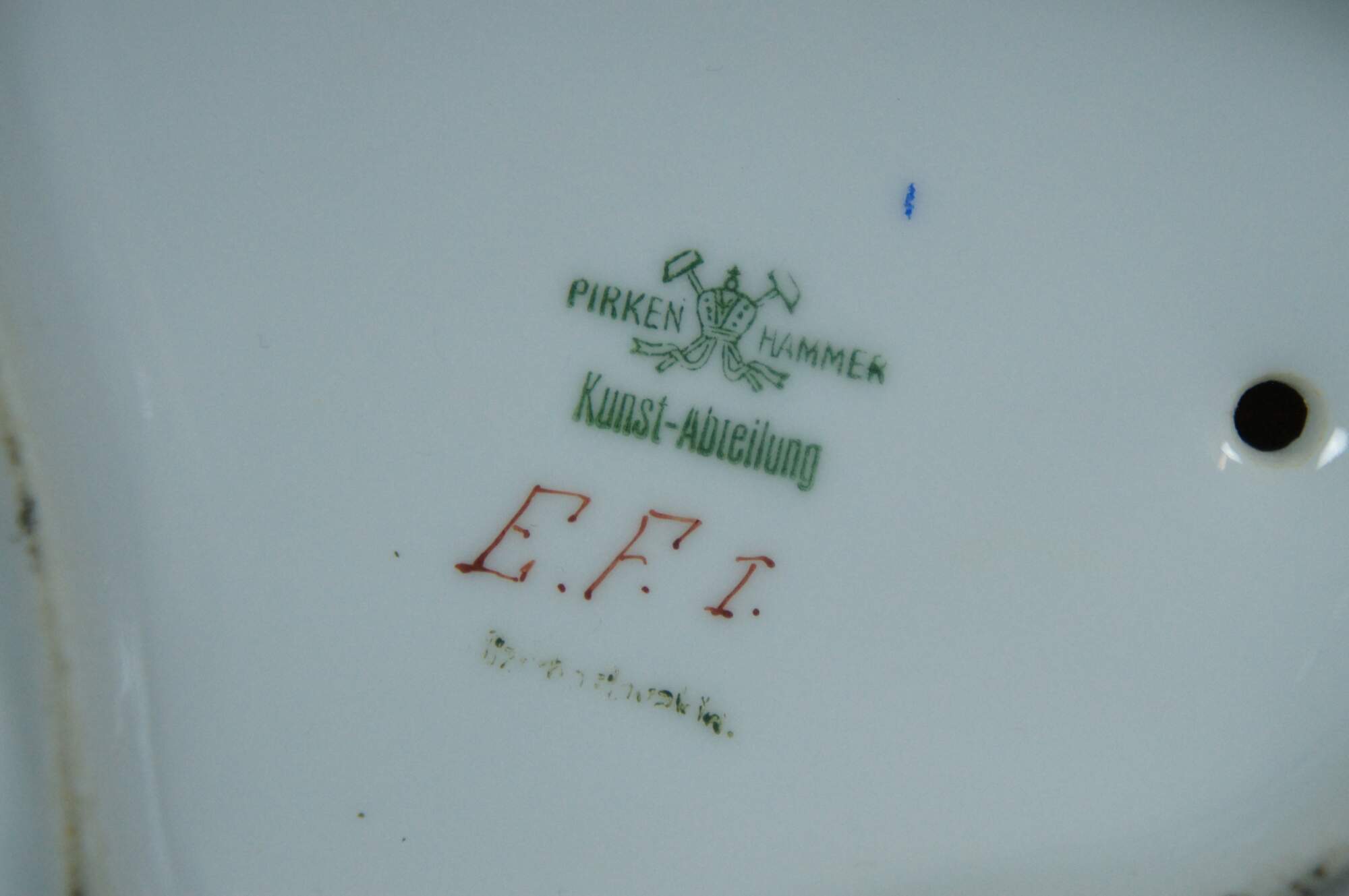""Pirkenhammer is a porcelain manufactory started in 1803 by Friedrich Holke and Johann Gotlob List. The mark of the crossed hammers is the Pirkenhammer symbol.