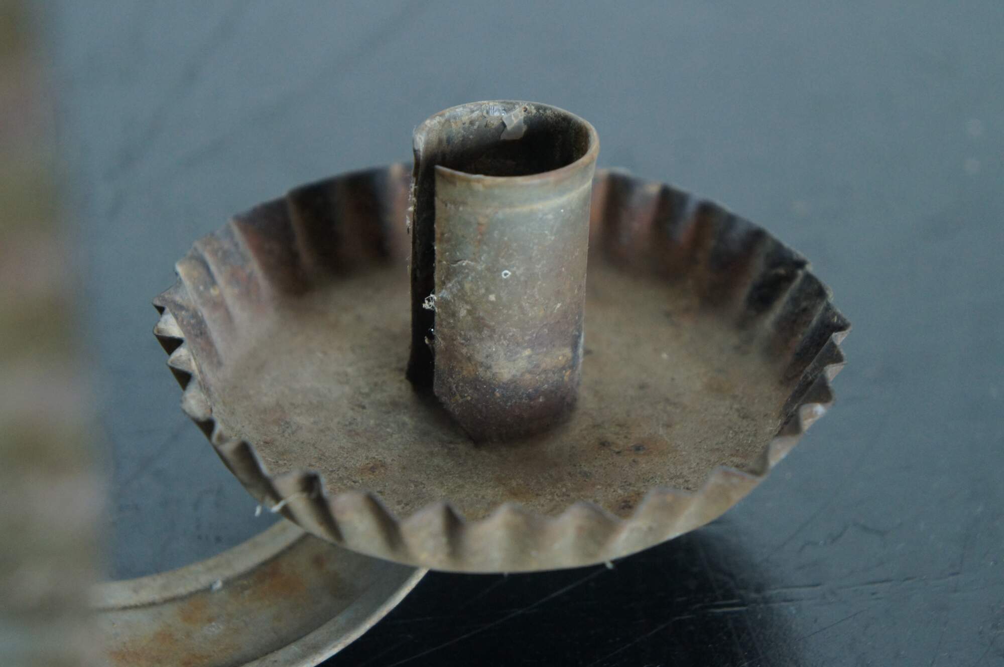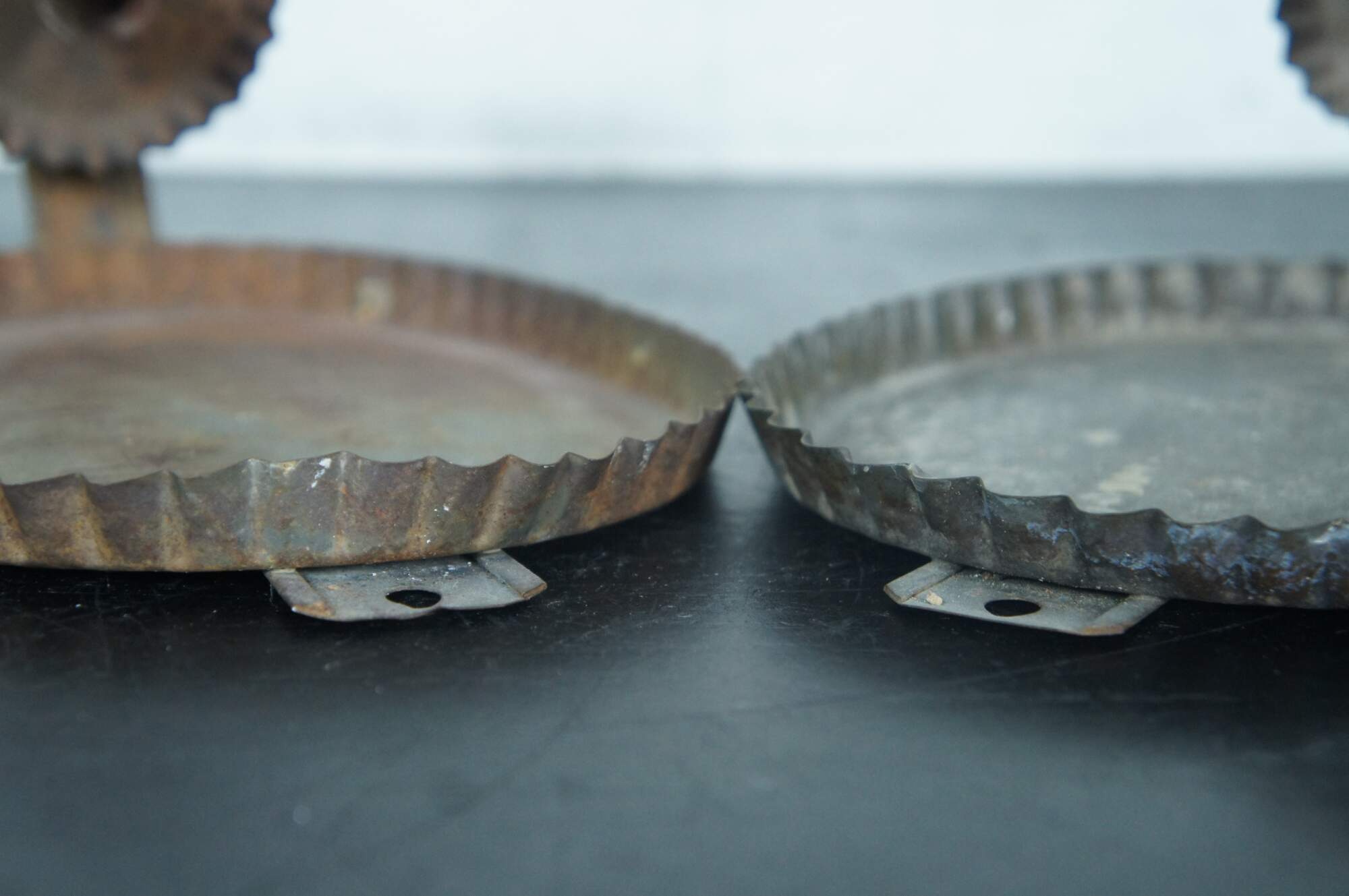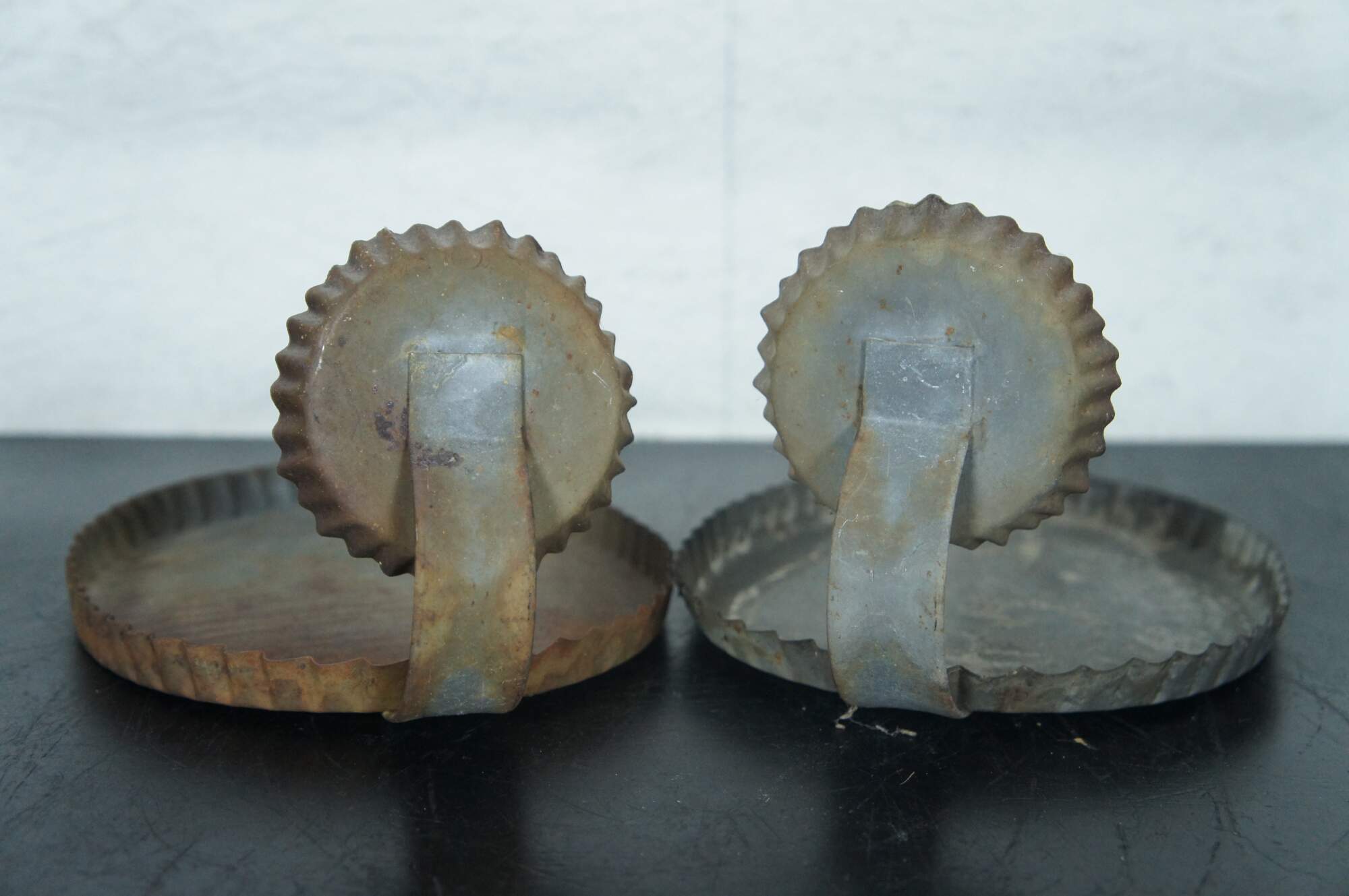 Pair of antique tin wall sconces with candle holder and drip pan. Each is neatly designed with a pie crust crimped edge.