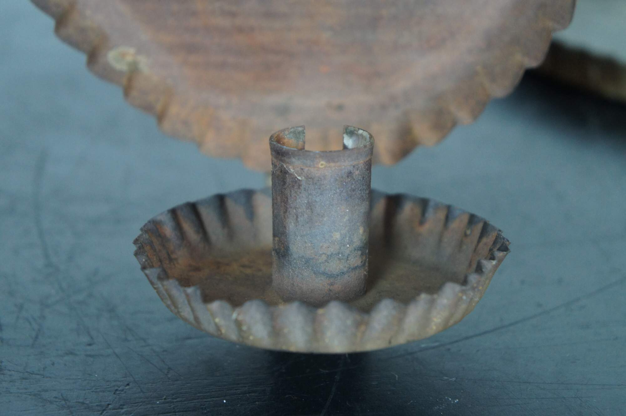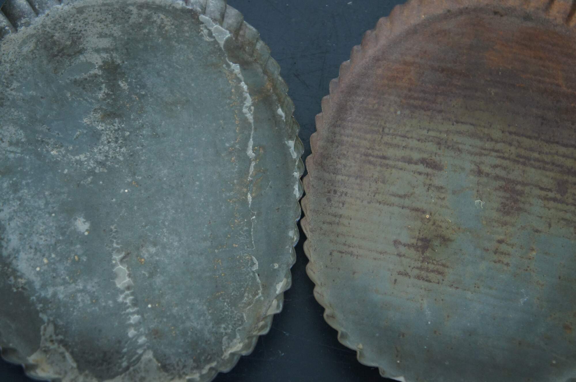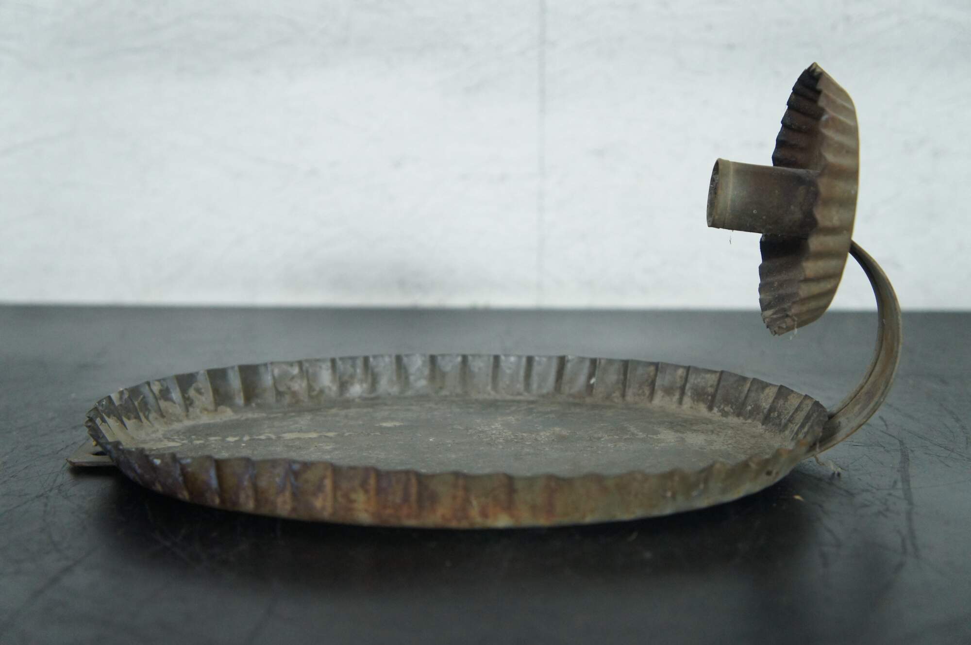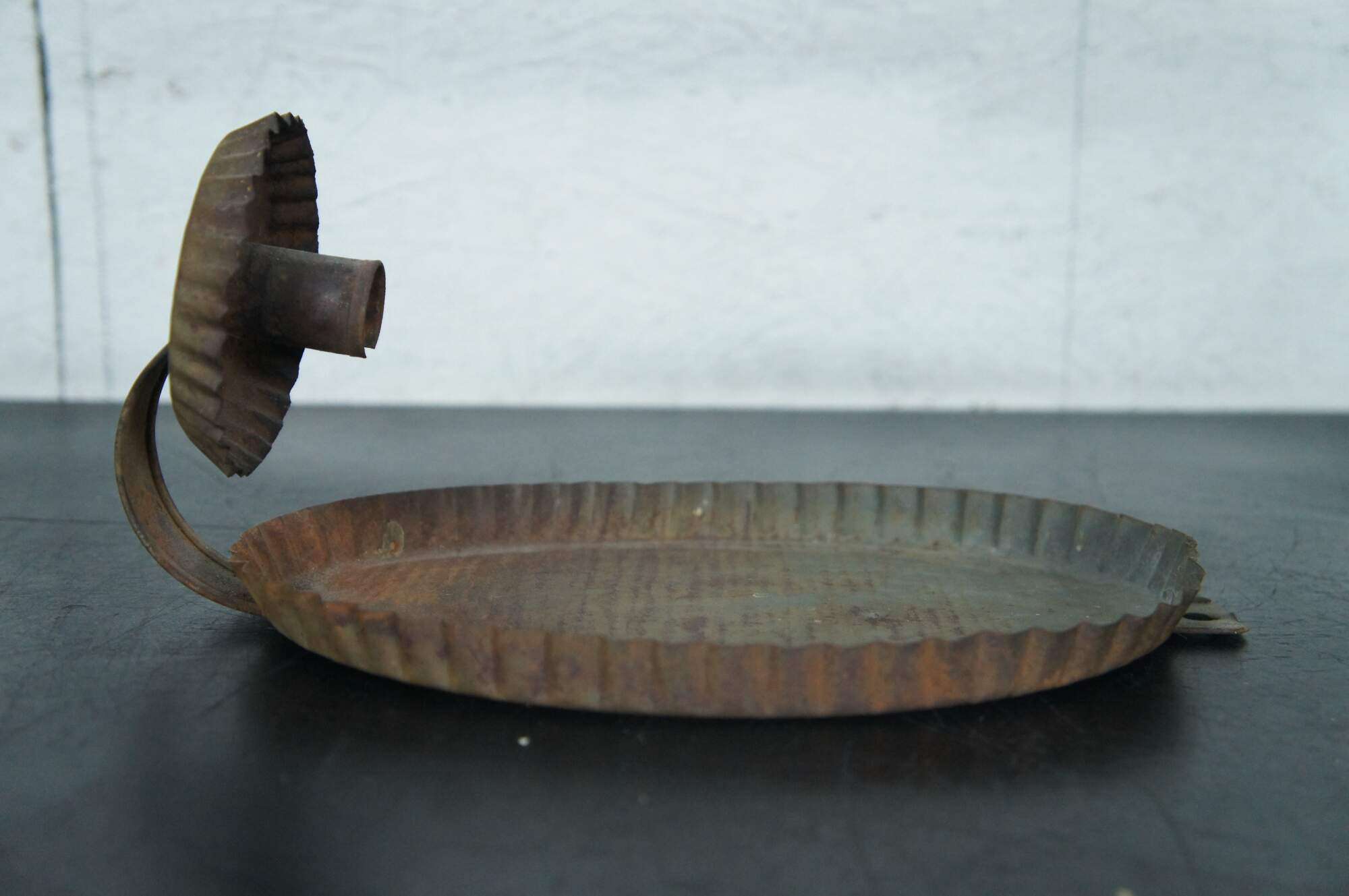 Pair of antique tin wall sconces with candle holder and drip pan. Each is neatly designed with a pie crust crimped edge.