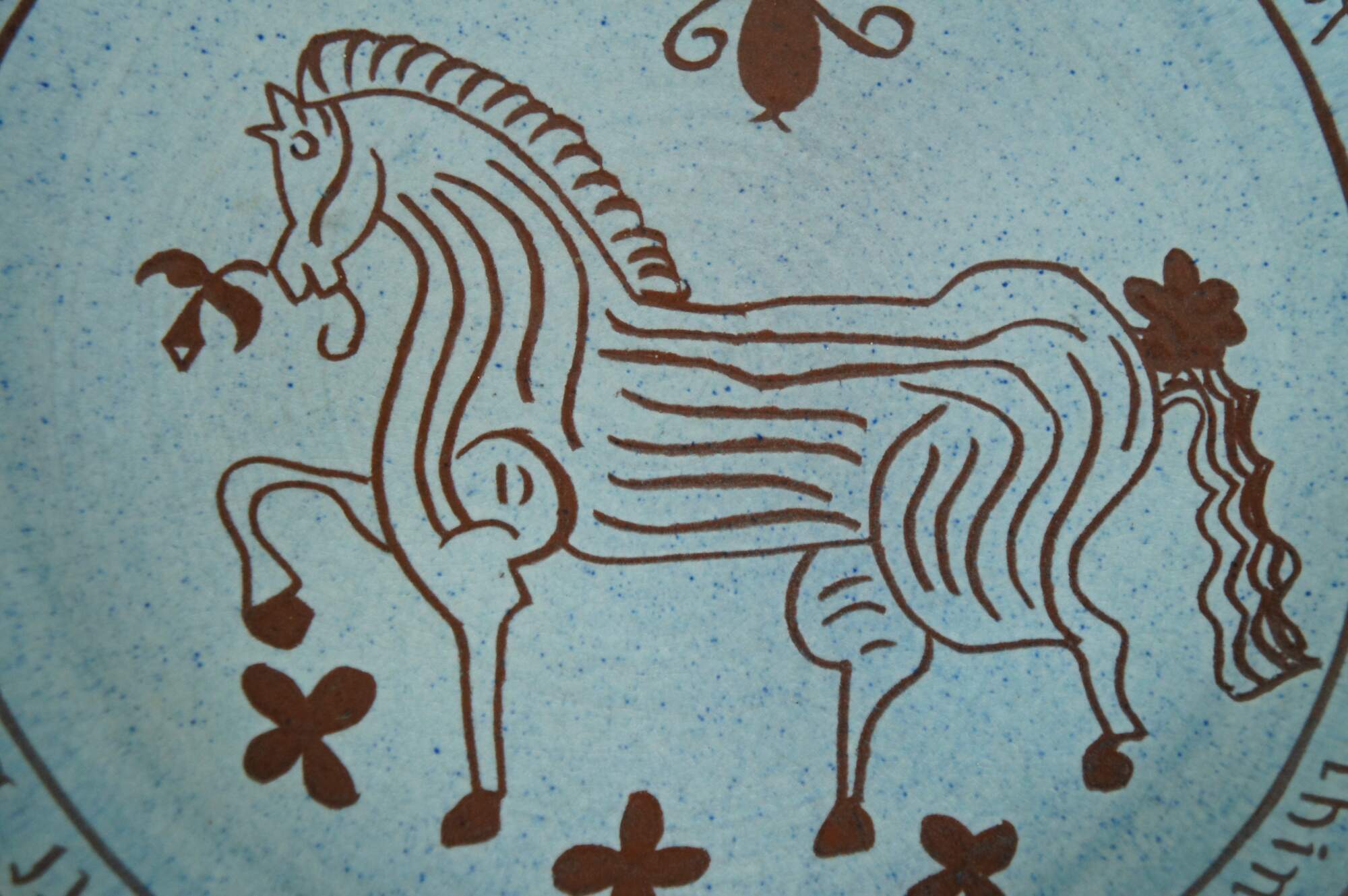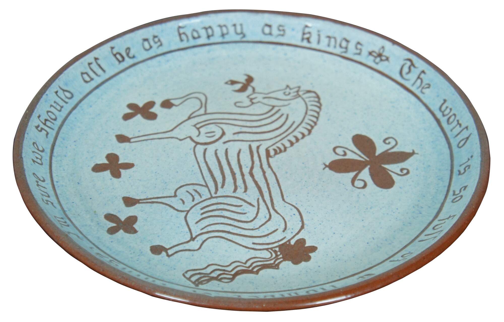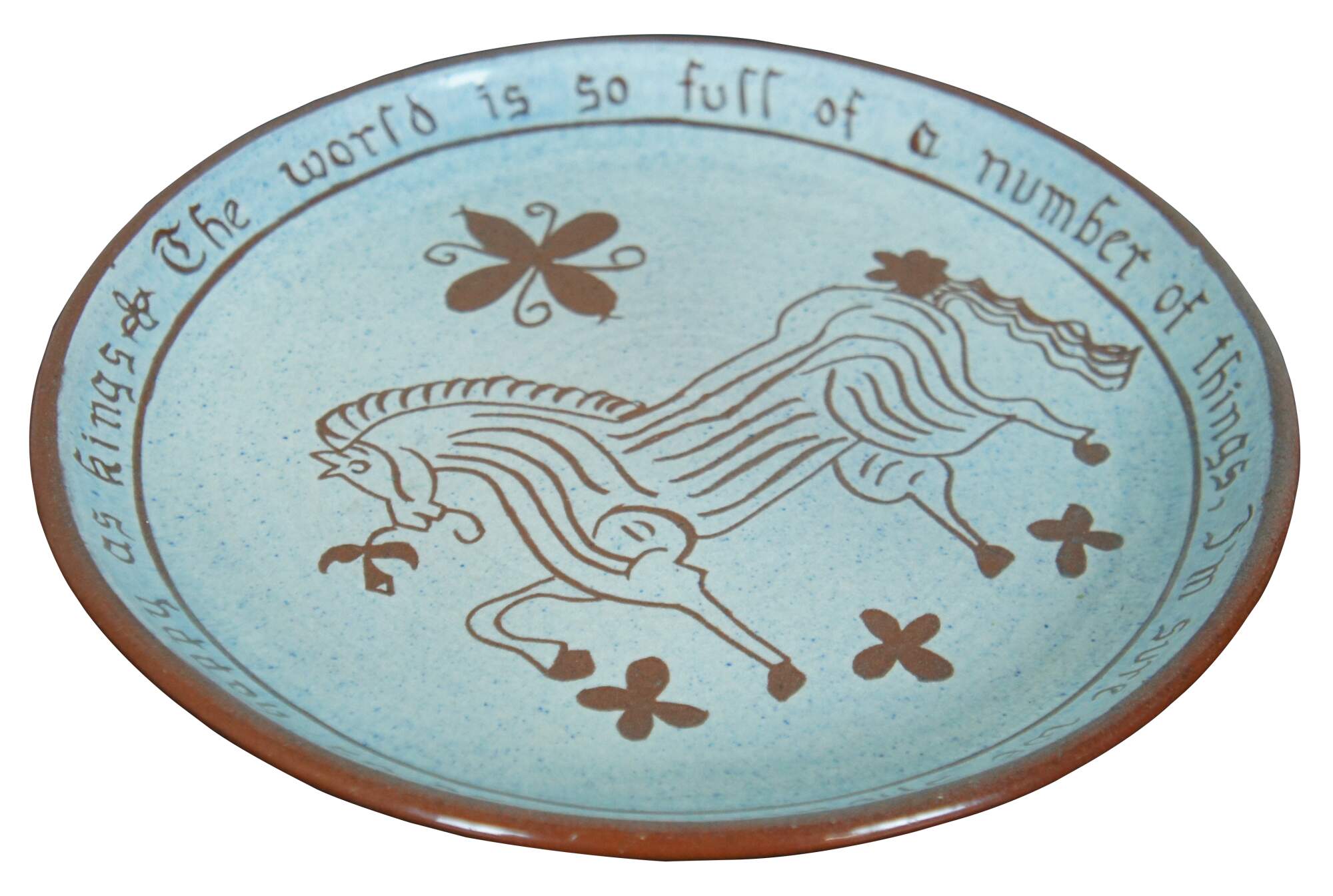 Vintage speckled blue glaze and red-brown earthenware folk art clay pottery plate showing a prancing horse surrounded by flowers and around the outer edge the quotation “The world is full of a number of things, I’m sure we should all be as happy as kings” from a Robert Louis Stevenson poem. Signed Suecuppage on the back.