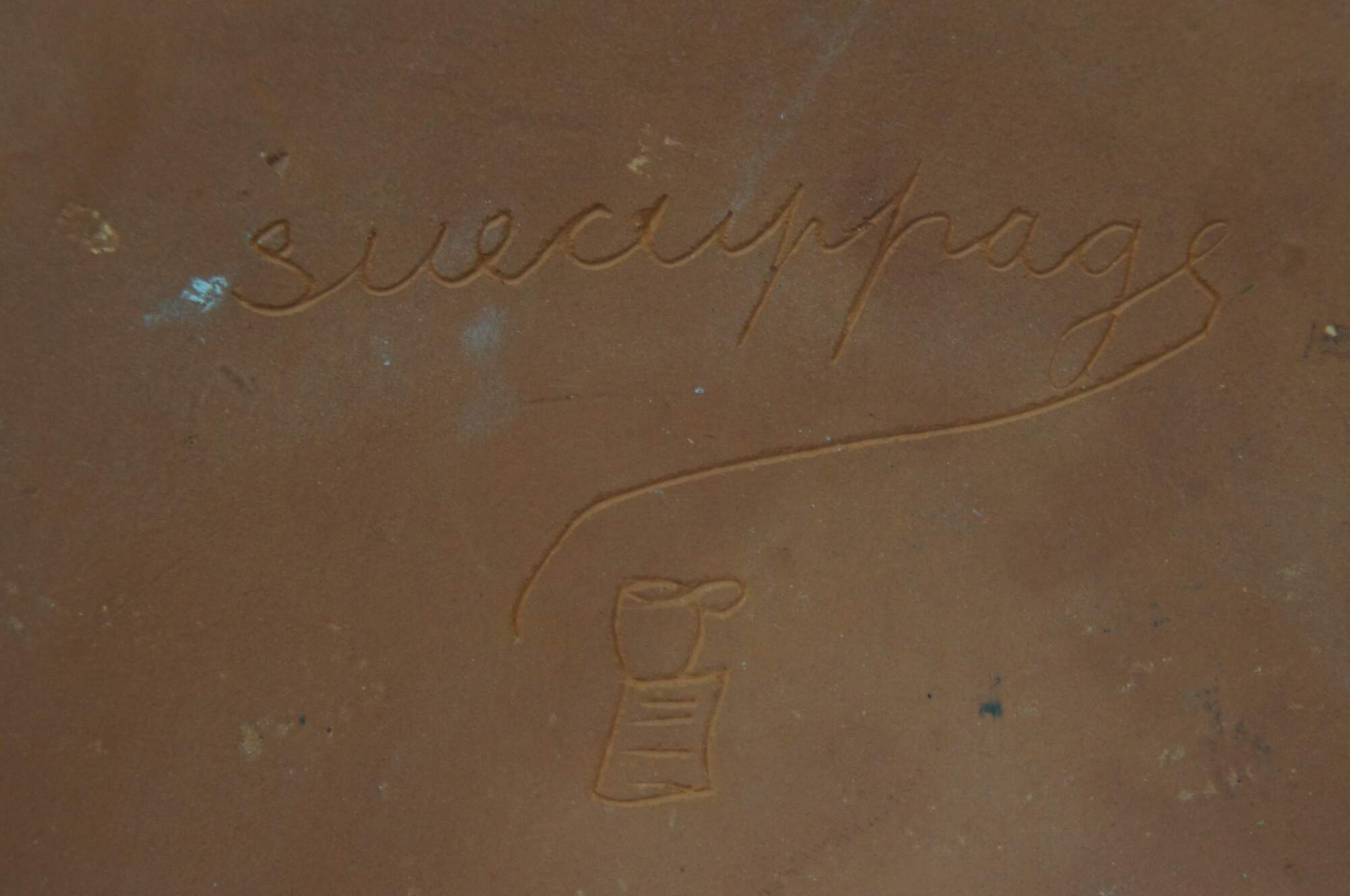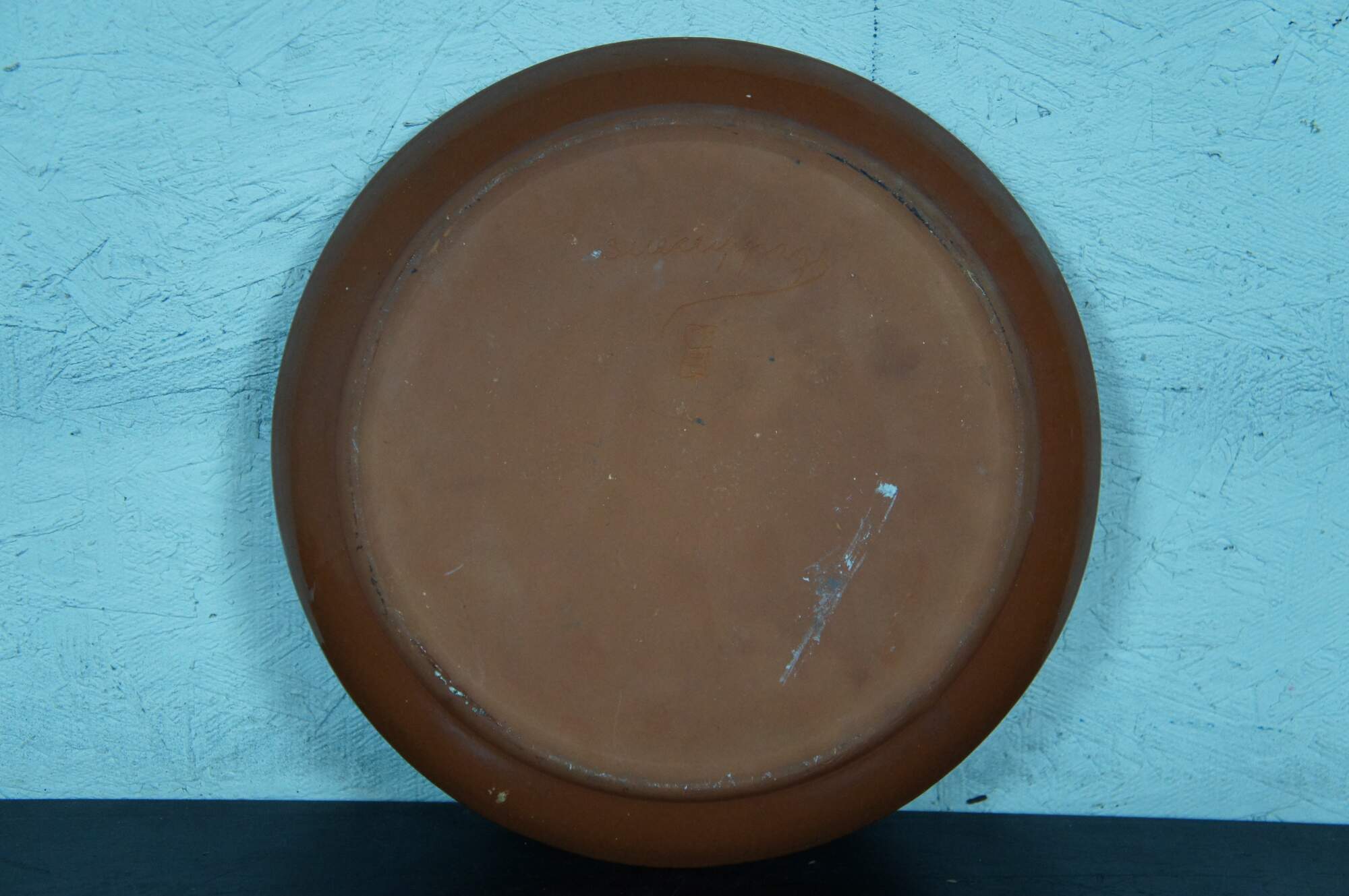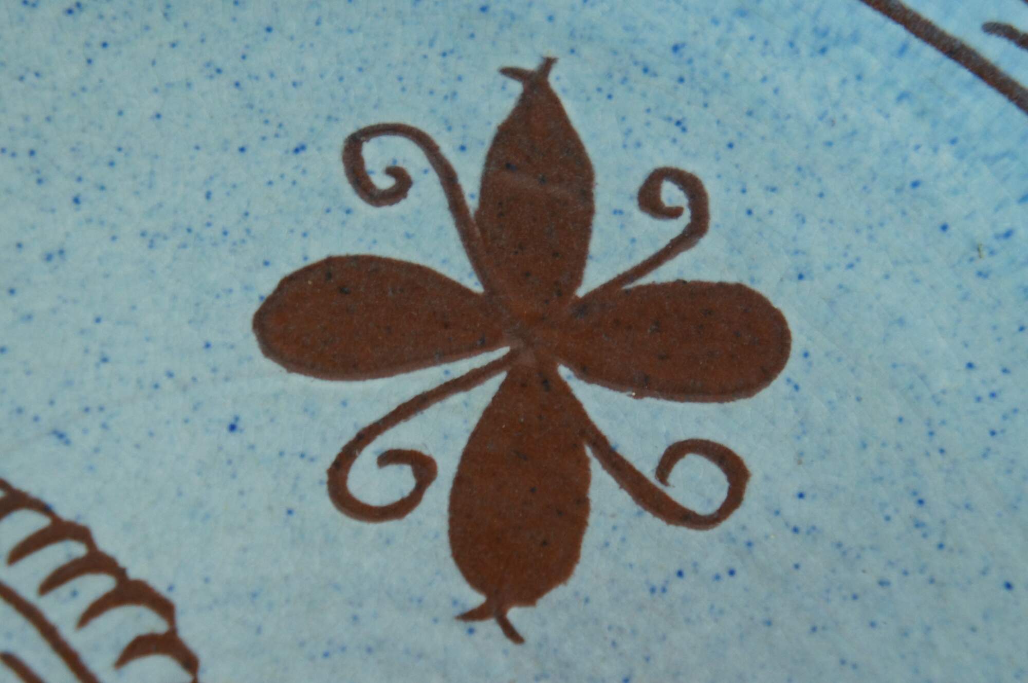 Vintage speckled blue glaze and red-brown earthenware folk art clay pottery plate showing a prancing horse surrounded by flowers and around the outer edge the quotation “The world is full of a number of things, I’m sure we should all be as happy as kings” from a Robert Louis Stevenson poem. Signed Suecuppage on the back.