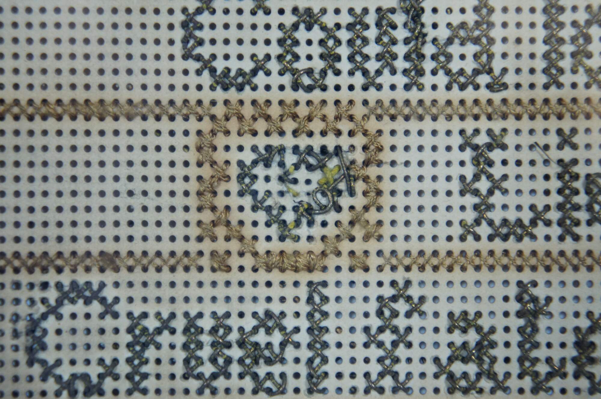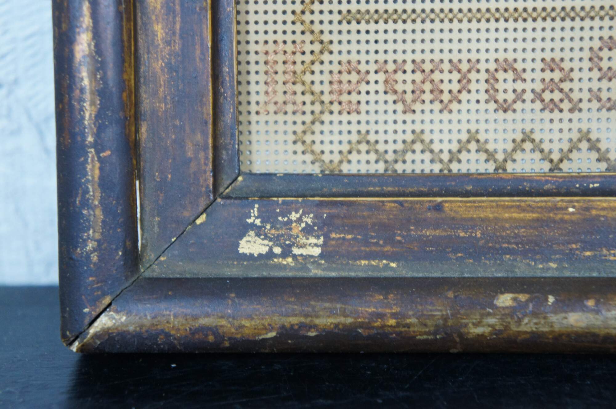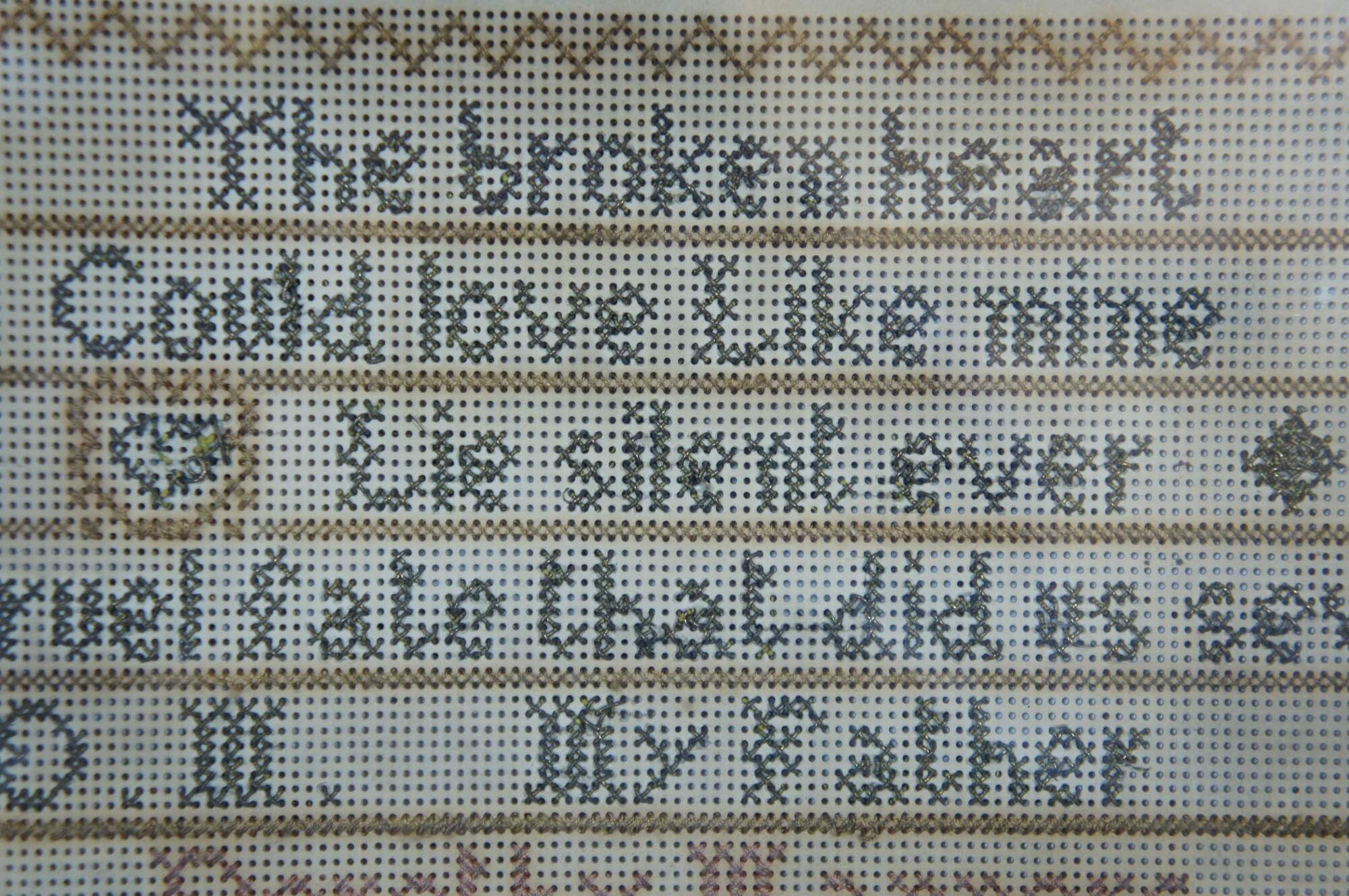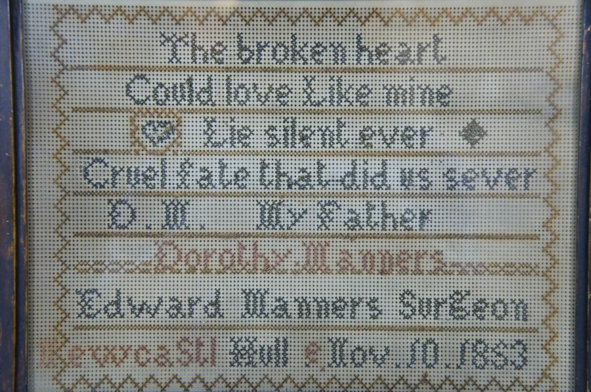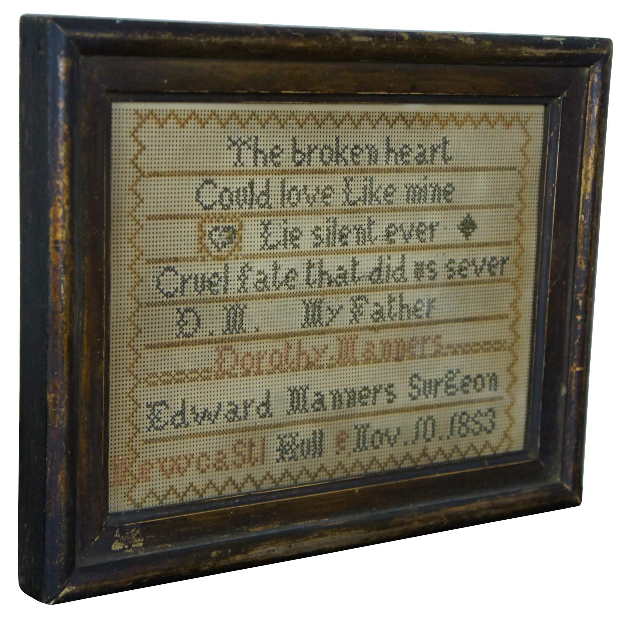 Antique 1850s cross stitch sampler by Dorothy Manners, memorializing what appears to be the death of her father in November 1853.