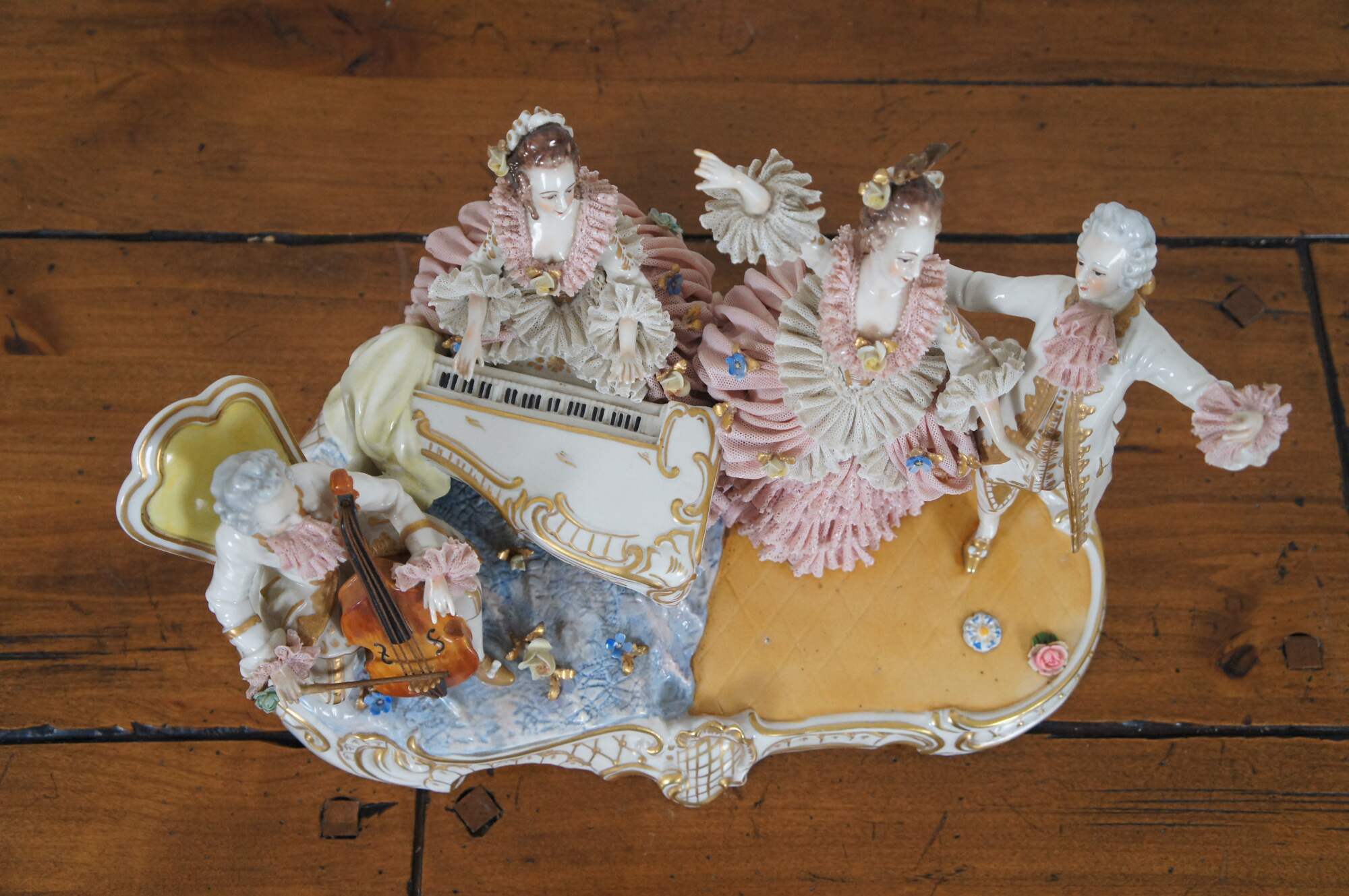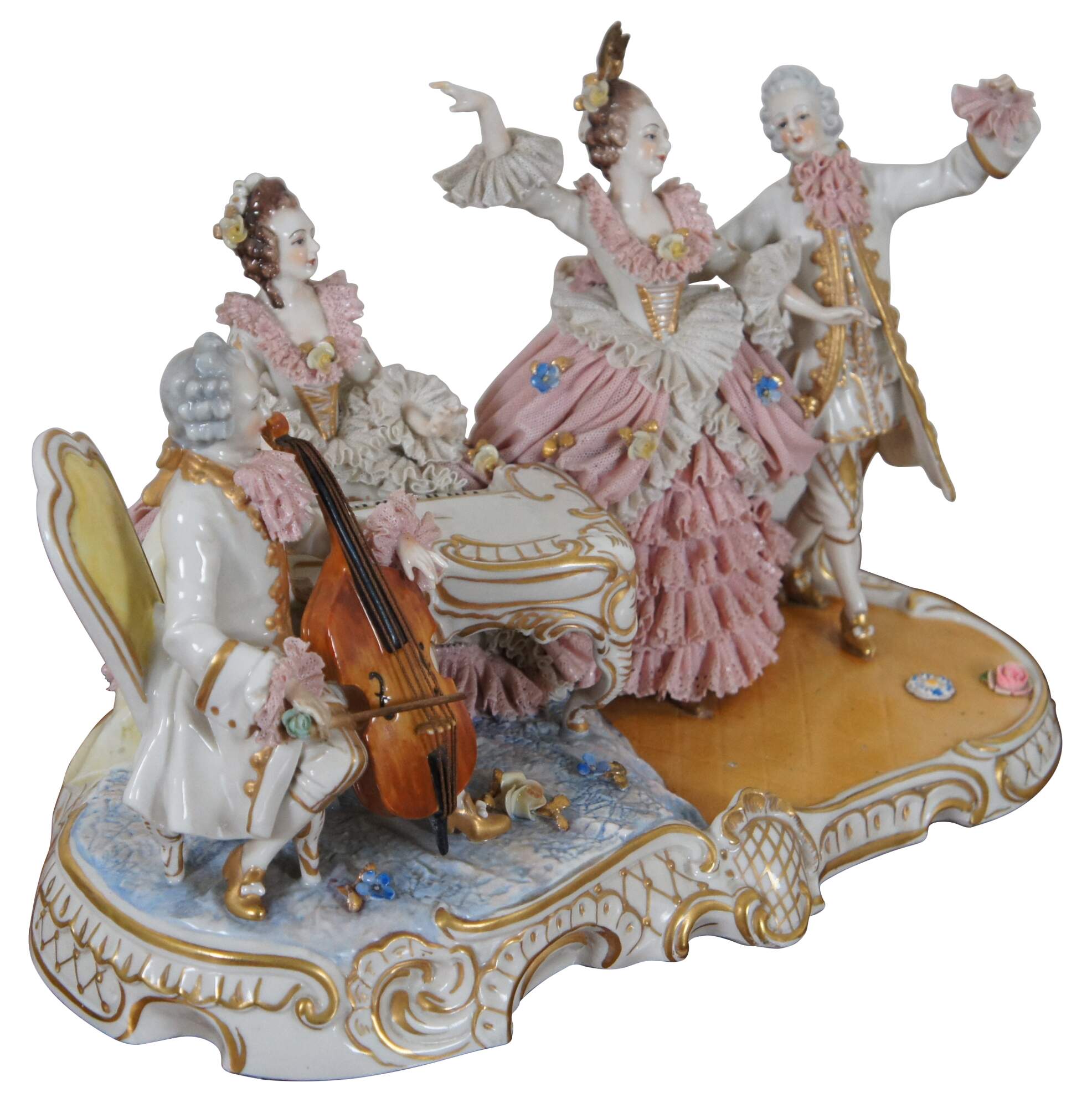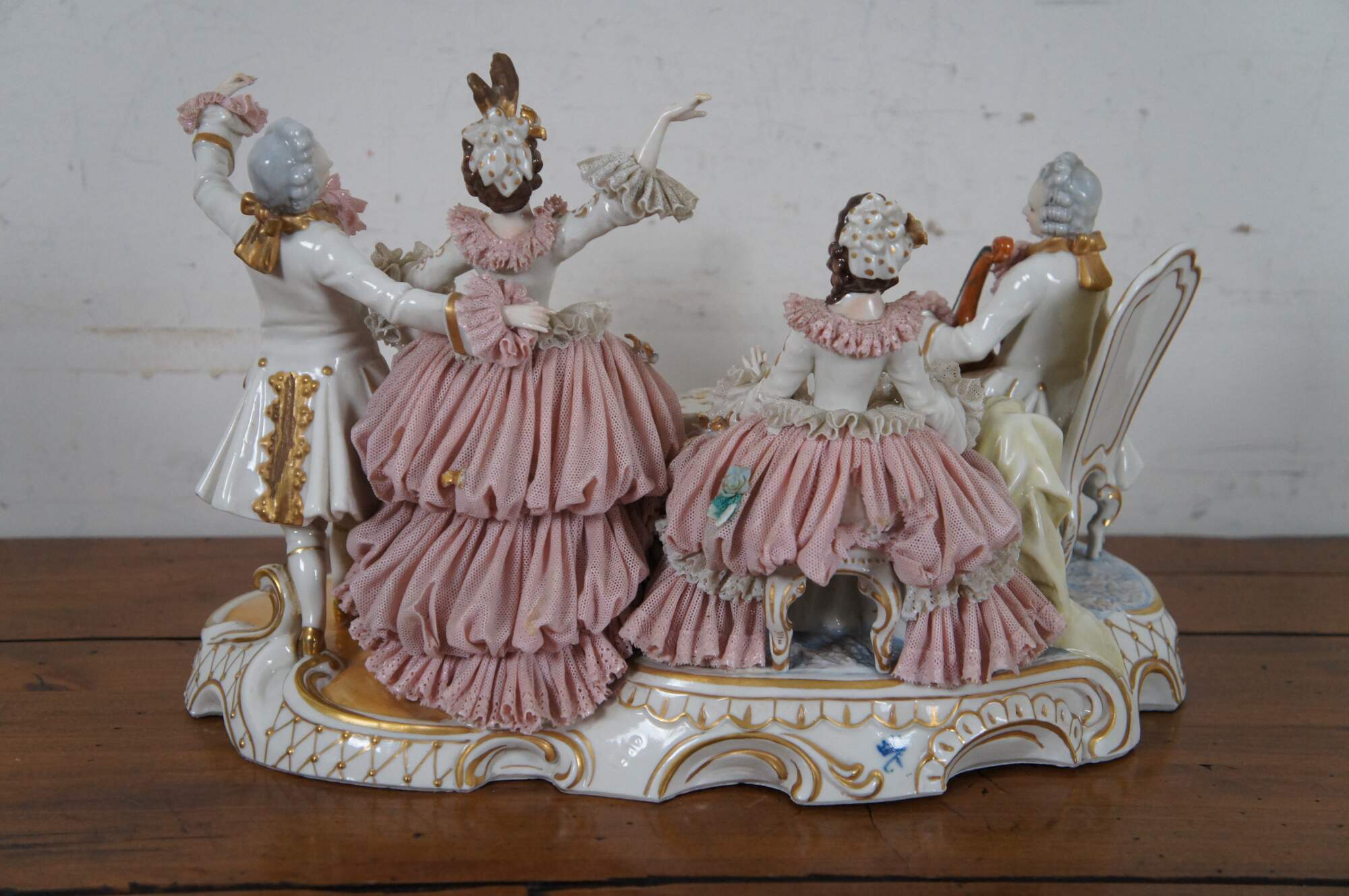 Antique late 1800’s Dresden capodimonte figure group showing two figures playing cello and harpsichord/piano forte while two other figures dance, swathed in flounces of pink and white porcelain lace, gilded accents and applied flowers.