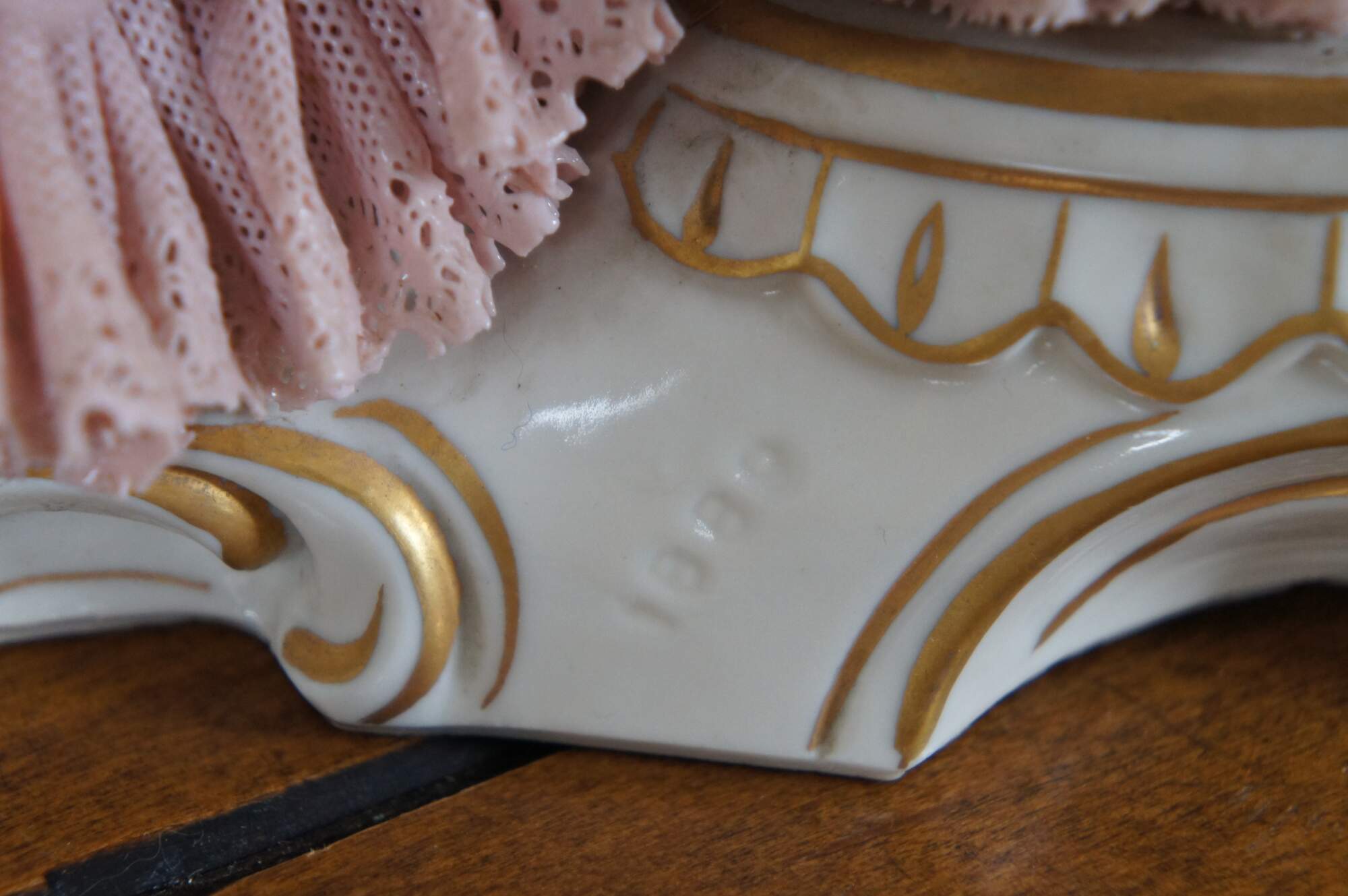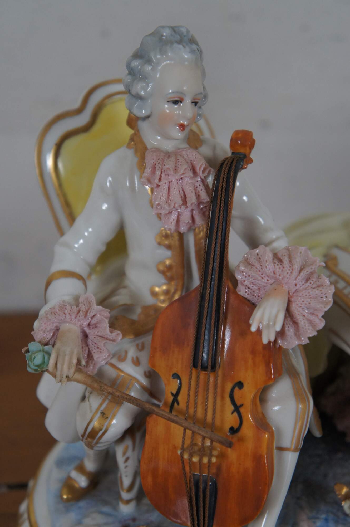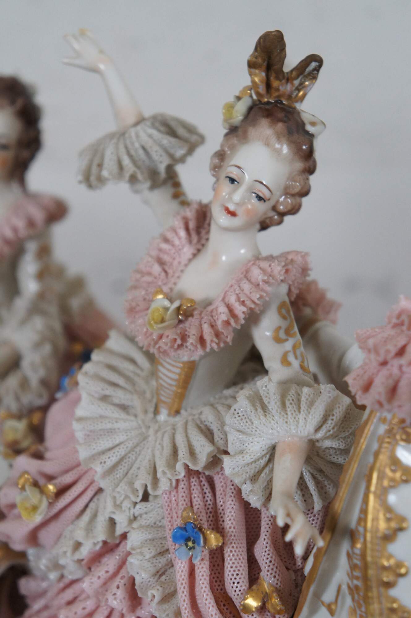 Antique late 1800’s Dresden capodimonte figure group showing two figures playing cello and harpsichord/piano forte while two other figures dance, swathed in flounces of pink and white porcelain lace, gilded accents and applied flowers.