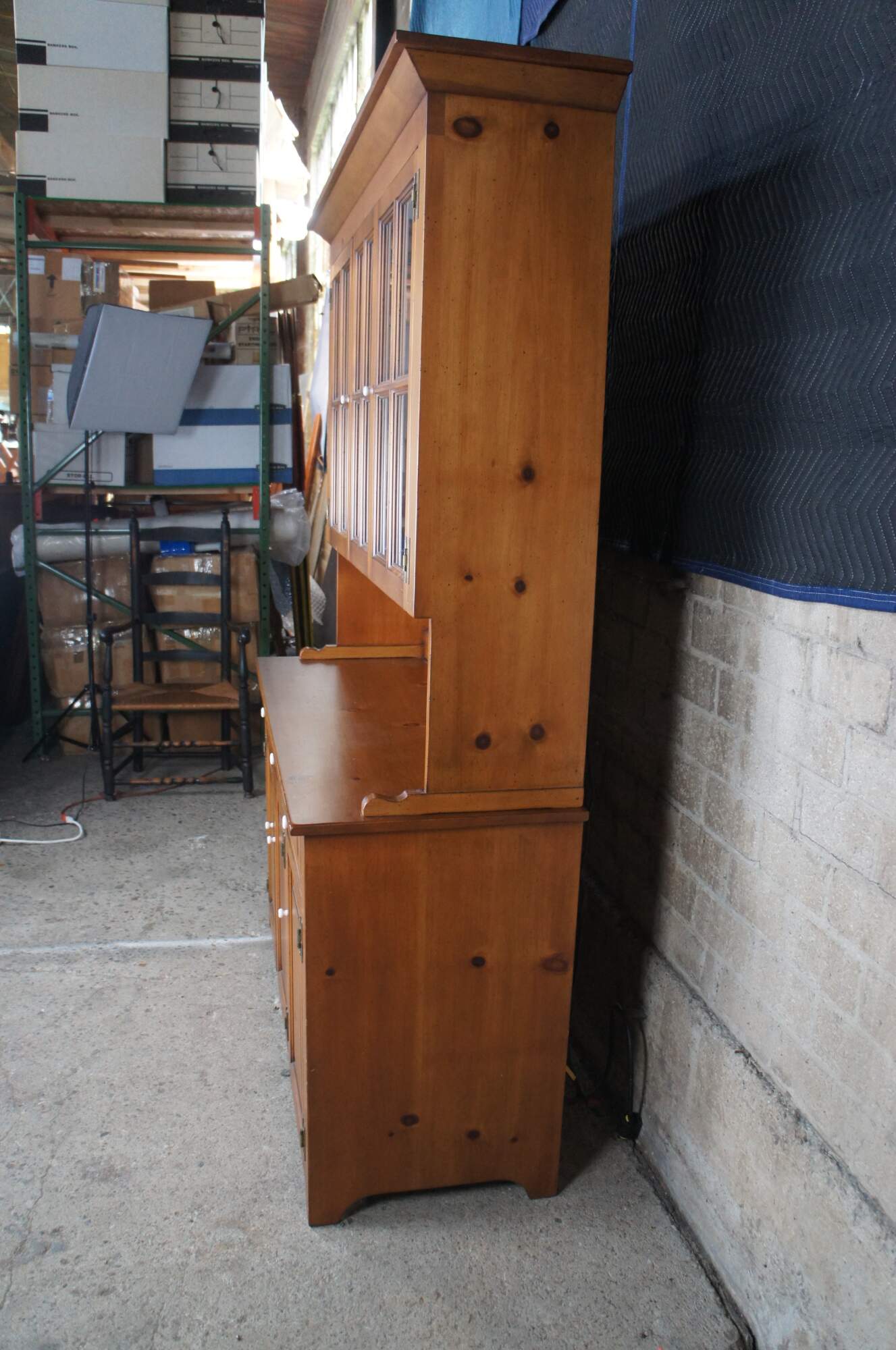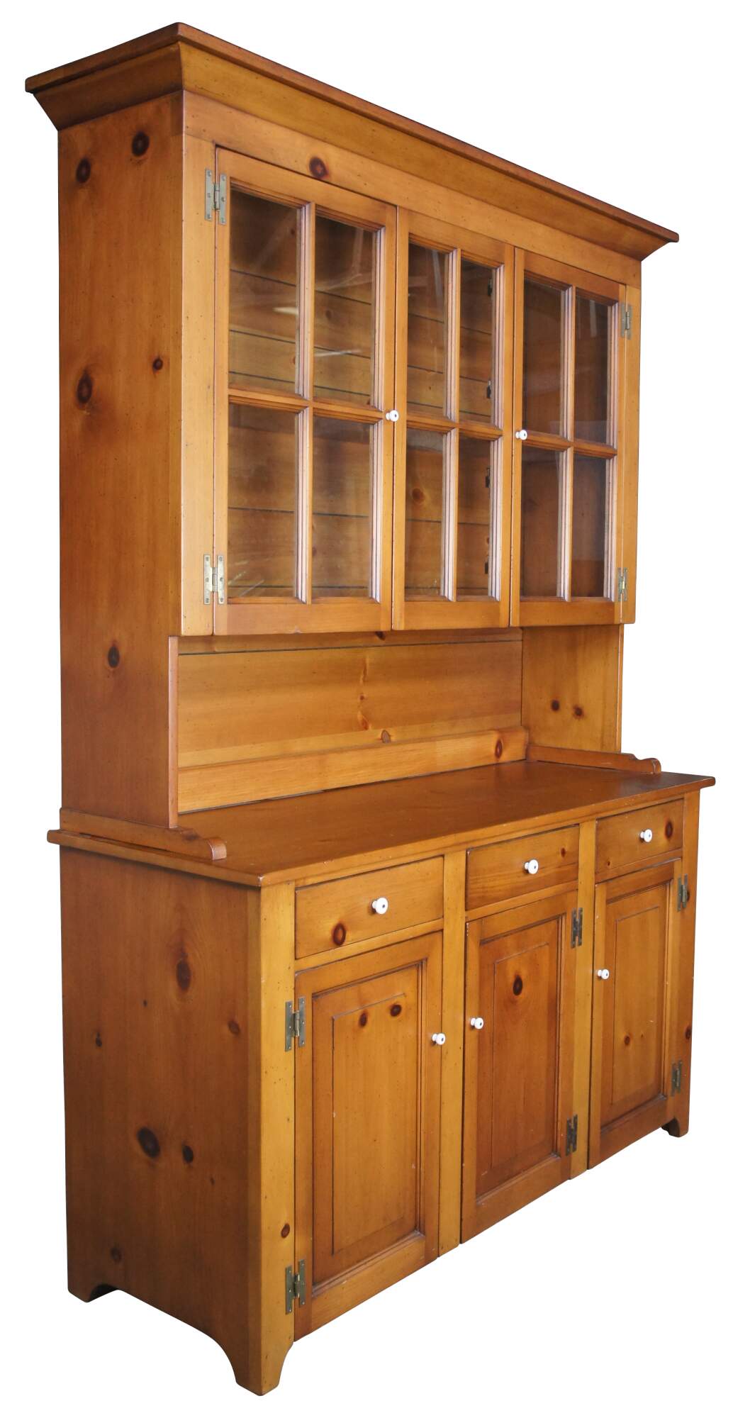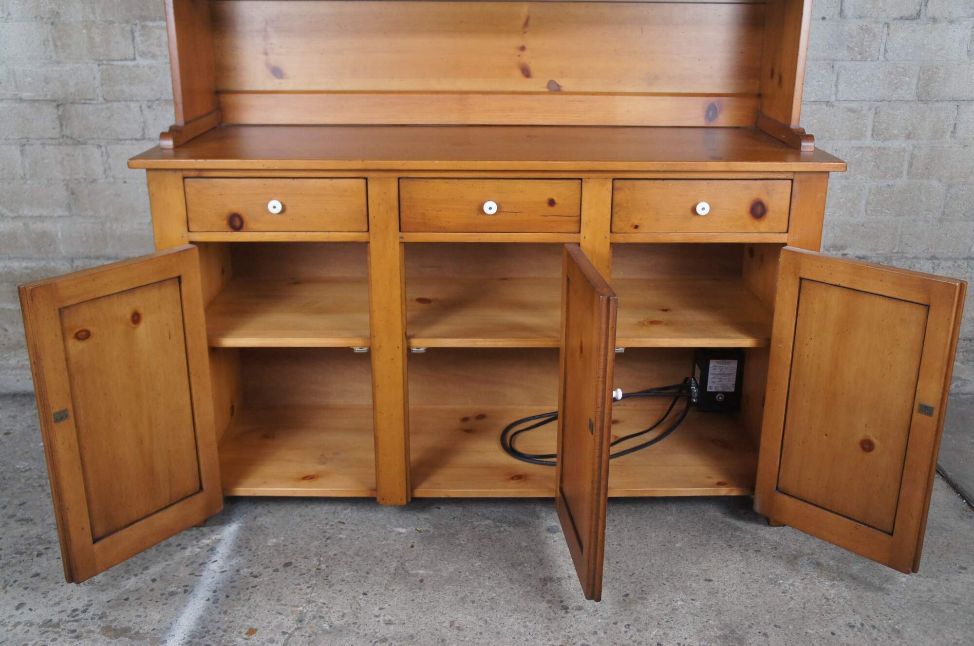 This beautiful display cabinet is great for serving and storage. Made from solid pine with an upper glass display, brass ""H"" hinges and porcelain knobs. Features three drawers over lower cabinets for storage. Hutch is illuminated.