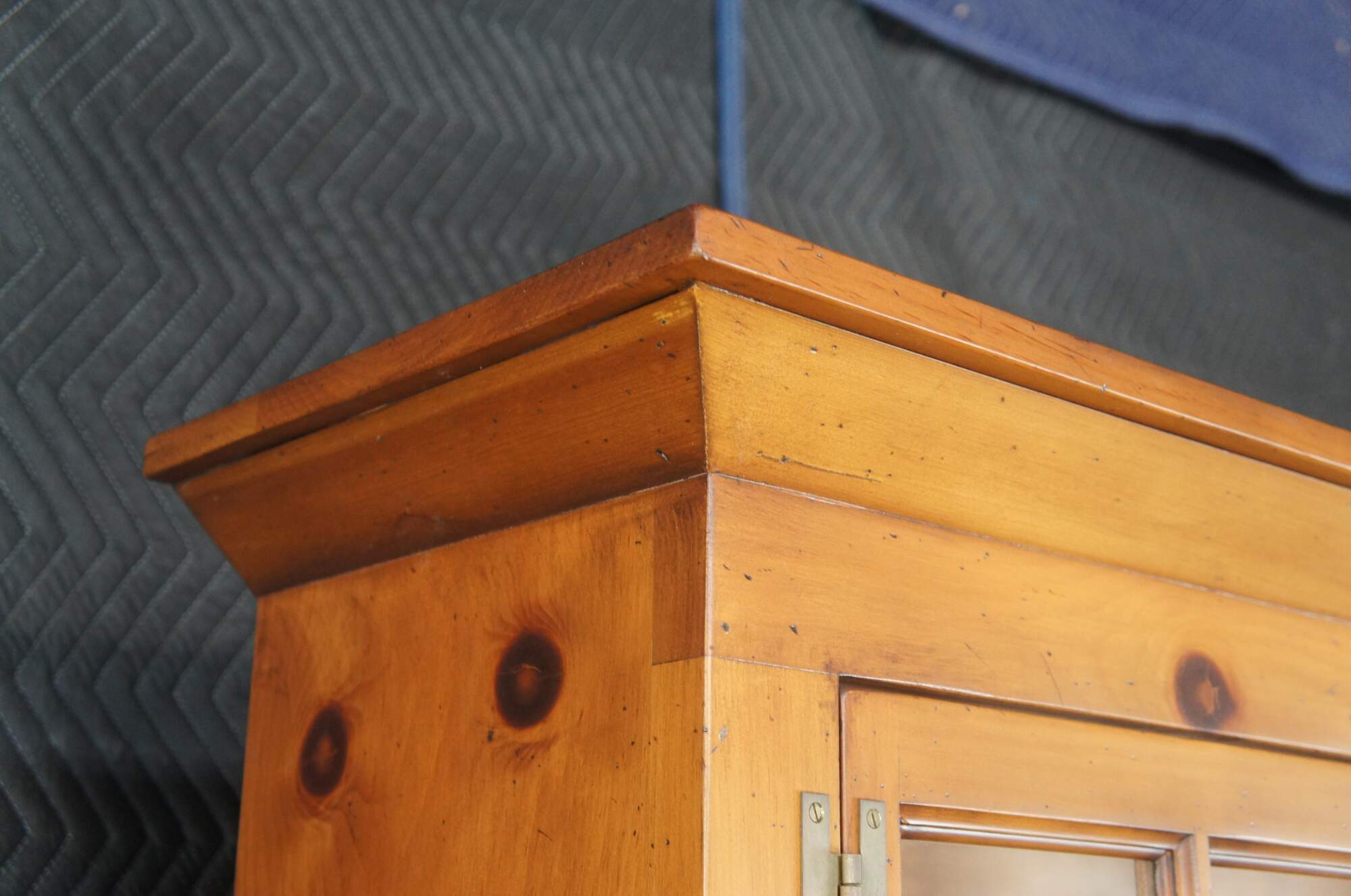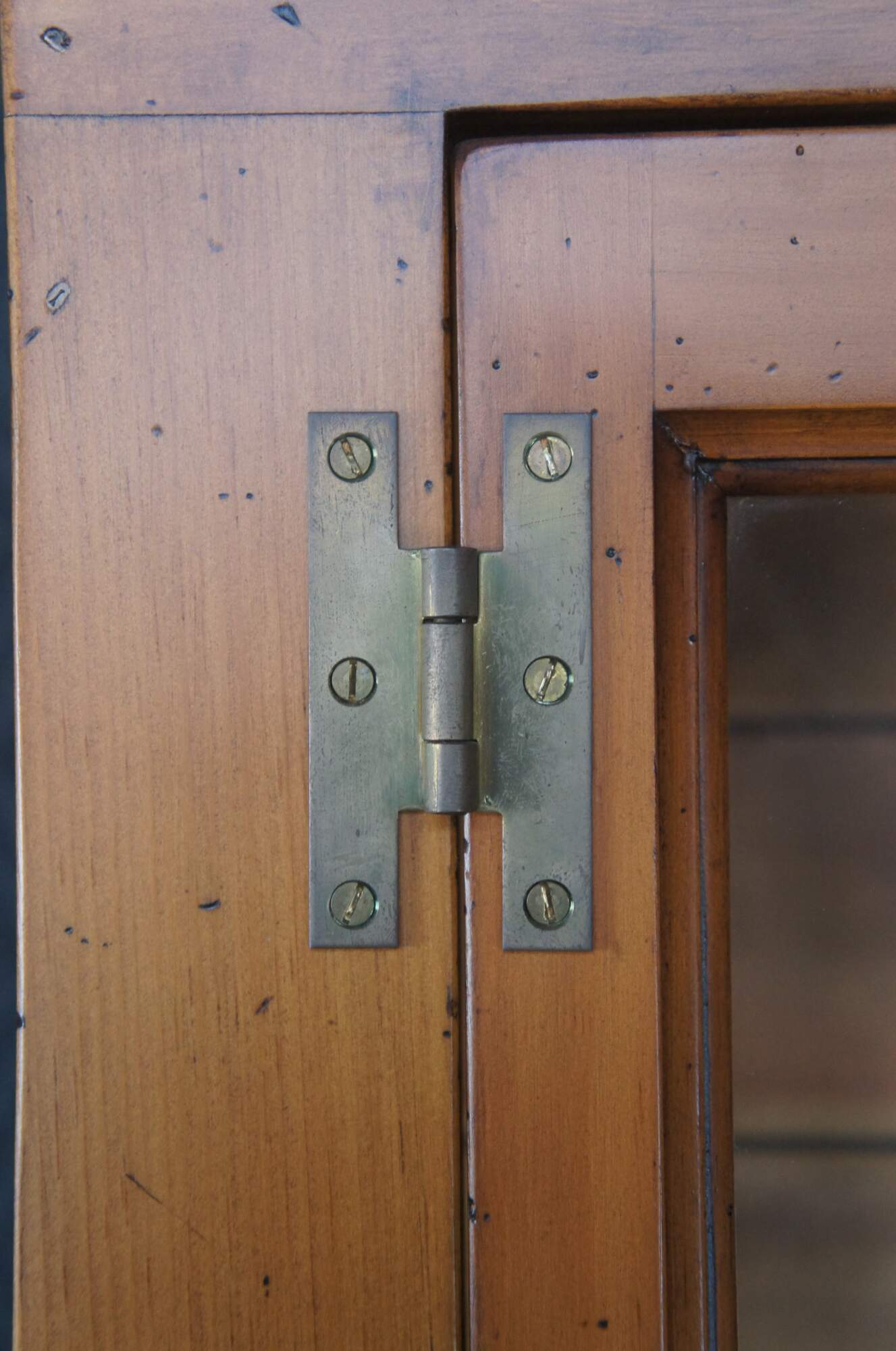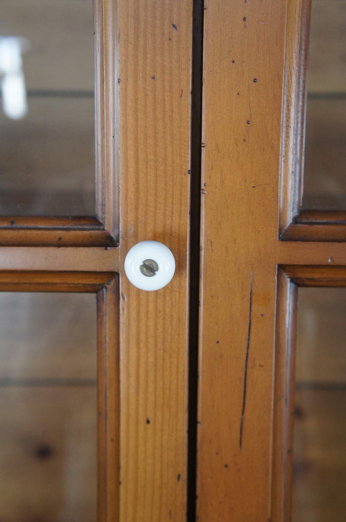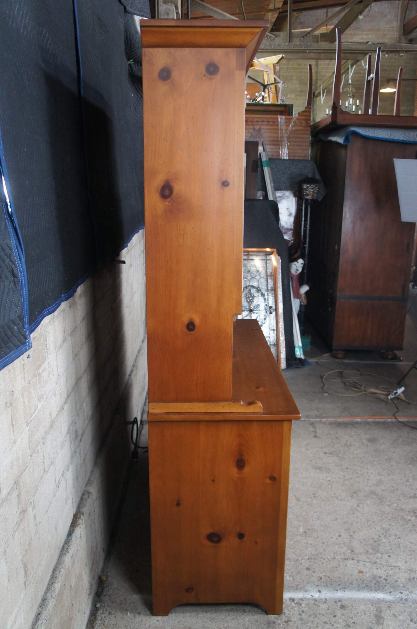 This beautiful display cabinet is great for serving and storage. Made from solid pine with an upper glass display, brass ""H"" hinges and porcelain knobs. Features three drawers over lower cabinets for storage. Hutch is illuminated.