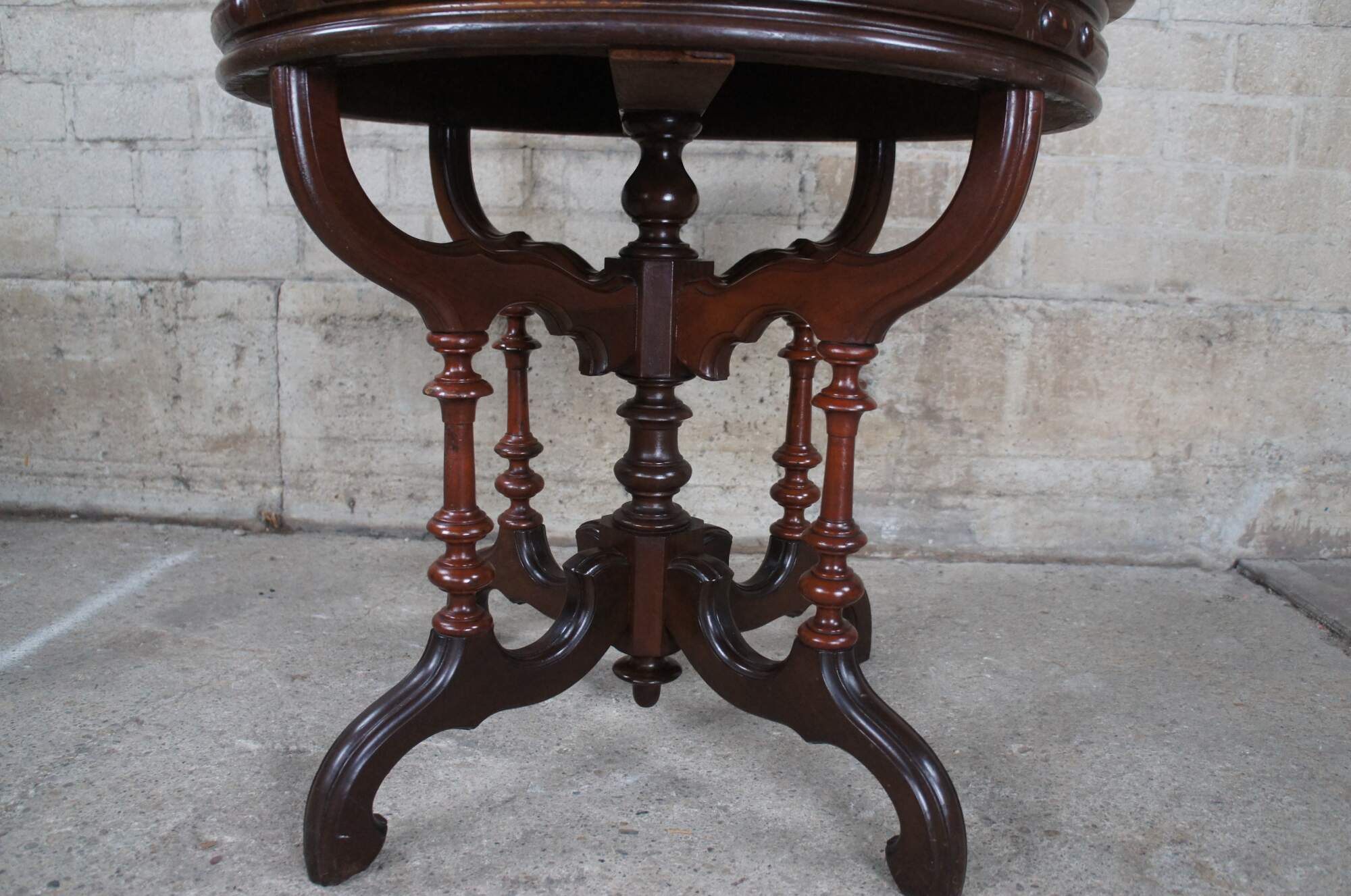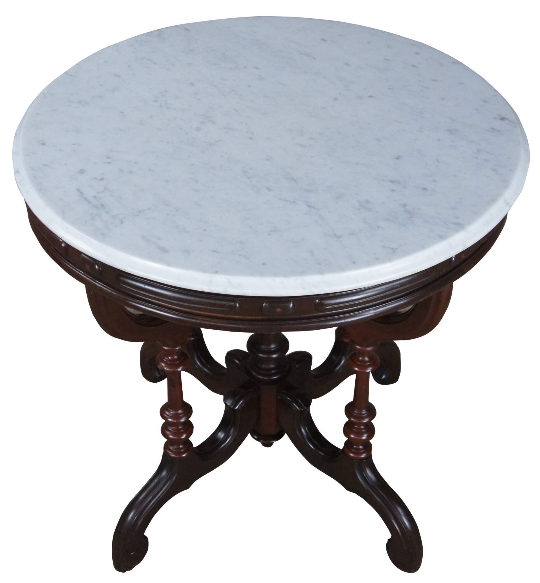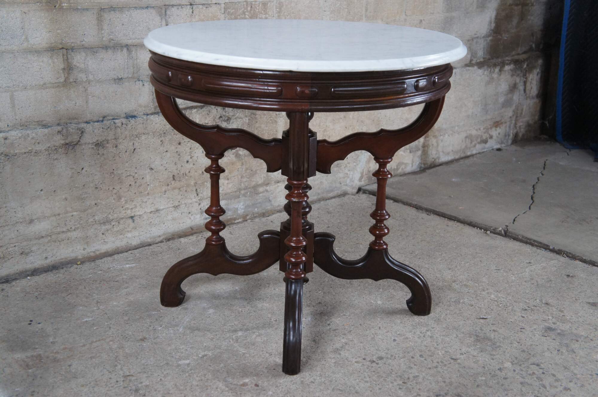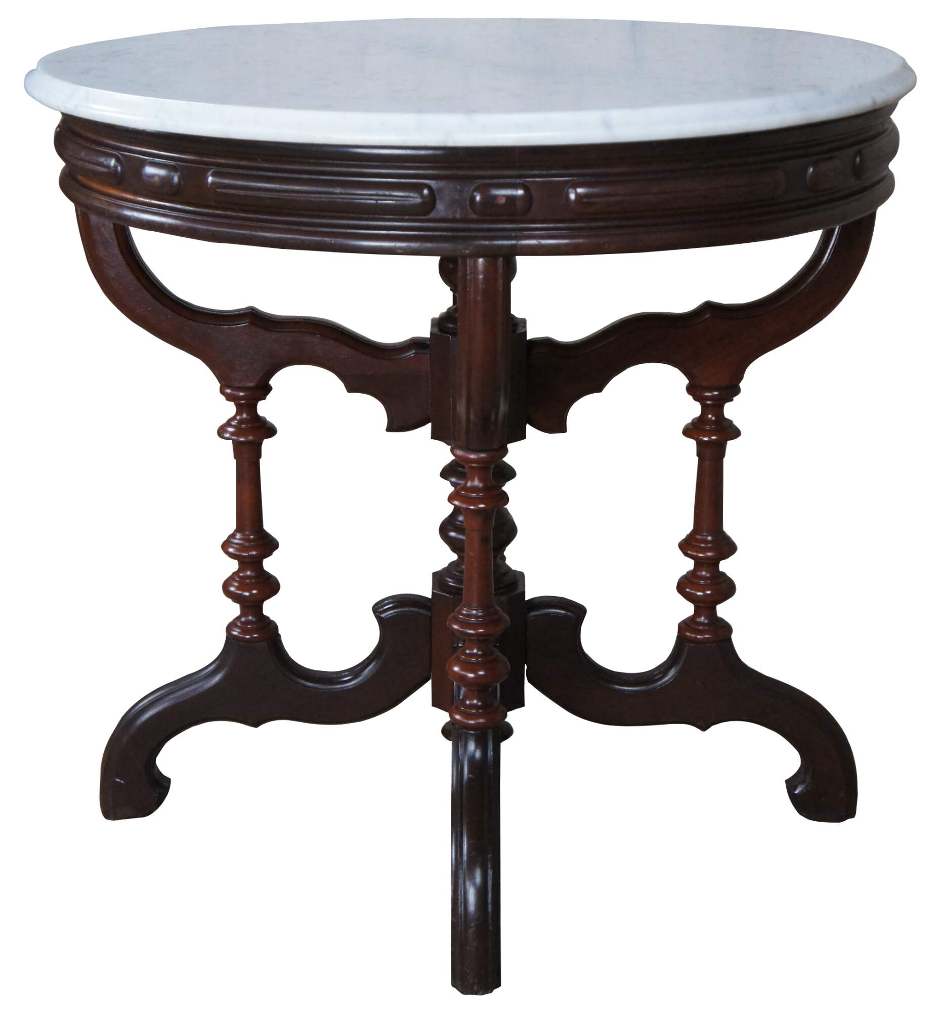 Antique Victorian parlor center table from J.H. Crane of Saint Louis Mo. Made of walnut featuring round form with white marble top and serpentine shaped base with turned posts.