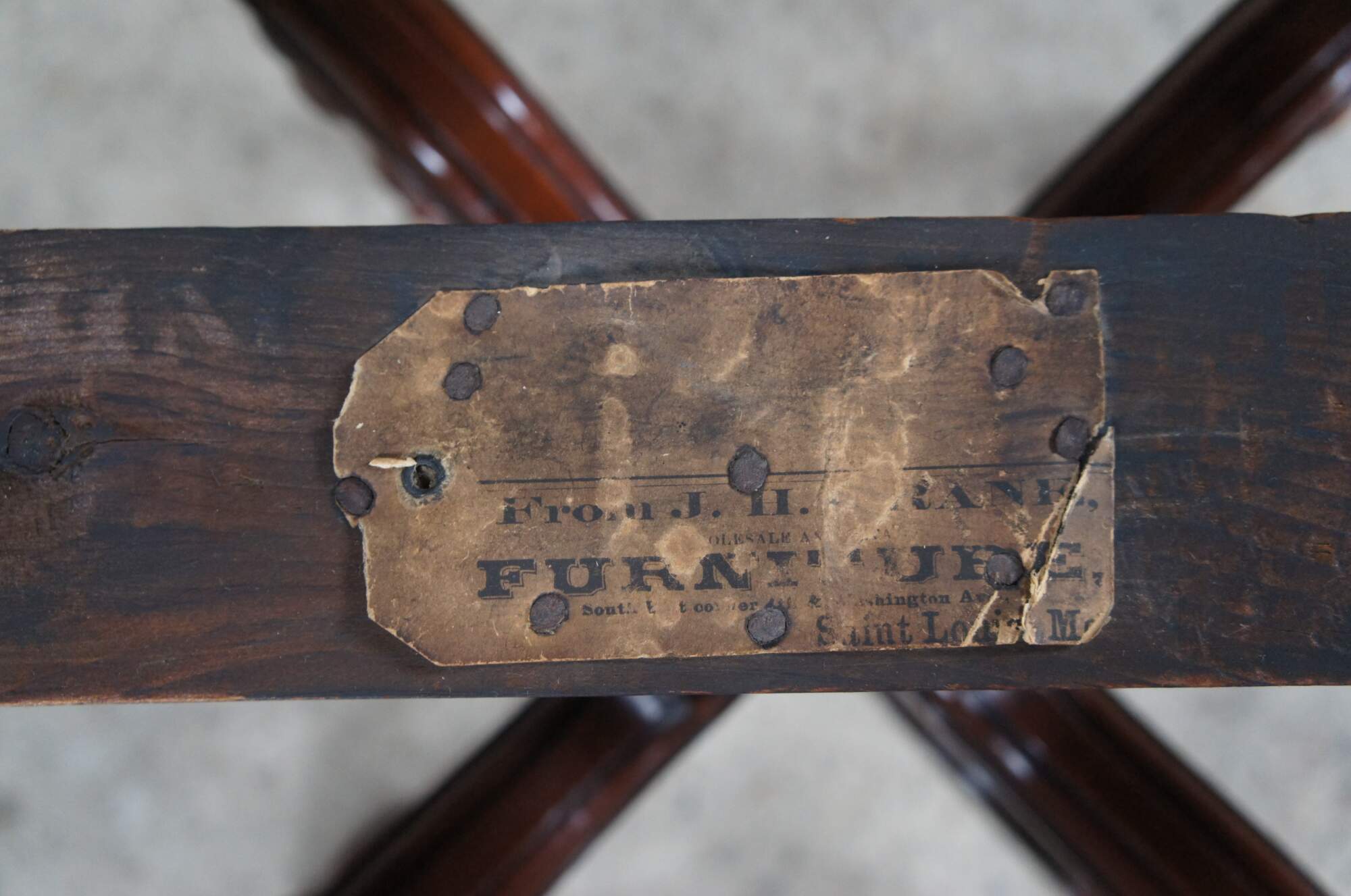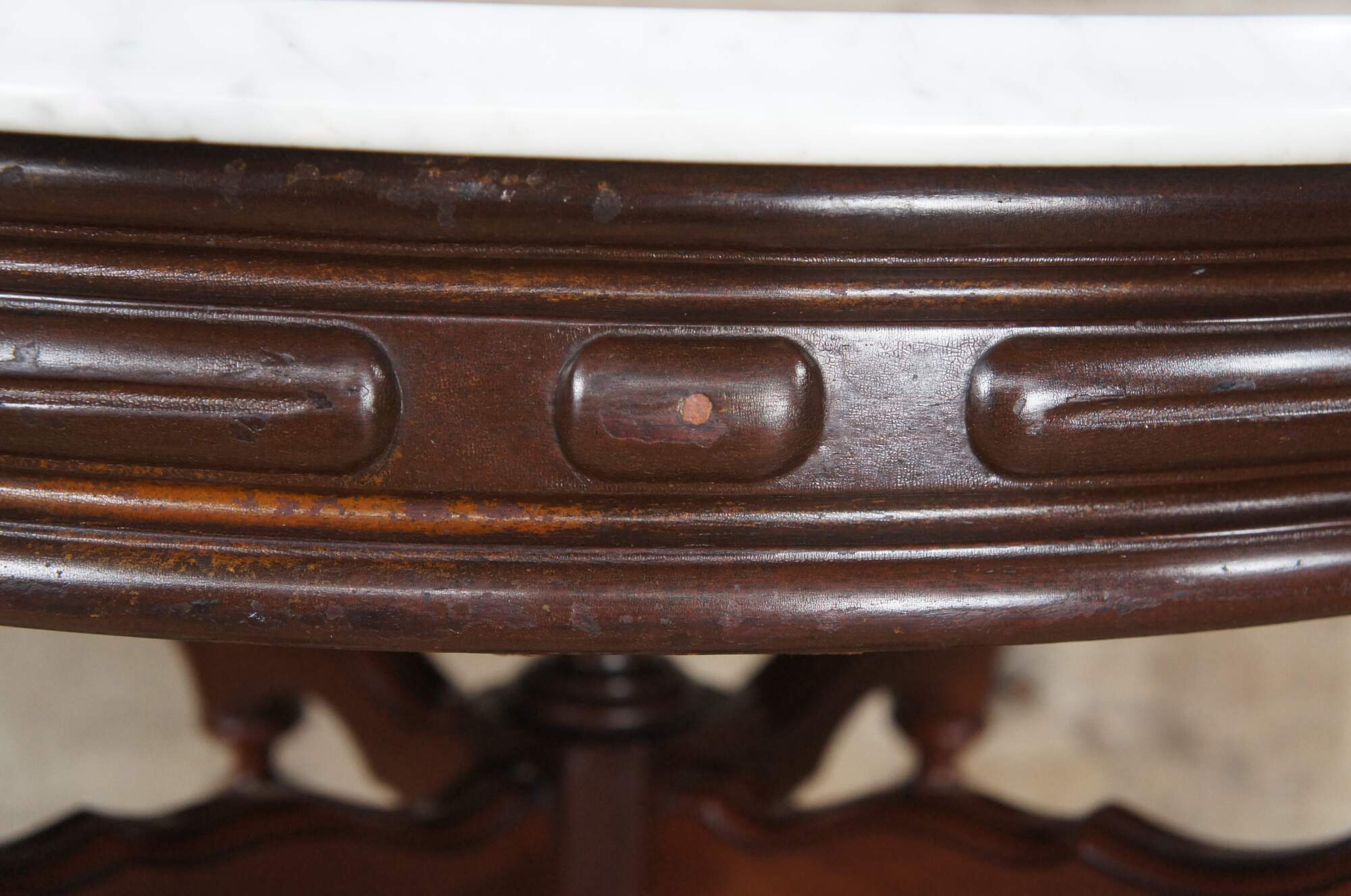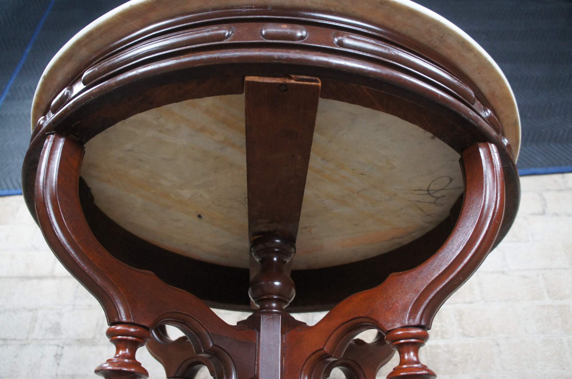 Antique Victorian parlor center table from J.H. Crane of Saint Louis Mo. Made of walnut featuring round form with white marble top and serpentine shaped base with turned posts.