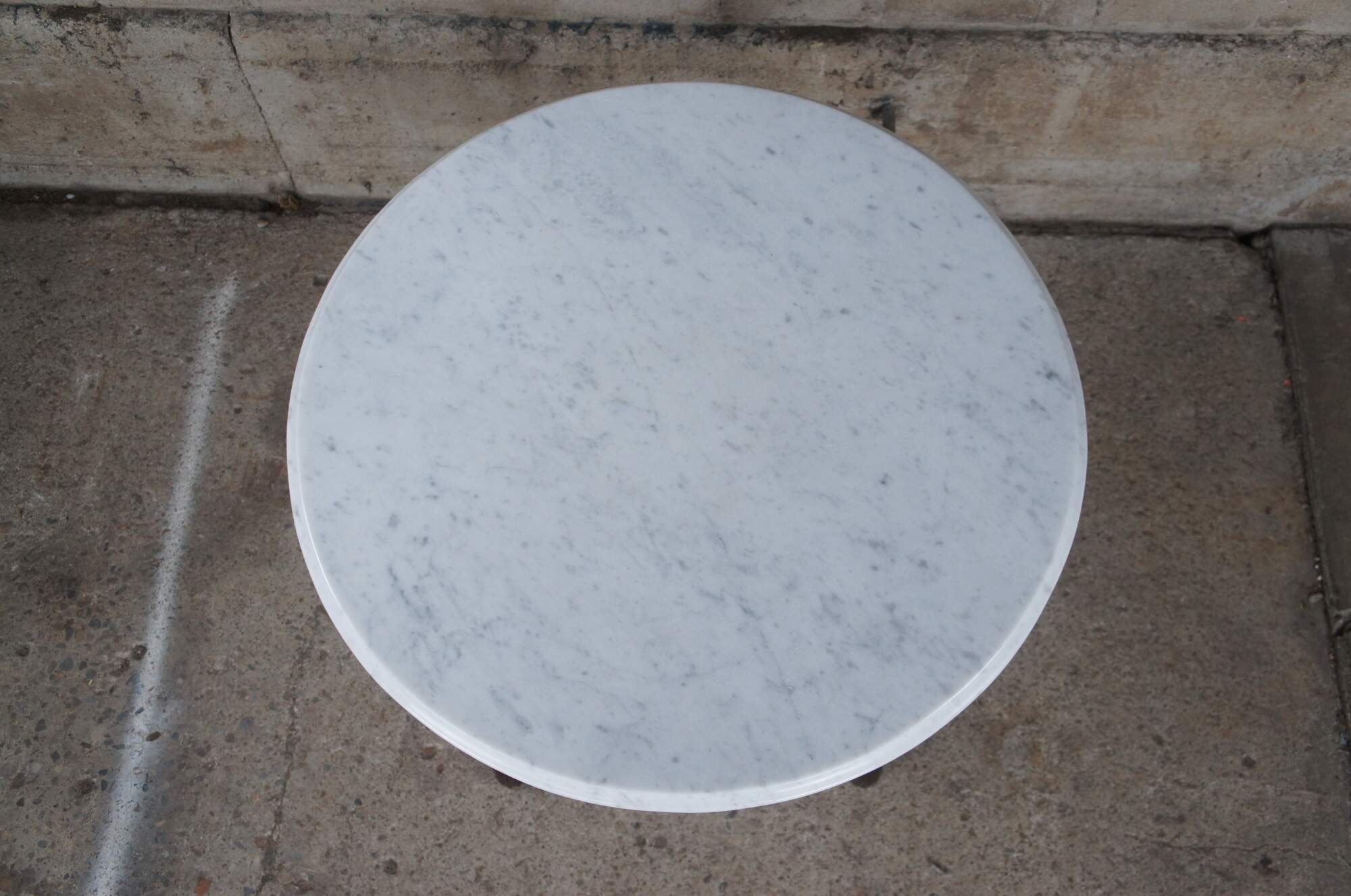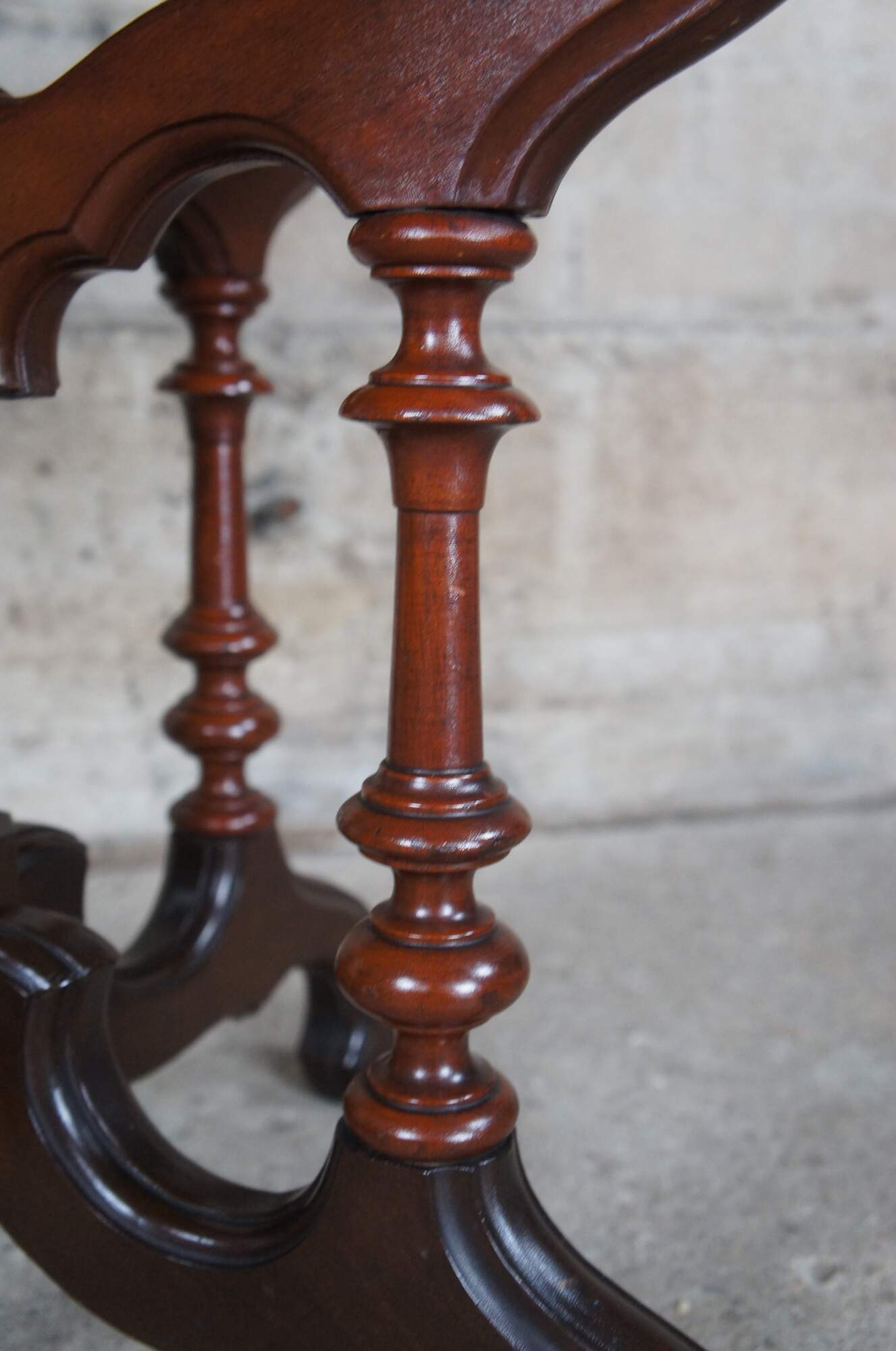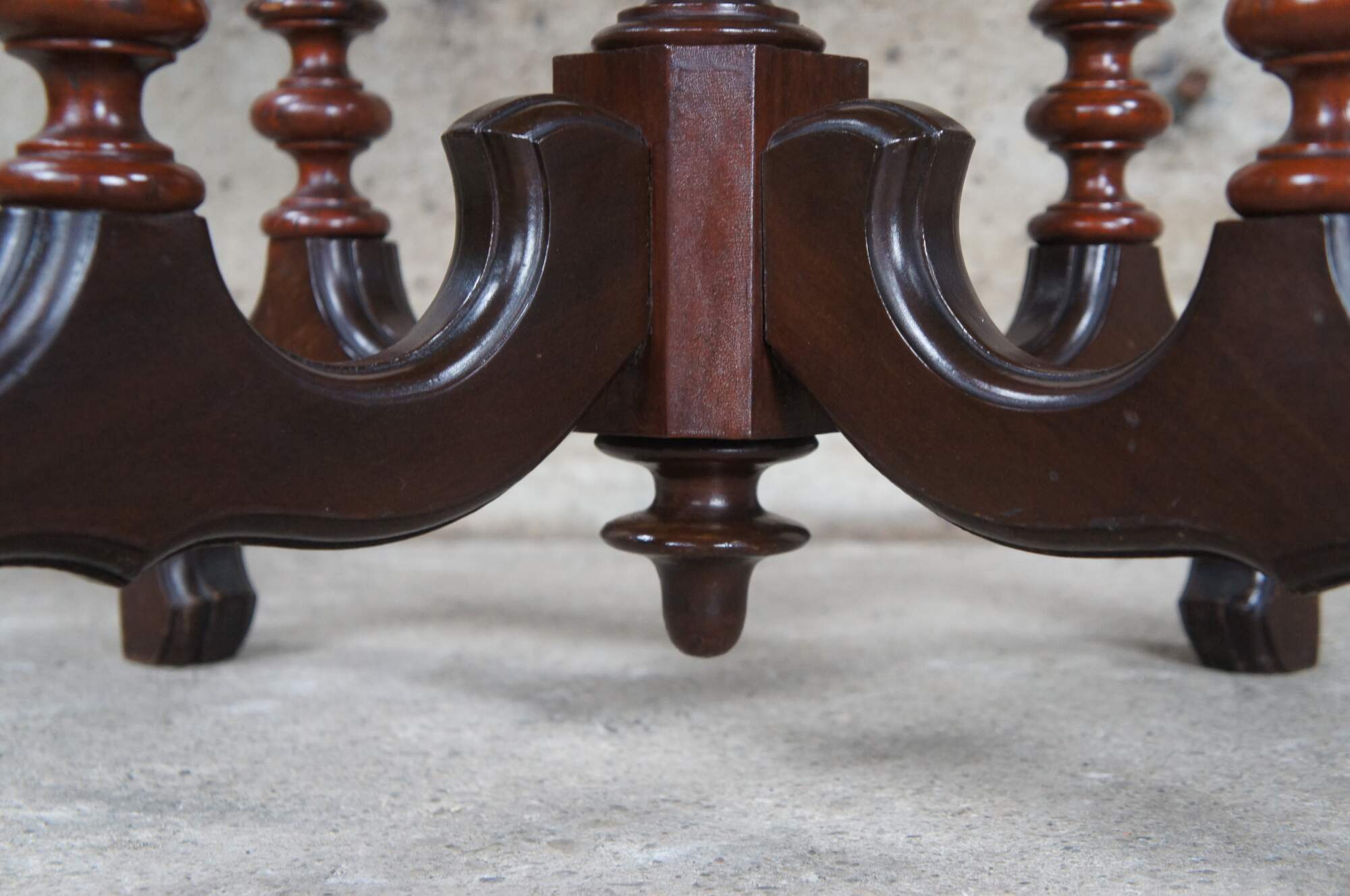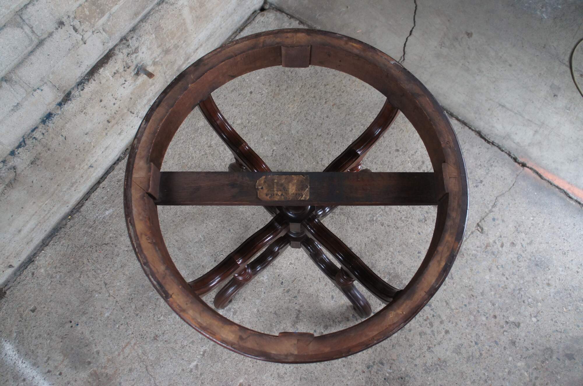Antique Victorian parlor center table from J.H. Crane of Saint Louis Mo. Made of walnut featuring round form with white marble top and serpentine shaped base with turned posts.