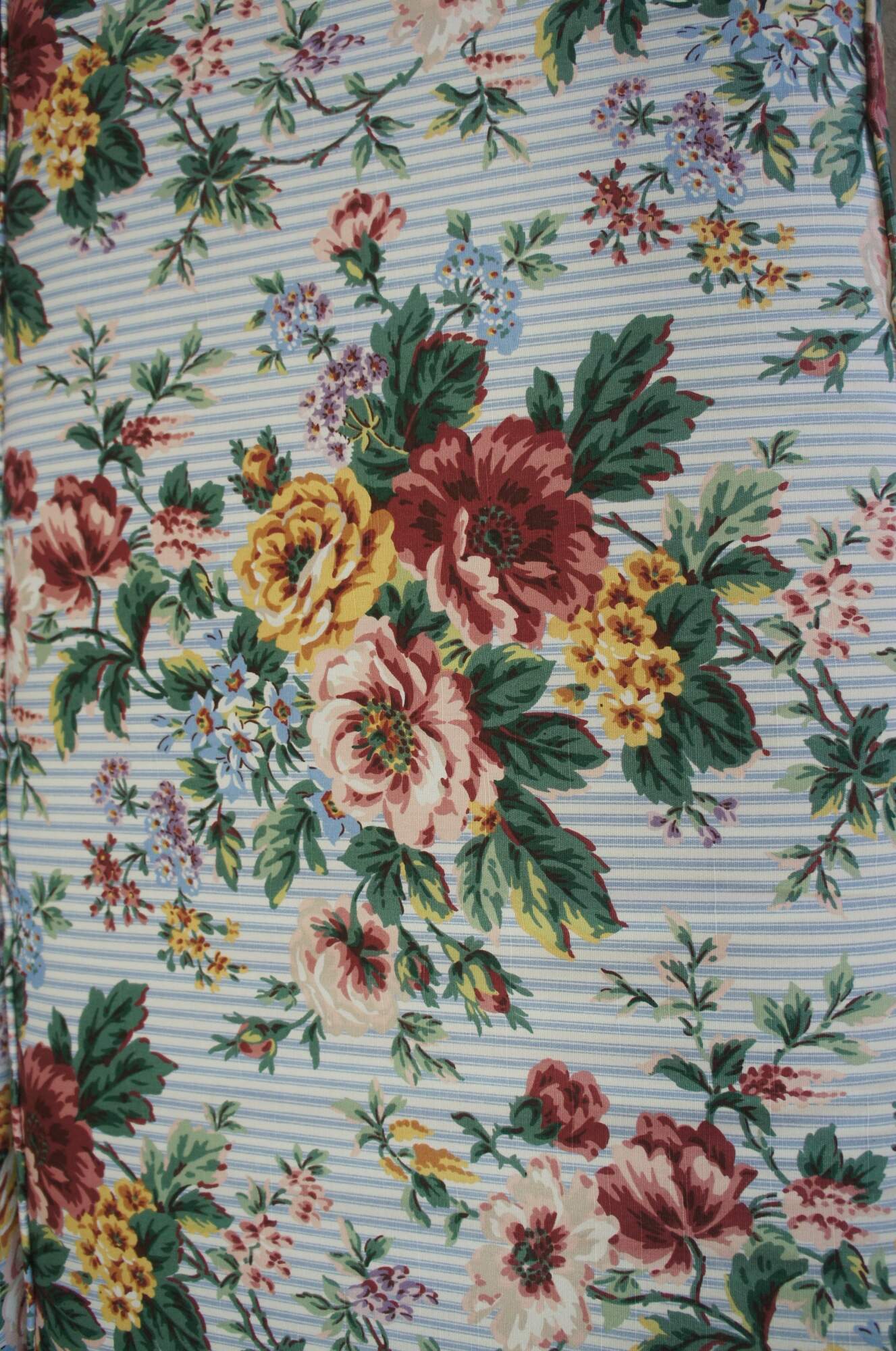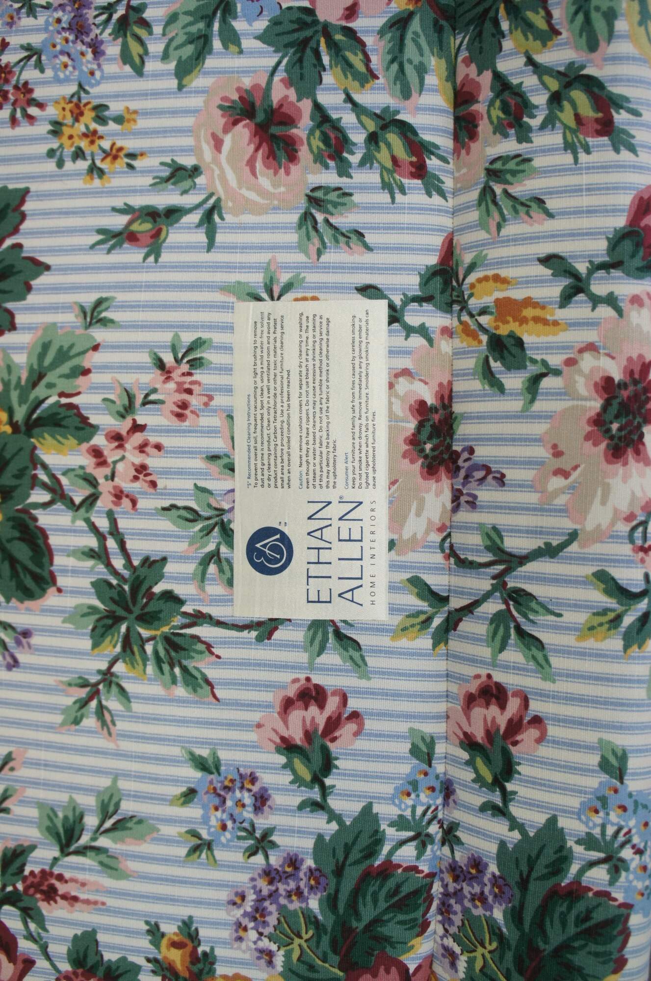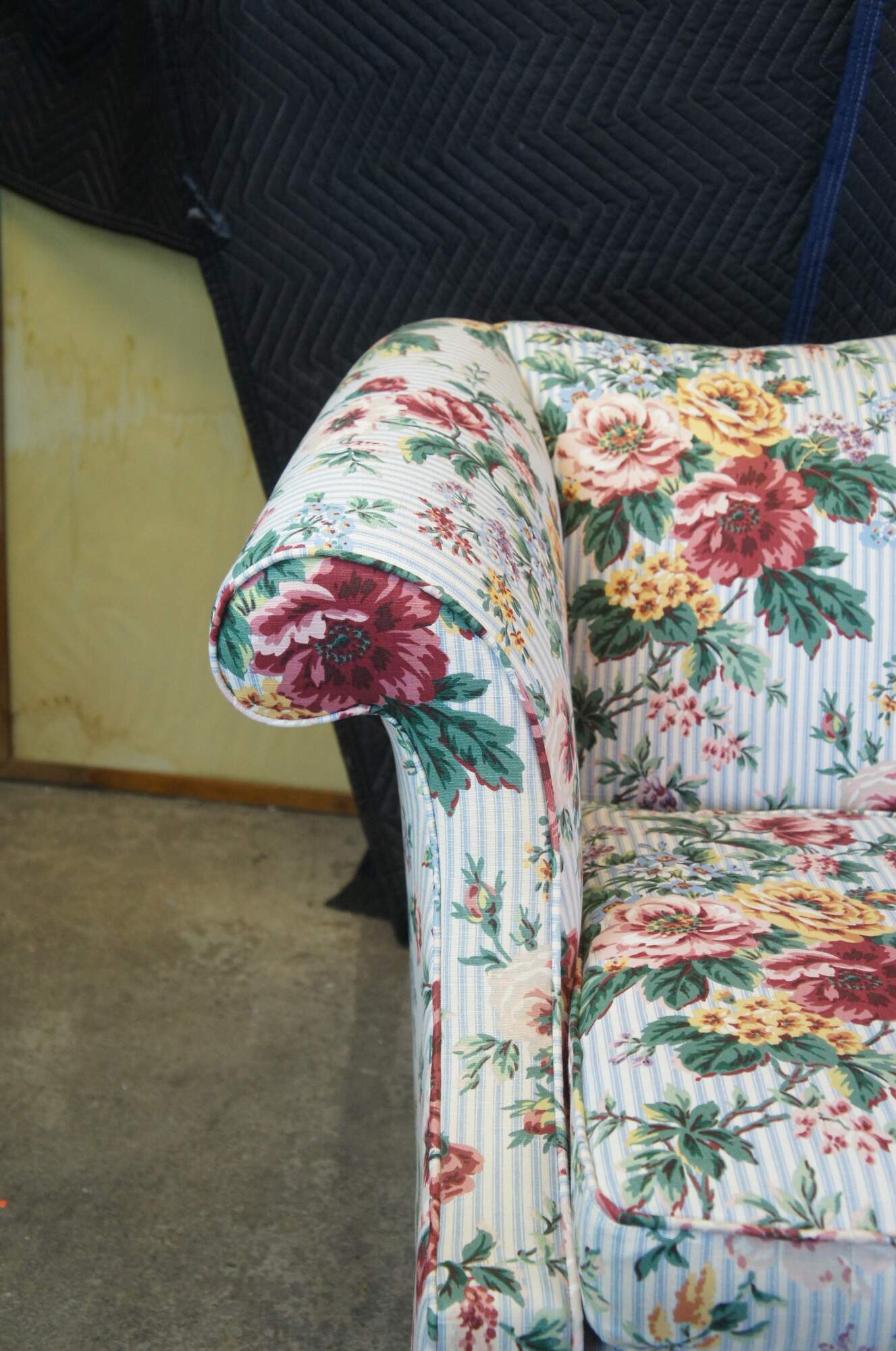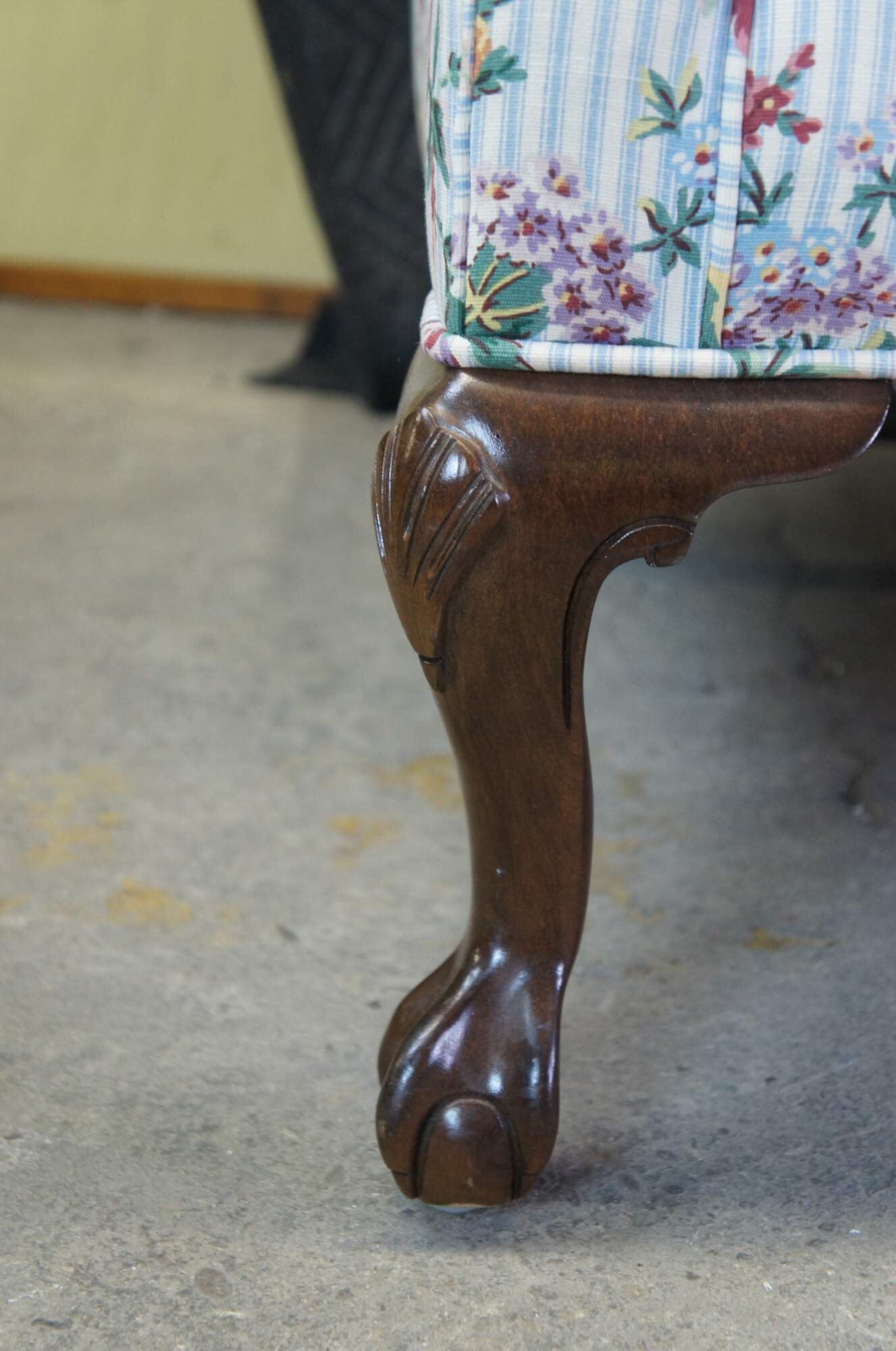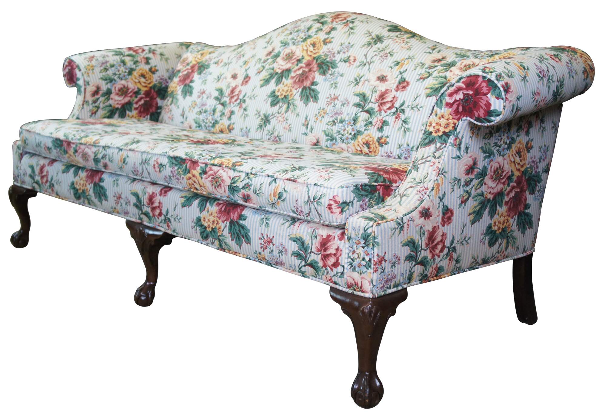Ethan Allen Georgian Court Queen Anne or chippendale style camelback sofa Mp. 20-7179, circa 1970s. Made from cherry with cabriole legs featuring a shell carved knee and ball and claw feet. The sofa is upholstered in a blue and white fabric with floral sprays of yellow, red and green.