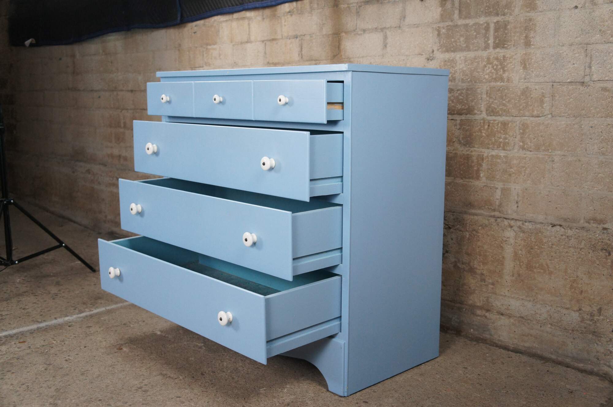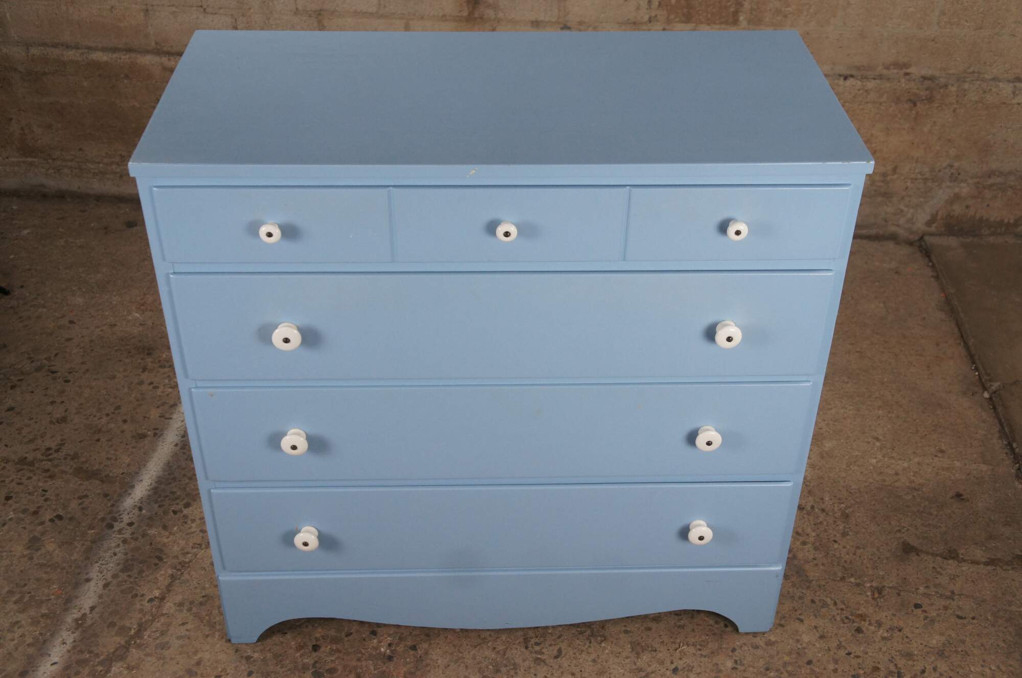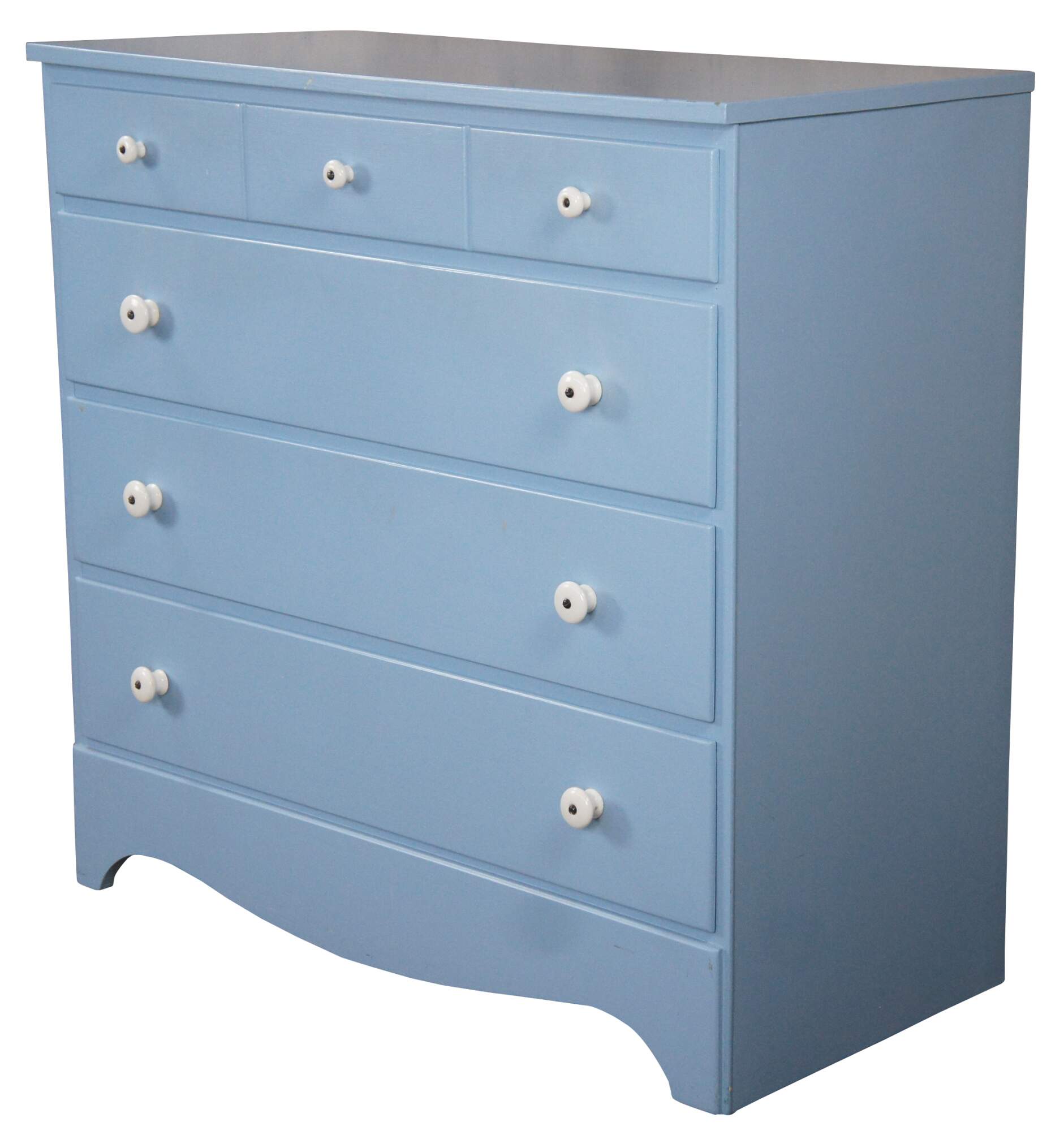 Vintage Early American style painted four drawers chest or dresser featuring North Carolina blue with white porcelain knob pulls.