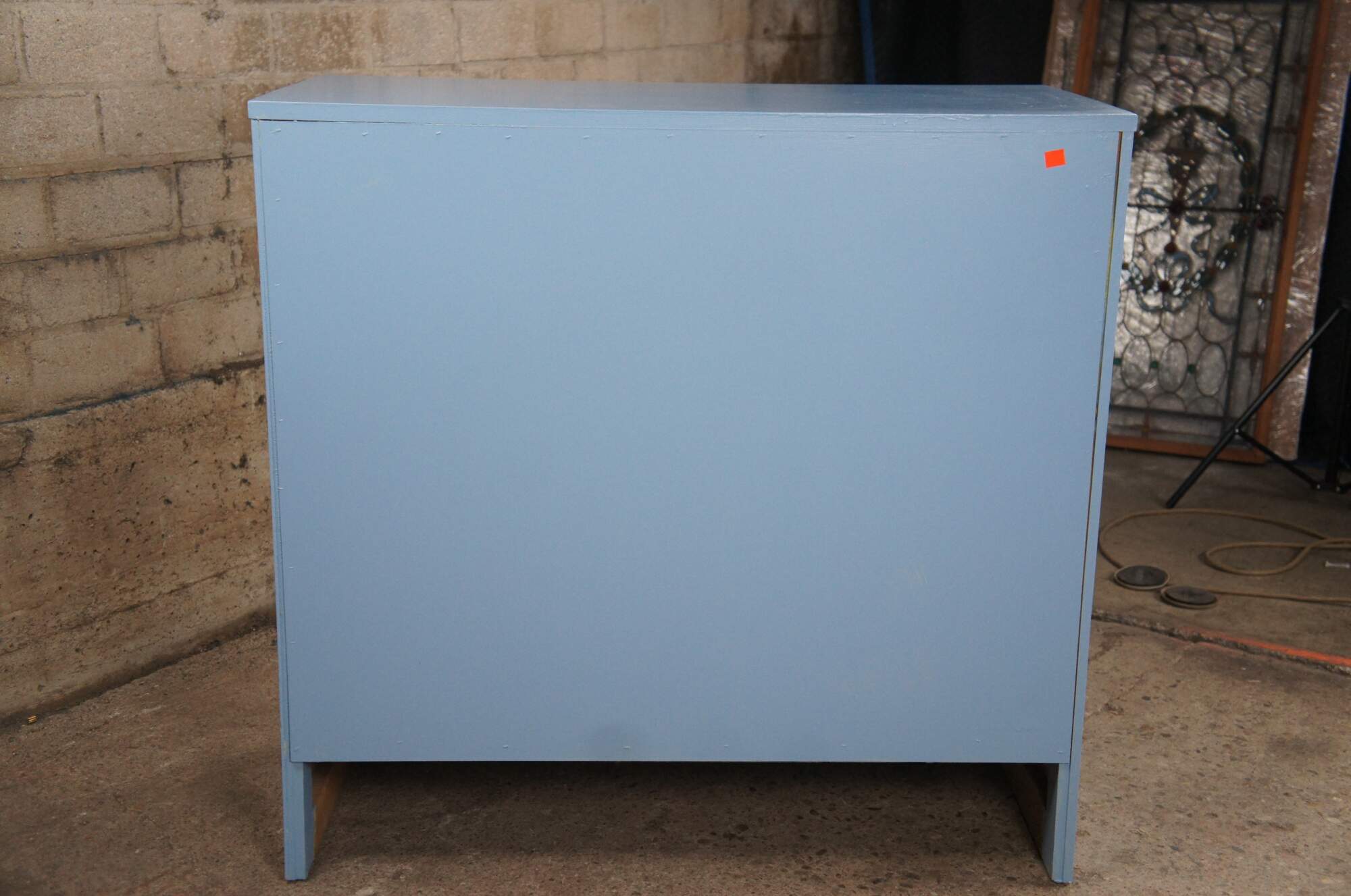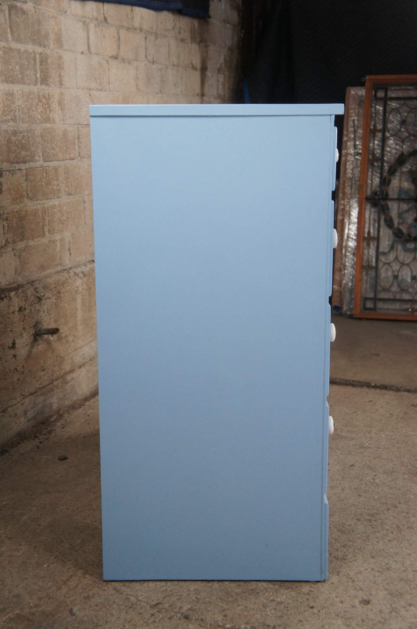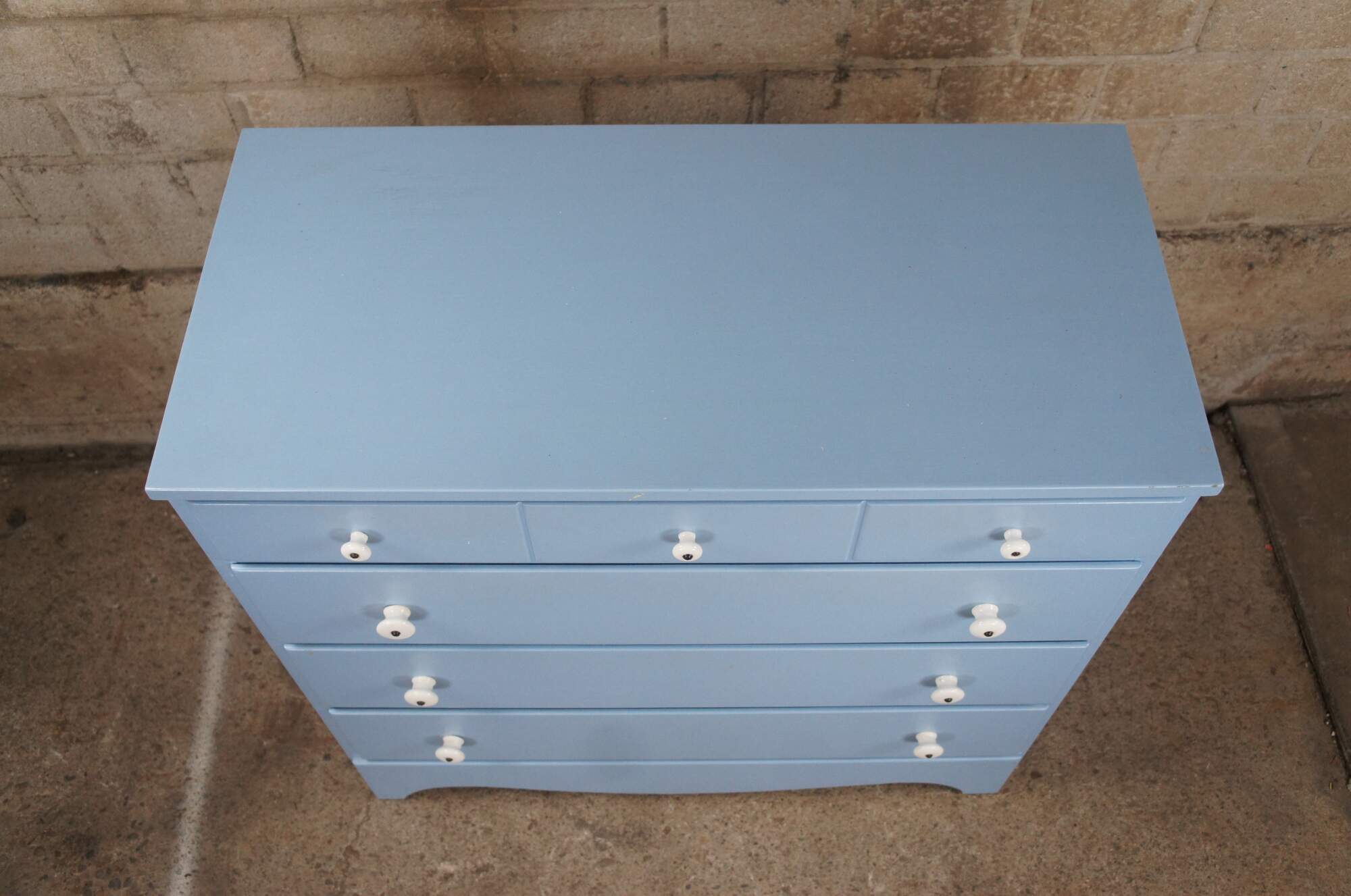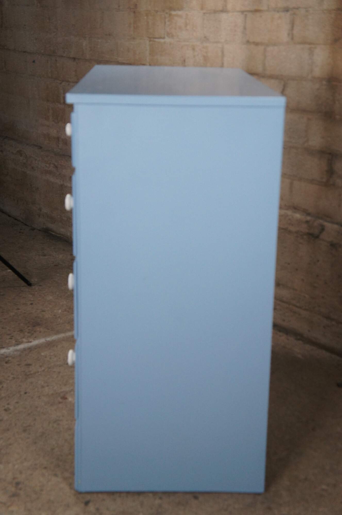 Vintage Early American style painted four drawers chest or dresser featuring North Carolina blue with white porcelain knob pulls.