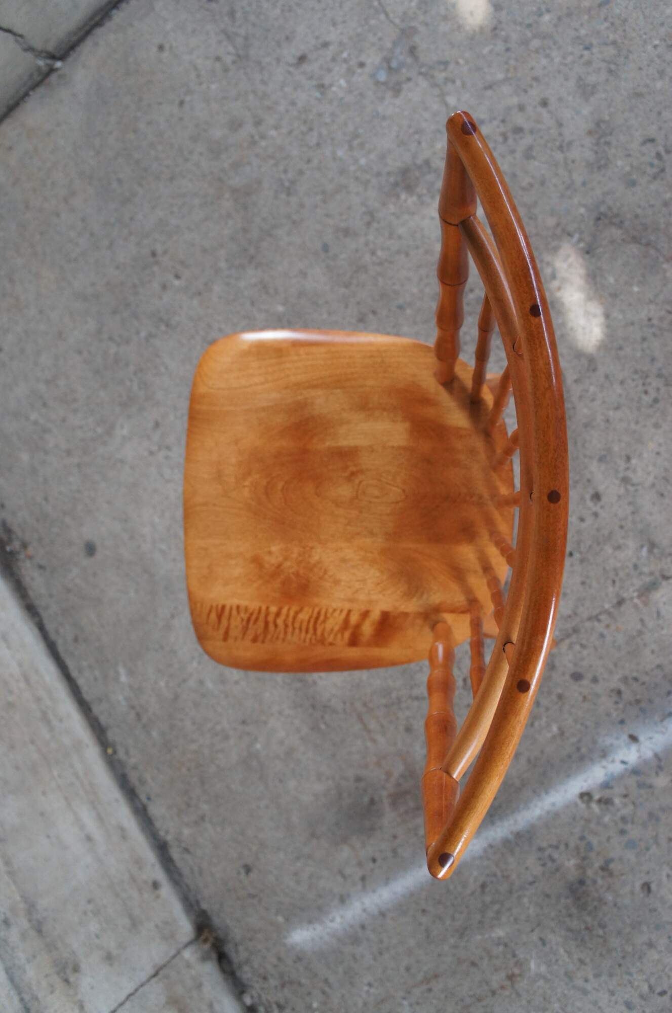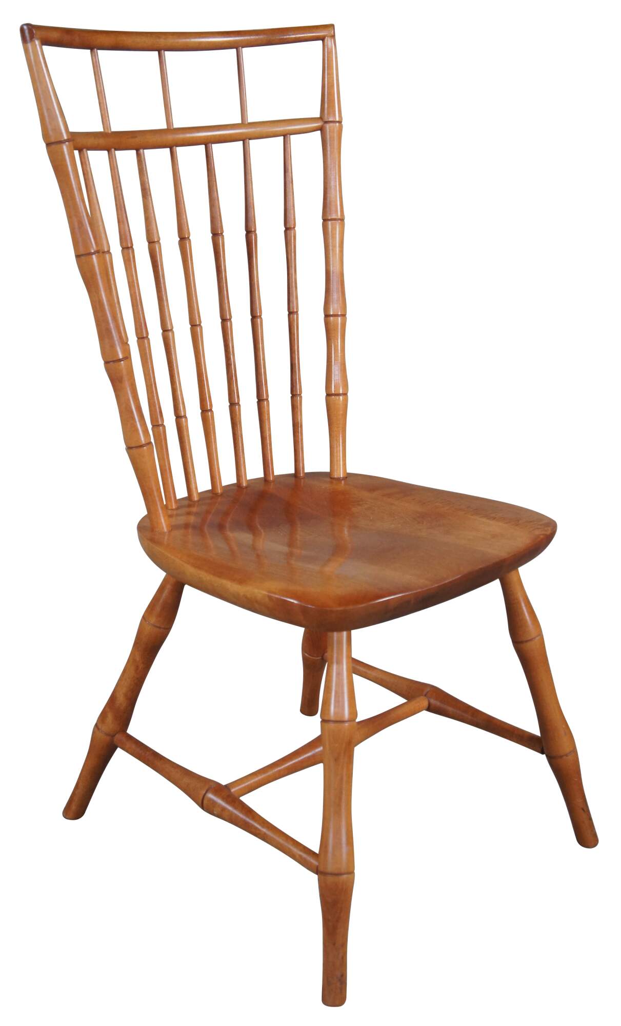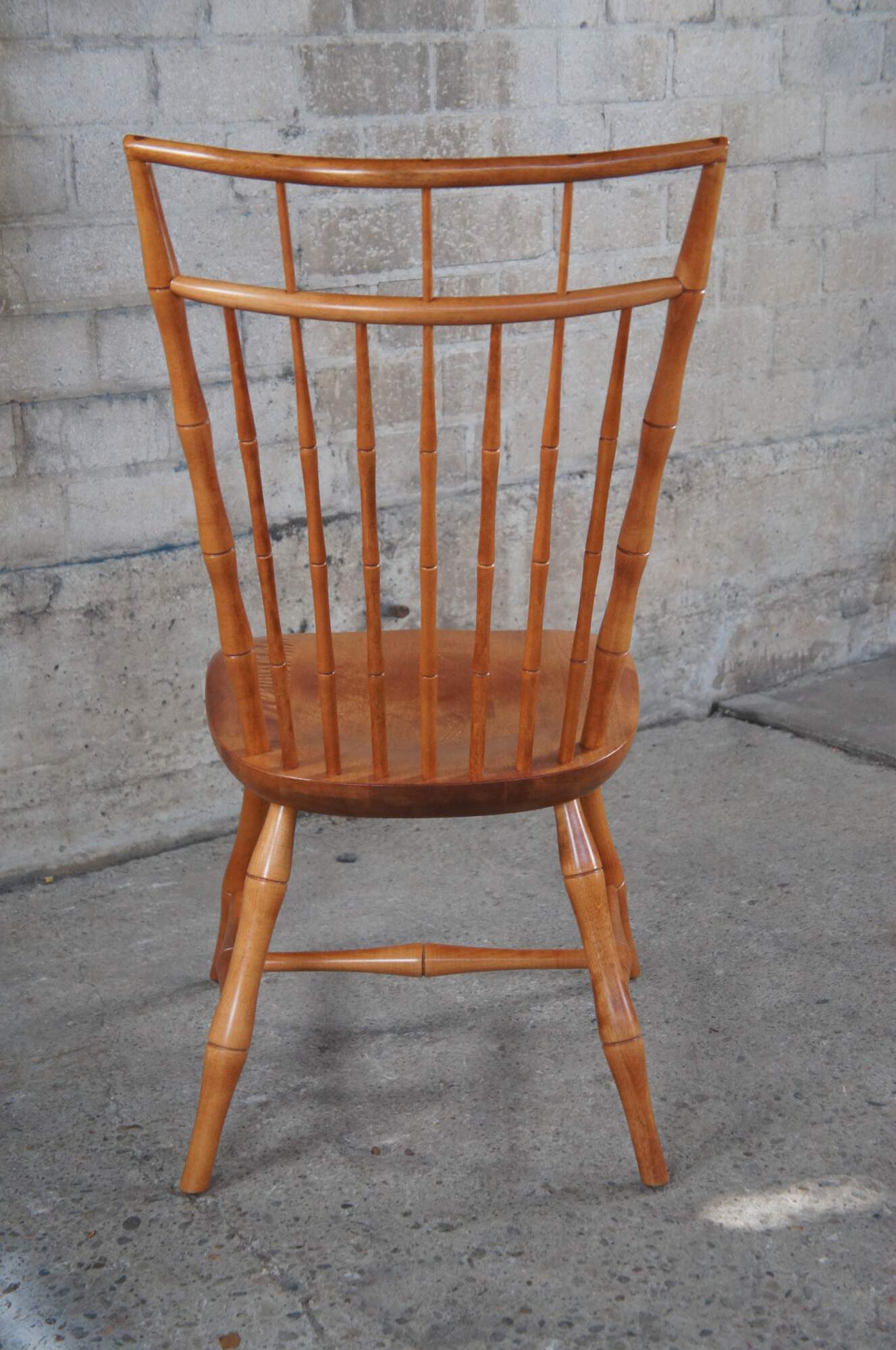 Six gorgeous birdcage Windsor style dining chairs manufactured by the Nichols & Stone Company. The chairs are expertly crafted of light maple with split wedge mortise and tenon joinery in the seats & top of the crest rails. Features bamboo shaped turned spindles and legs with a contoured seat and birg cage backing. Made in February of 1994