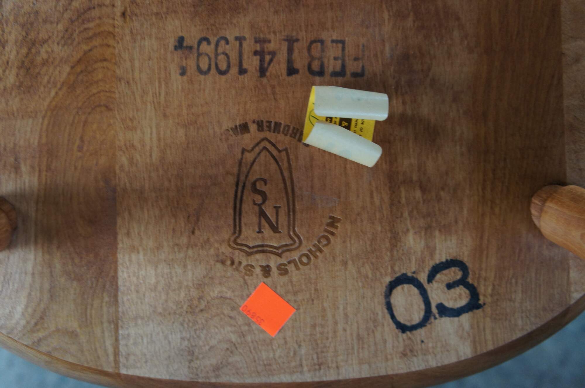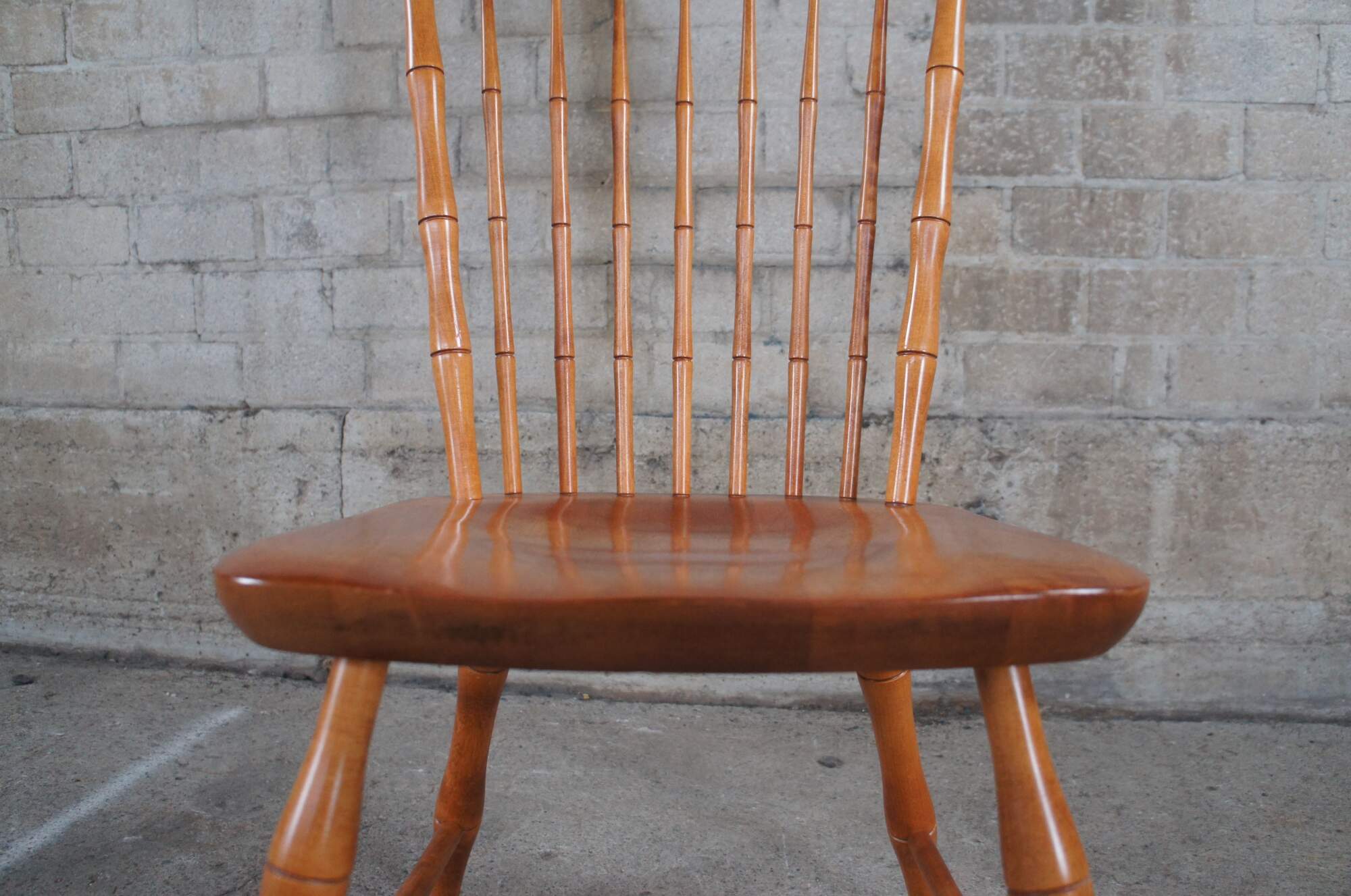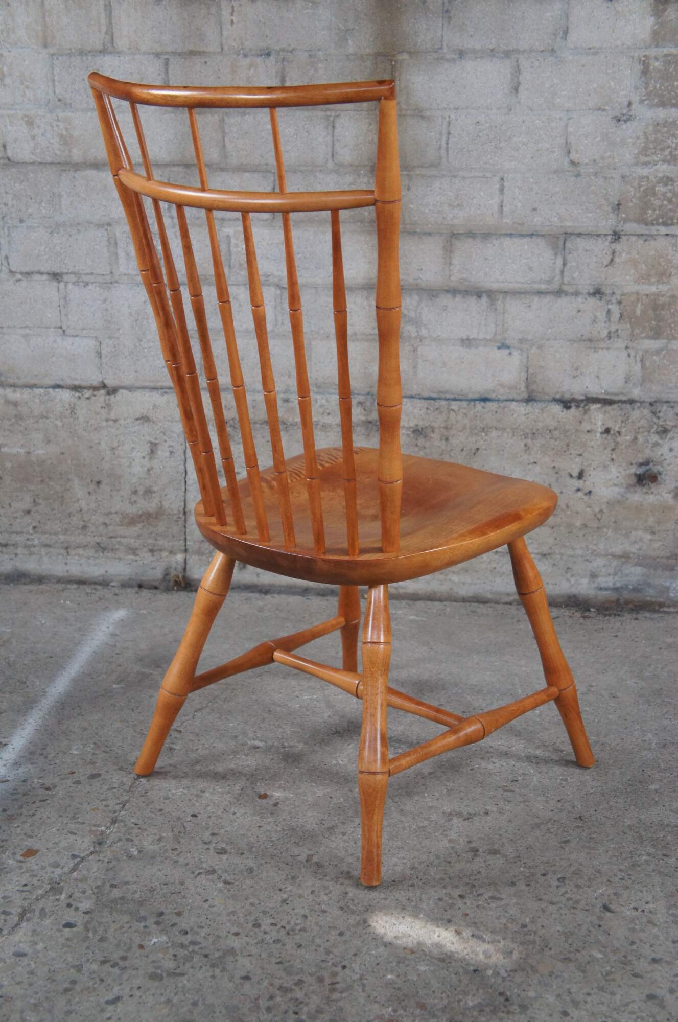 Six gorgeous birdcage Windsor style dining chairs manufactured by the Nichols & Stone Company. The chairs are expertly crafted of light maple with split wedge mortise and tenon joinery in the seats & top of the crest rails. Features bamboo shaped turned spindles and legs with a contoured seat and birg cage backing. Made in February of 1994
