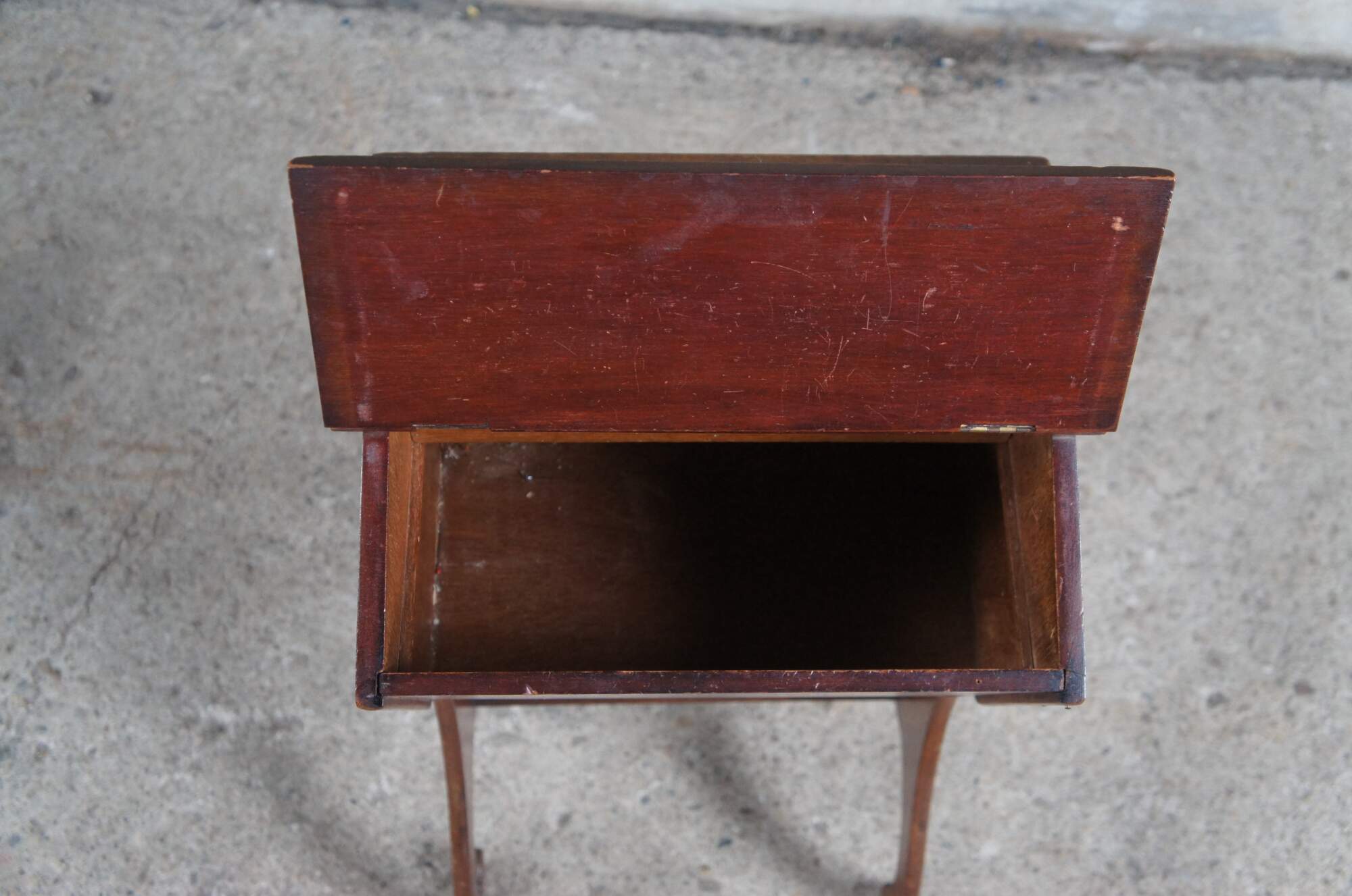 circa 1930s standing sewing box. Made from walnut with a slanted lid that opens from each side leading down to a trestle base with scrolled feet. The interior includes a removable tray/ compartment.