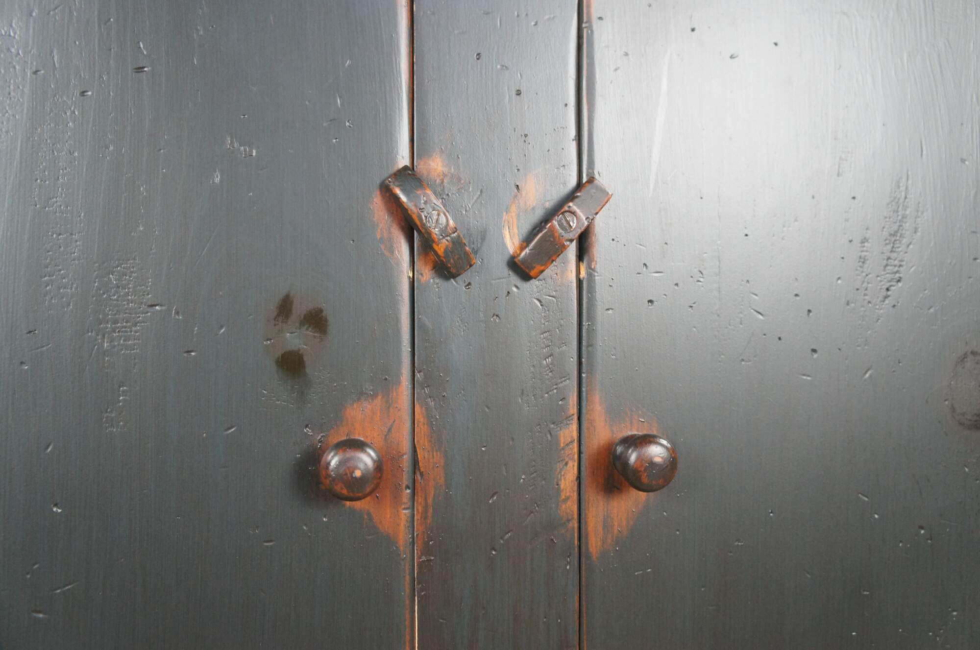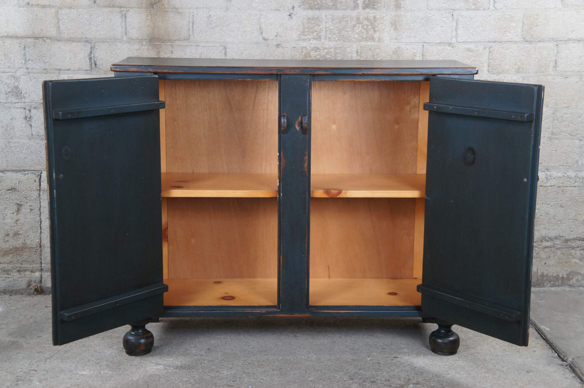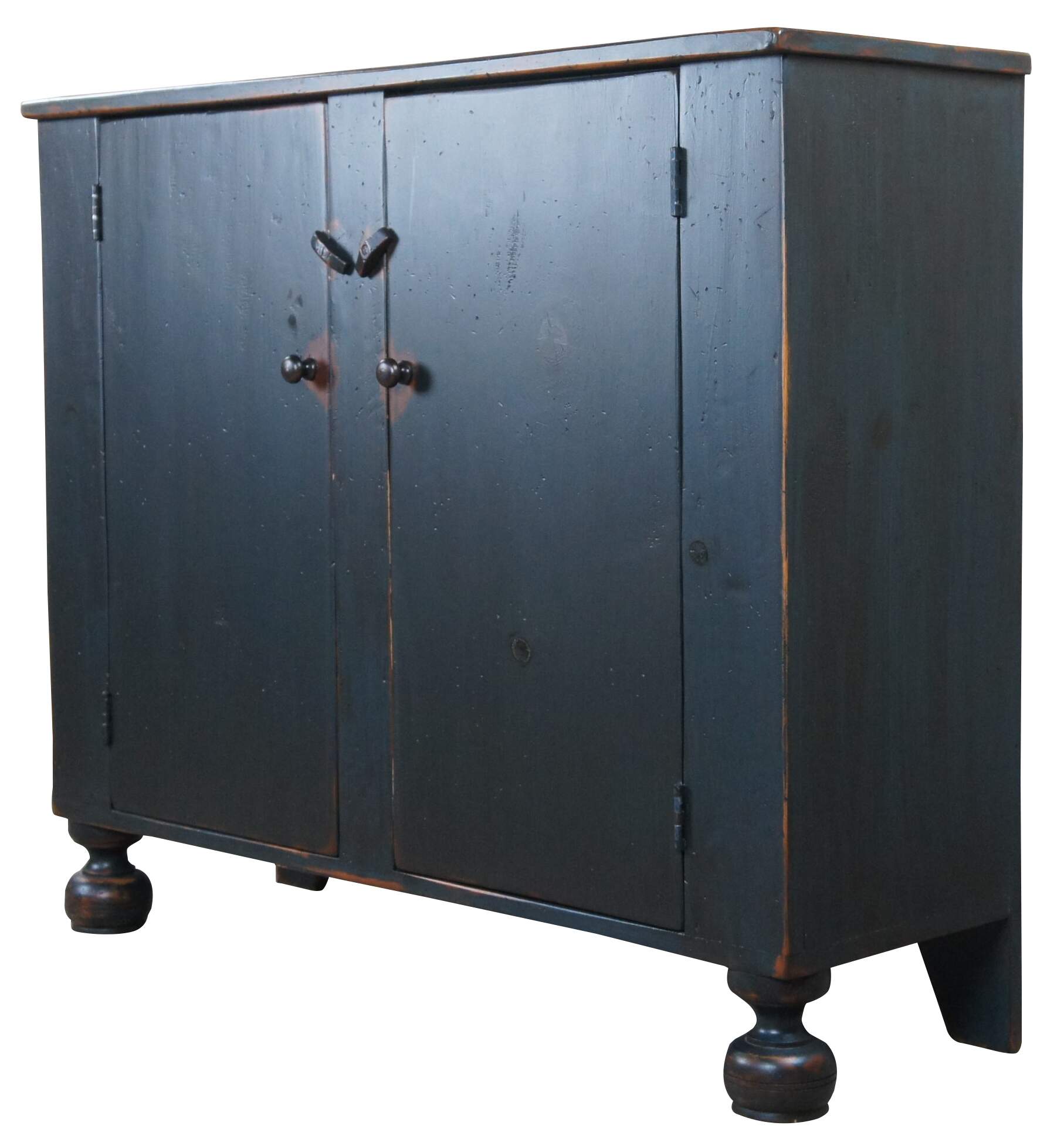 Circa 1970s Farmhouse Console Cabinet or cupboard. Made from distressed pine with a handpainted dark green finish. The two front doors are held shut via latches and open to a natural interior with one shelf. The cabinet is supported by four feet with bun feet at the front. Features a (removable) brass eagle hook or towel hanger along the left side.