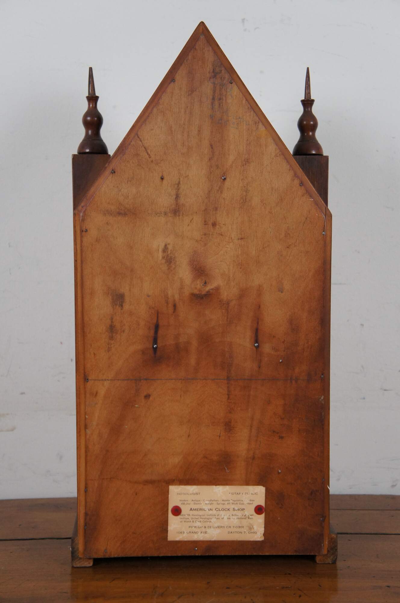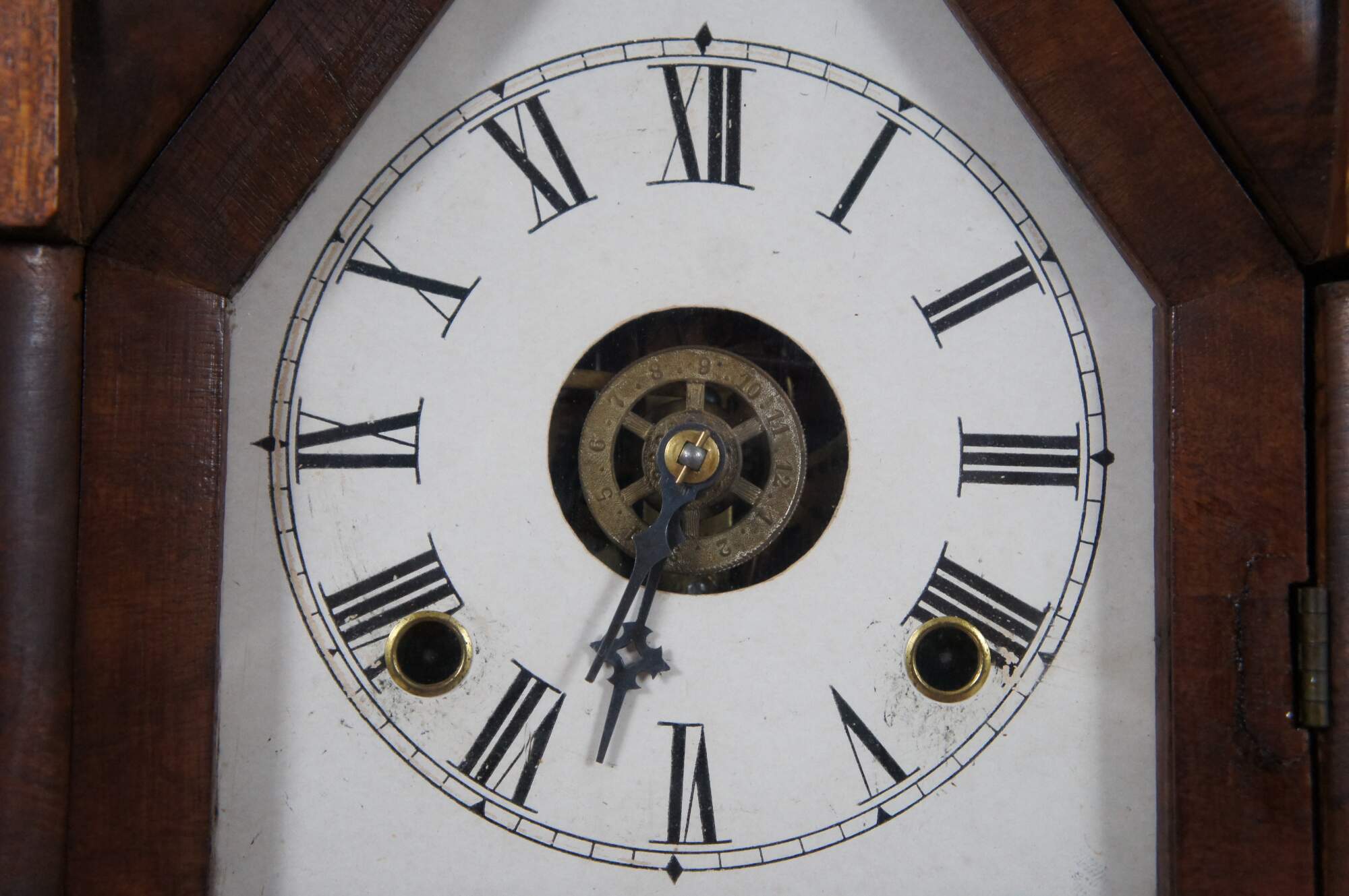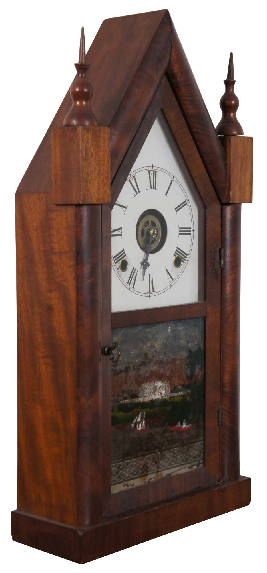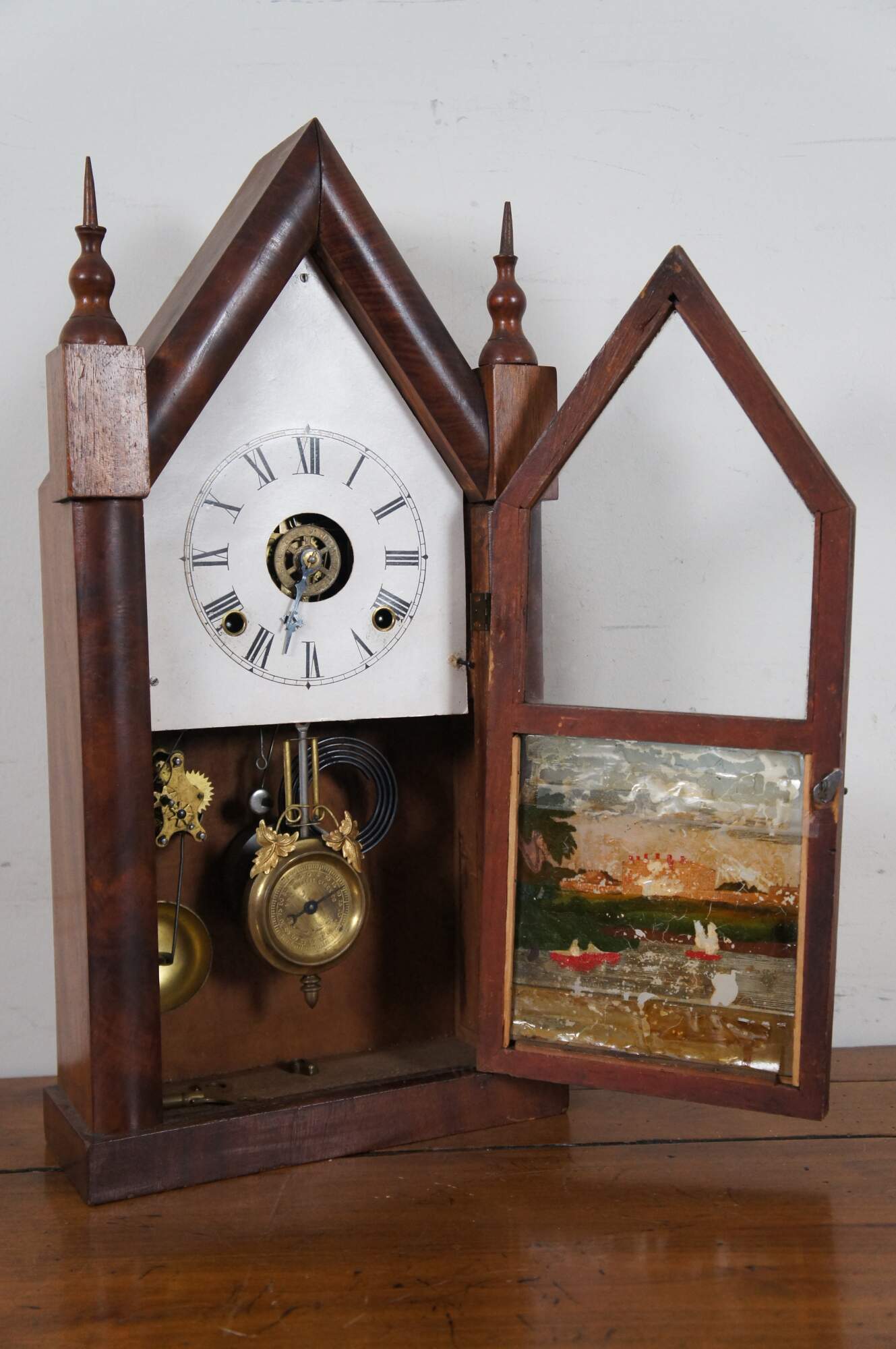 Antique 19th century mahogany cathedral / steeple Gothic Revival mantel clock by William L Gilbert Clock Company, with Roman numeral face and reverse painted scene on the door that features a large estate / castle / palace overlooking a body of water with a sailboat and fishing boats.