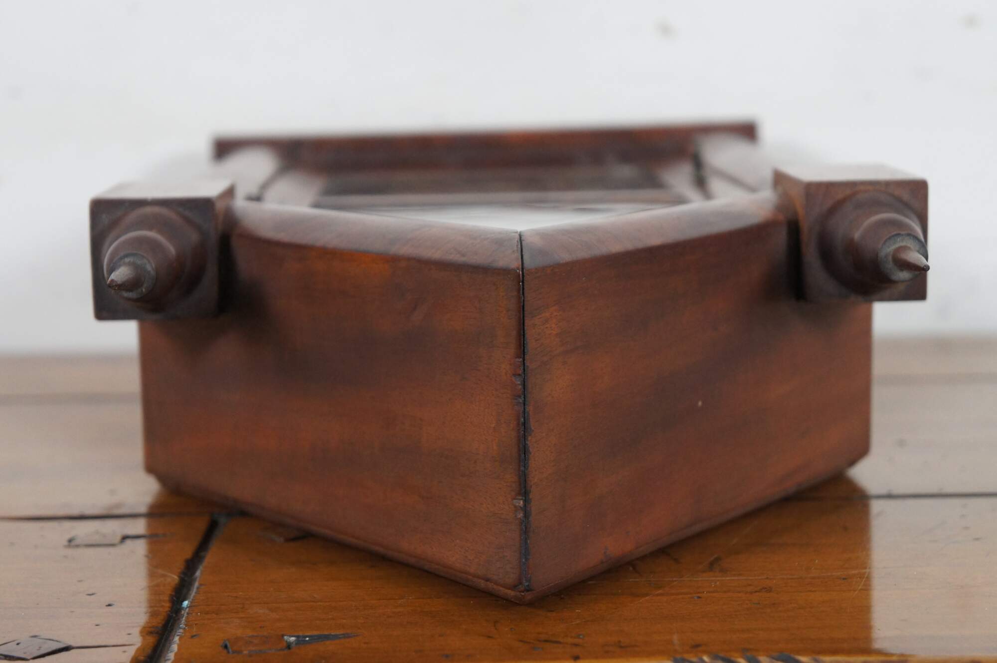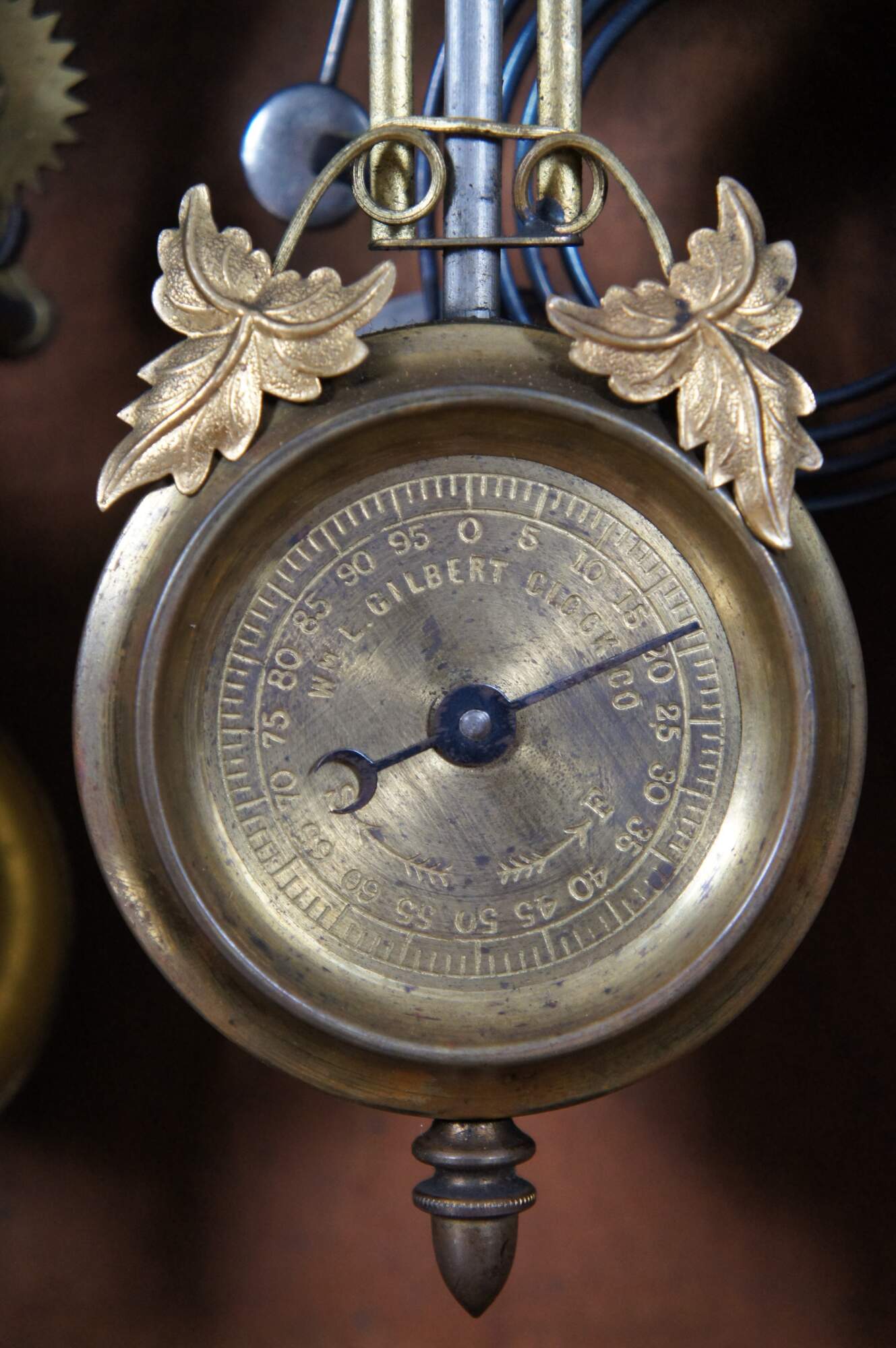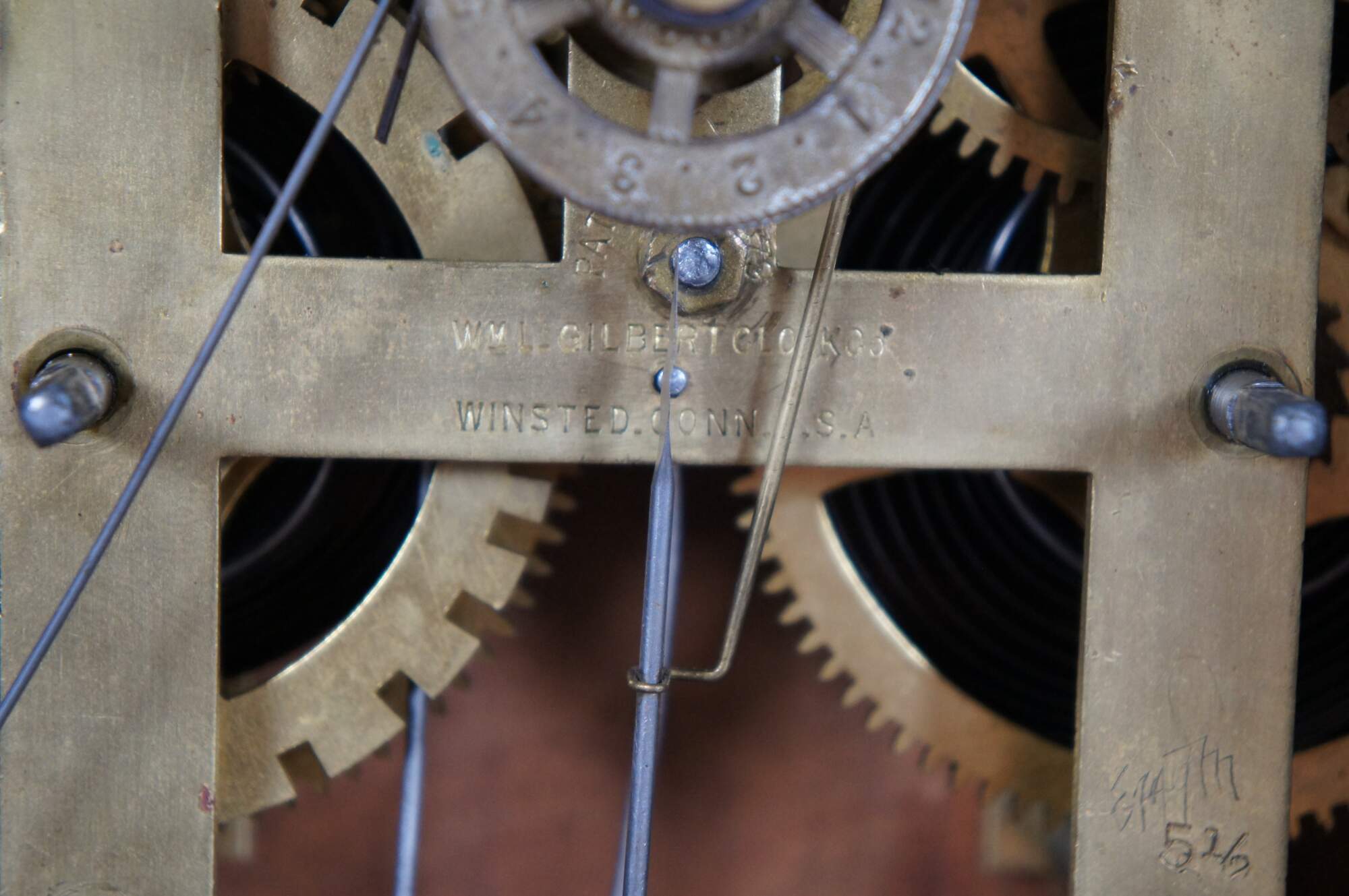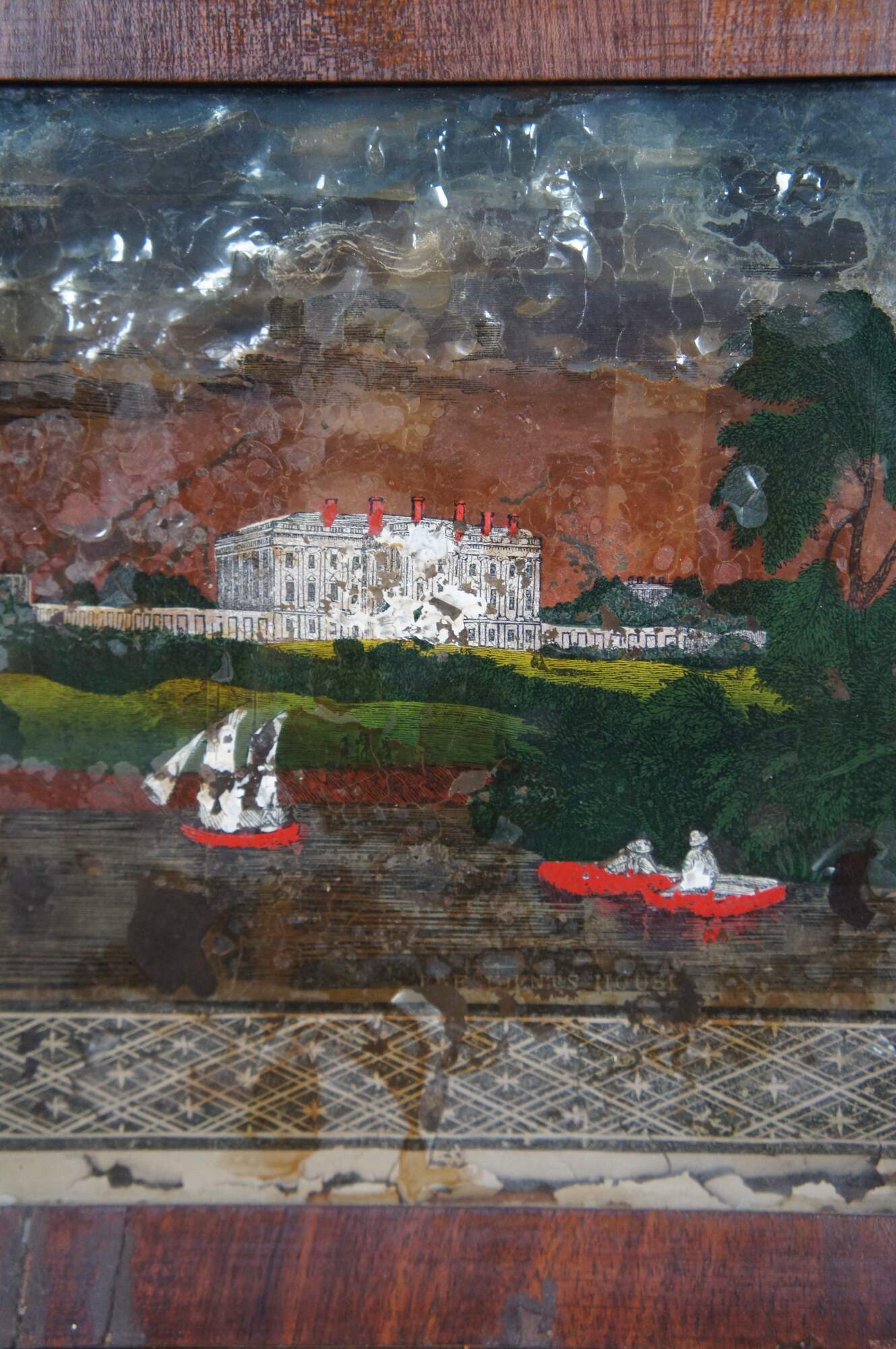 Antique 19th century mahogany cathedral / steeple Gothic Revival mantel clock by William L Gilbert Clock Company, with Roman numeral face and reverse painted scene on the door that features a large estate / castle / palace overlooking a body of water with a sailboat and fishing boats.