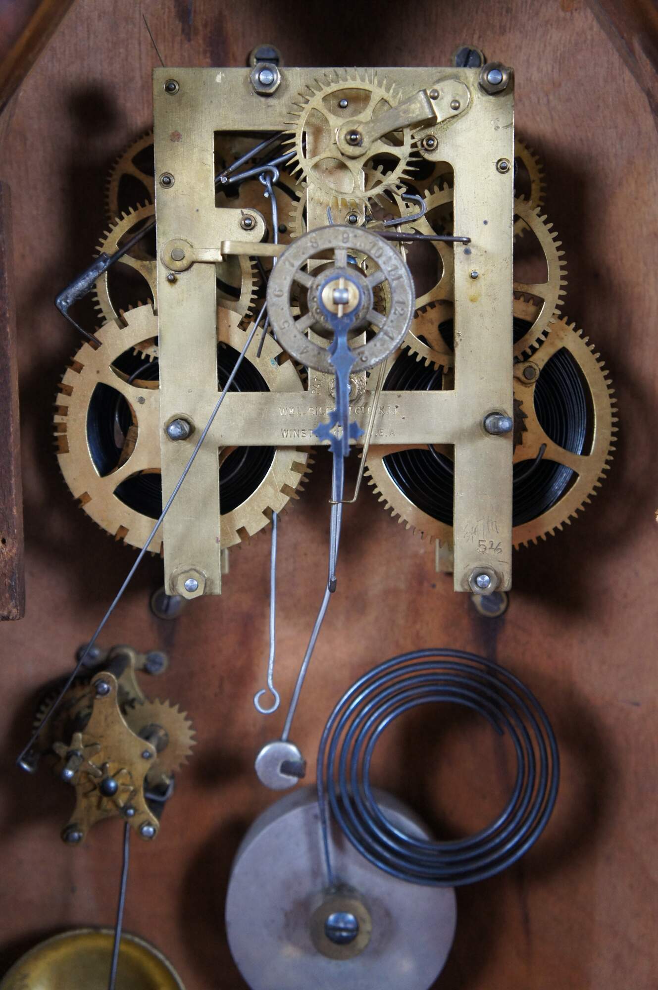 Good Overall - Working, some wear to door/partly detached hinge; gentle wear/stains to face; tarnish to pendulum; flaking/chipping to paint - some attempts to preserve image with tape.