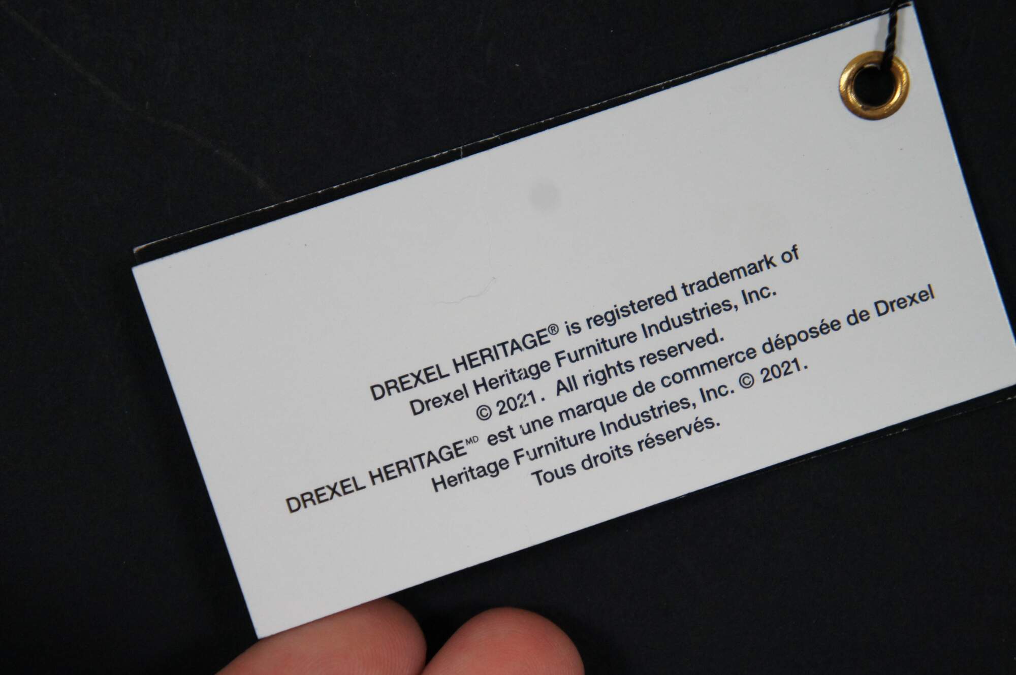 Large square Drexel Heritage wall clock with a beveled brass frame, Roman numerals and the words Berkeley Square, London 1733 on the face.