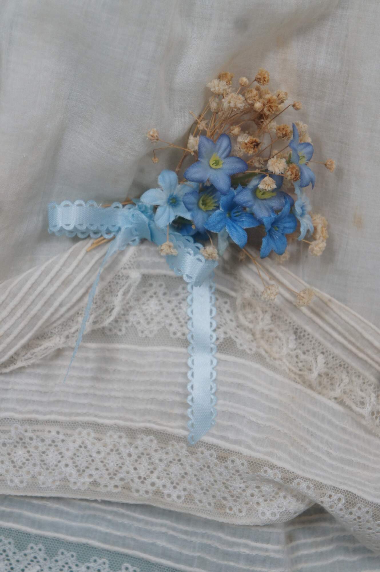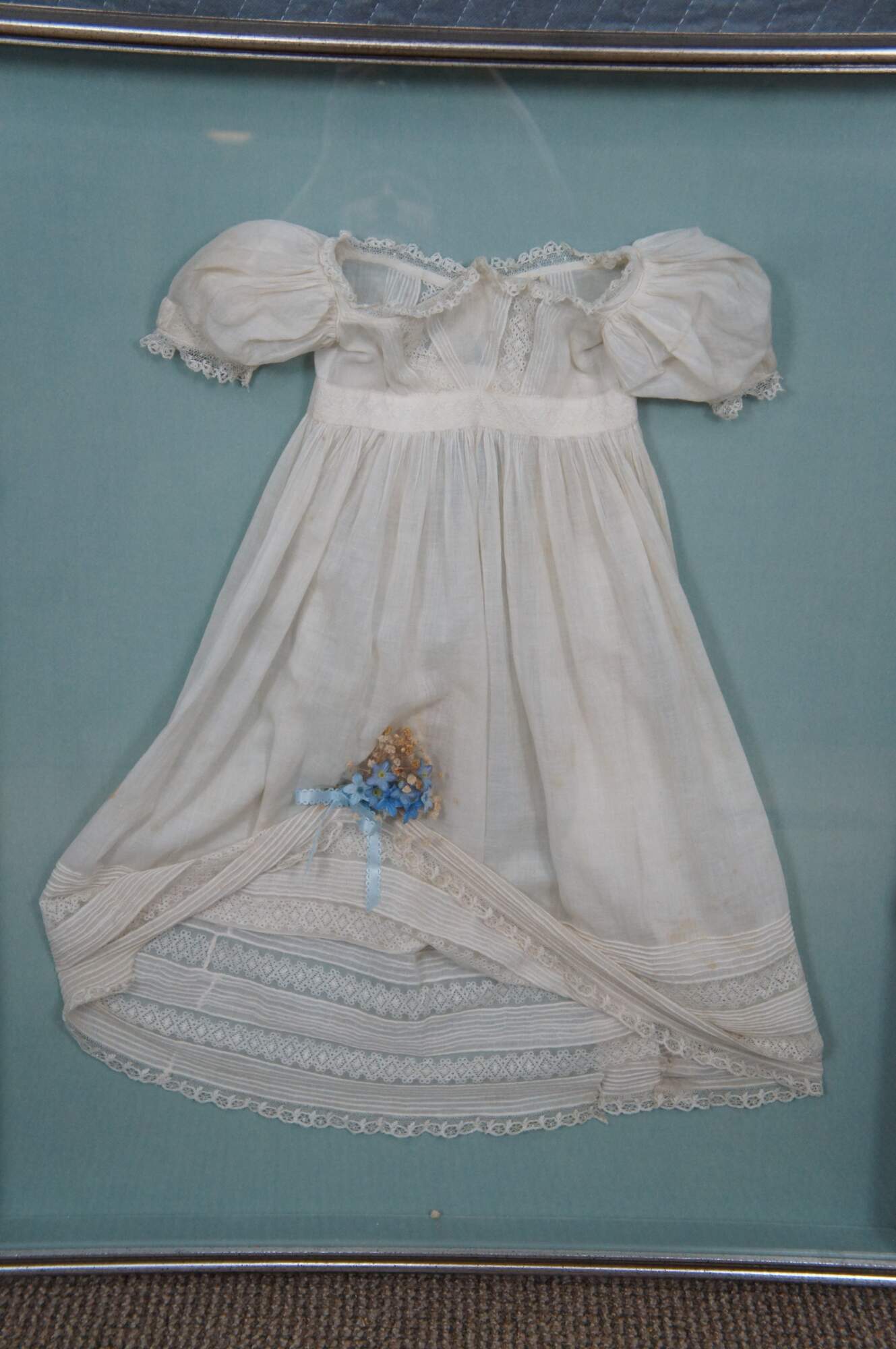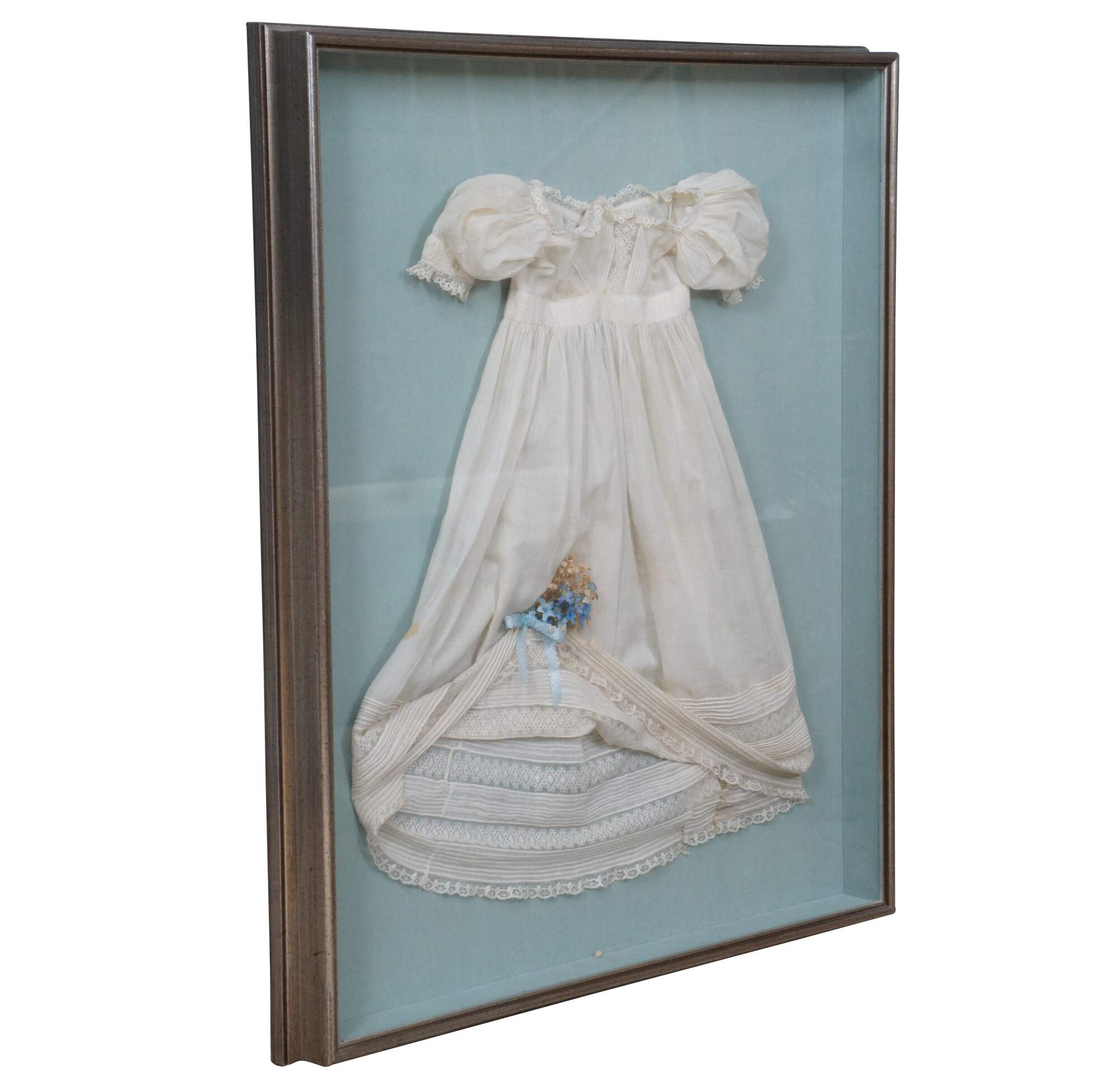 Early 19th century infant’s white lace trimmed christening gown, frame in a shadowbox with robin’s egg blue background and a small dried nosegay of baby’s breath and blue silk flowers.