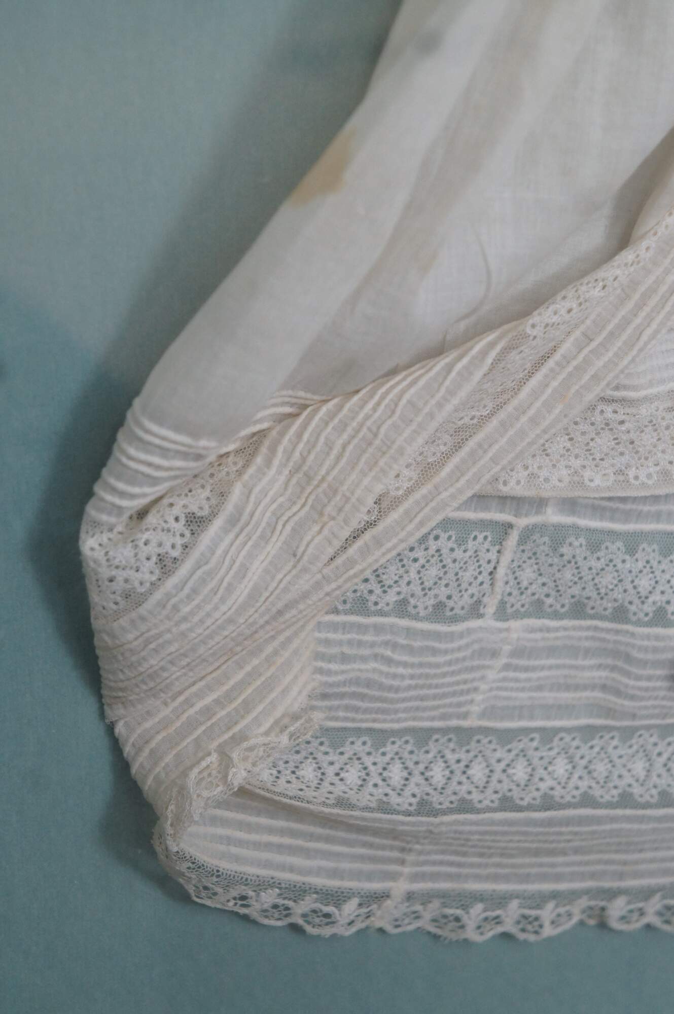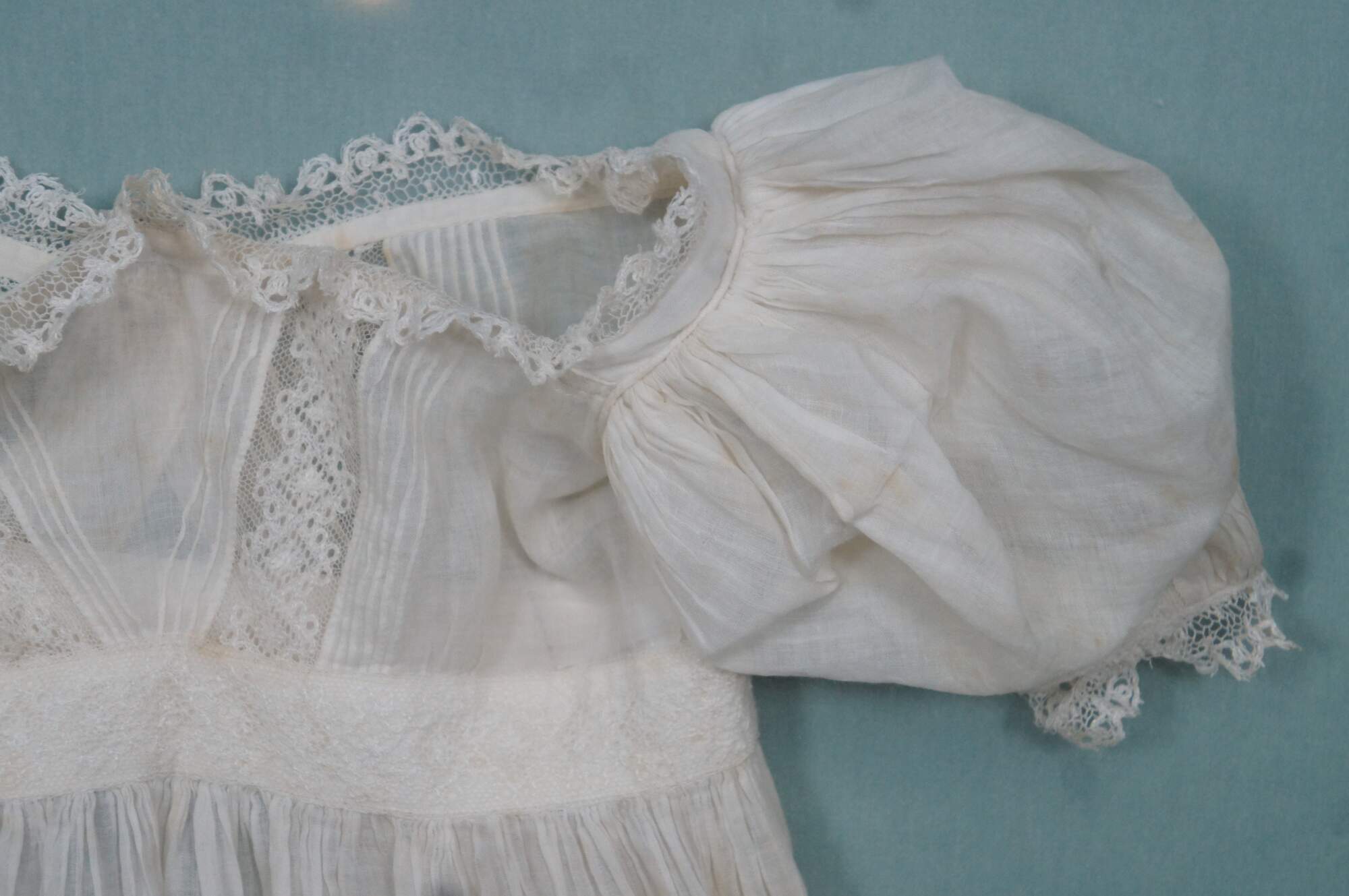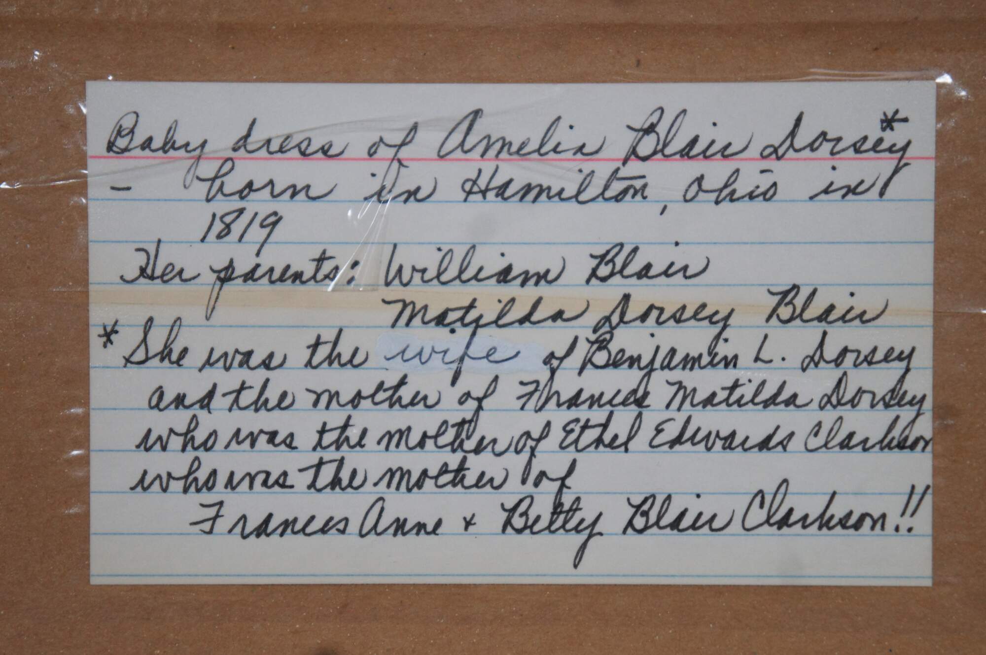 Family history on reverse dates dress to 1819. ""Baby dress of Amelia Blair Dorsey, born in Hamilton Ohio in 1819. Her parents, William Blair and Matilda Dorsey Blair. She was the wife of Benjamin L Dorsey, and the mother of Frances Matilda Dorsey who was the mother of Ethel Edwards Clarkson, who was the mother of Frances Anne and Betty Blair Clarkson.