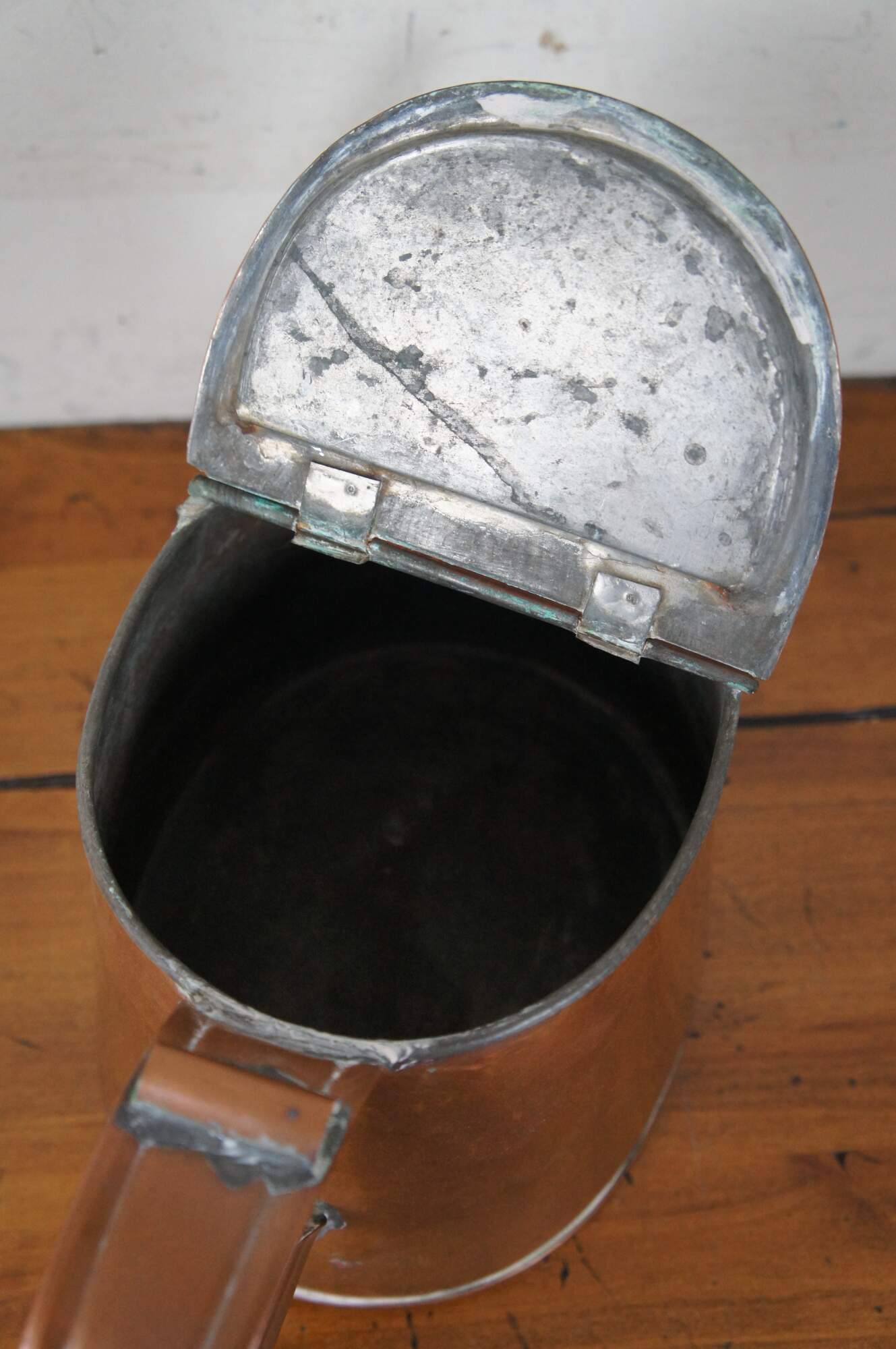Antique 19th century copper tea kettle with oval body, straight spout, large flip top opening, hefty handle and brass ring at the front.