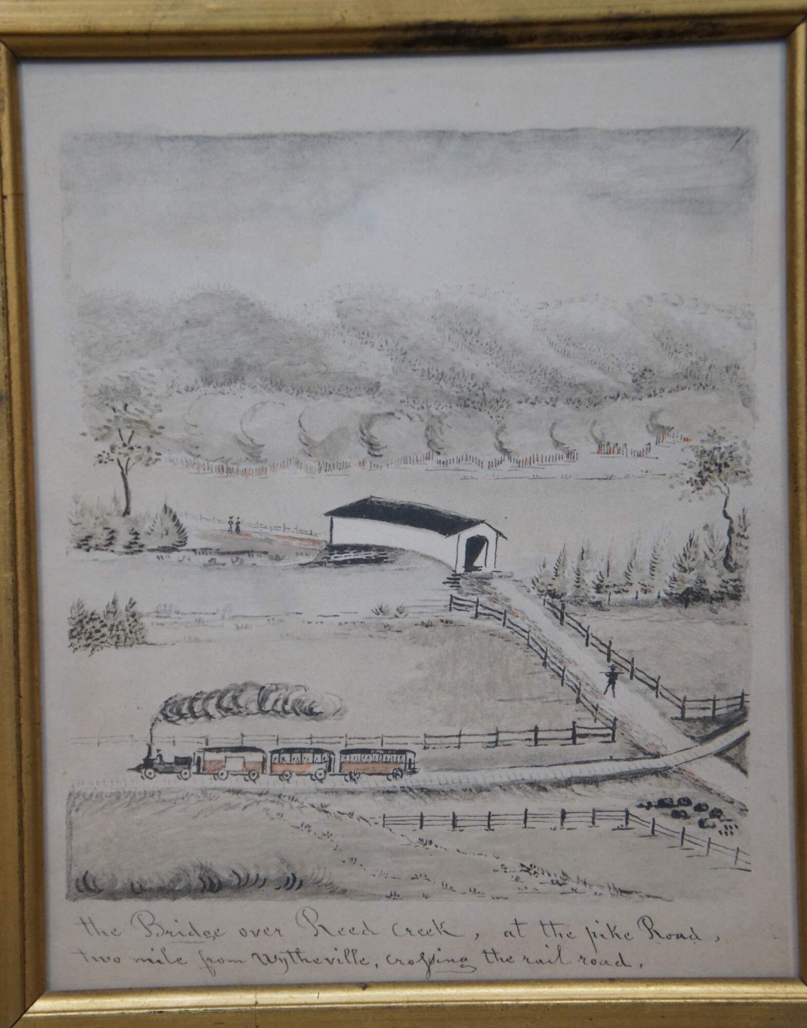 Set of 4 antique hand colored folk art style prints by Lewis Miller. Set includes The Residence of Mr. Croctett in Wytheville. July 1th, 1856; The New Presbyterian Church, Build in 1853; The Bridge over Reed Creek; and The Female Academy, in Christianburg May 15th, 1856.