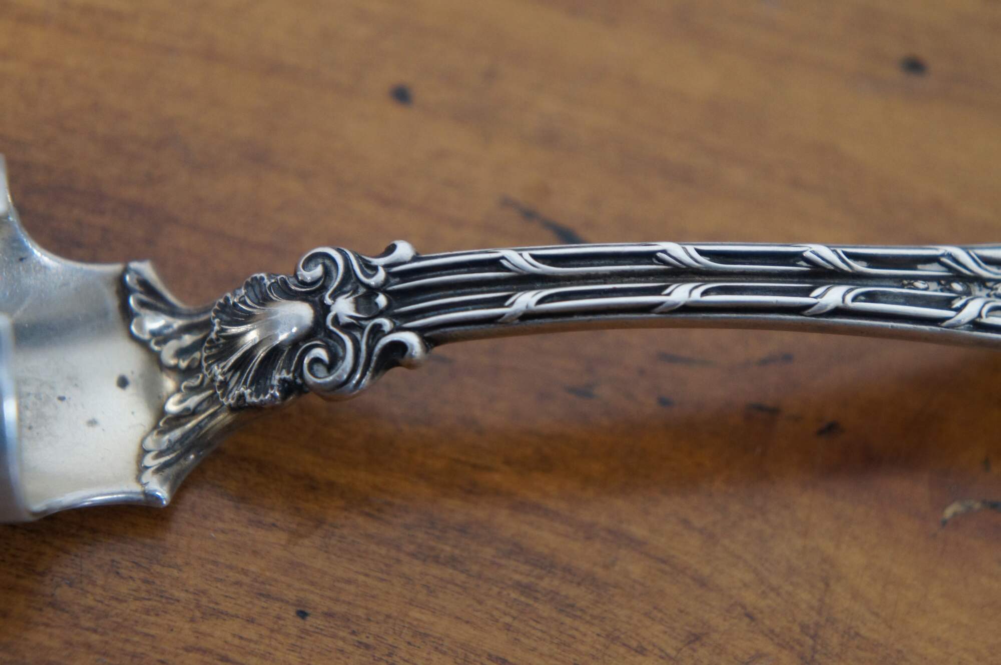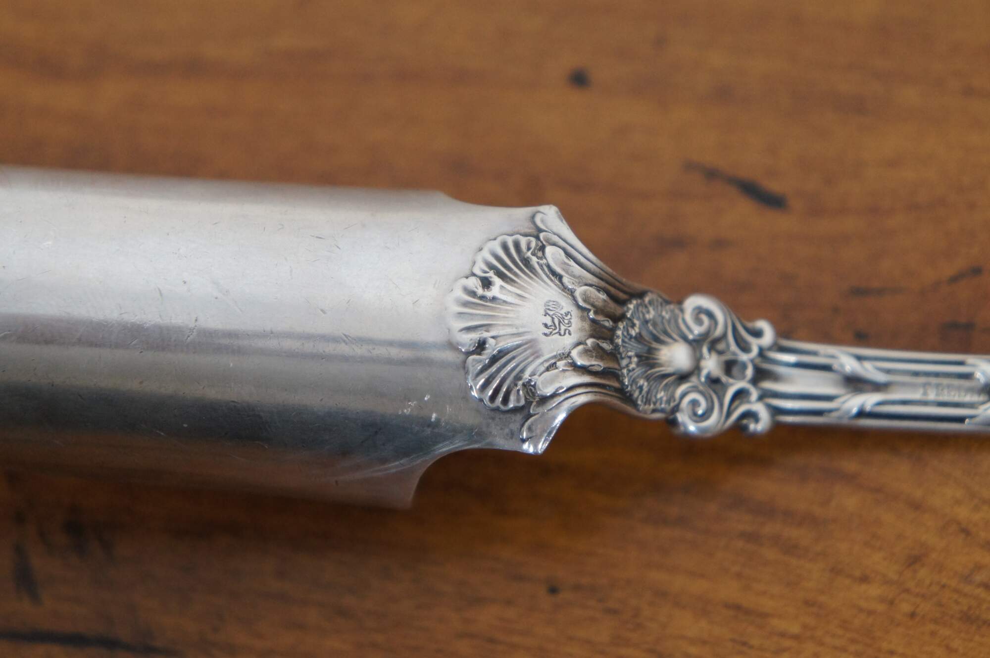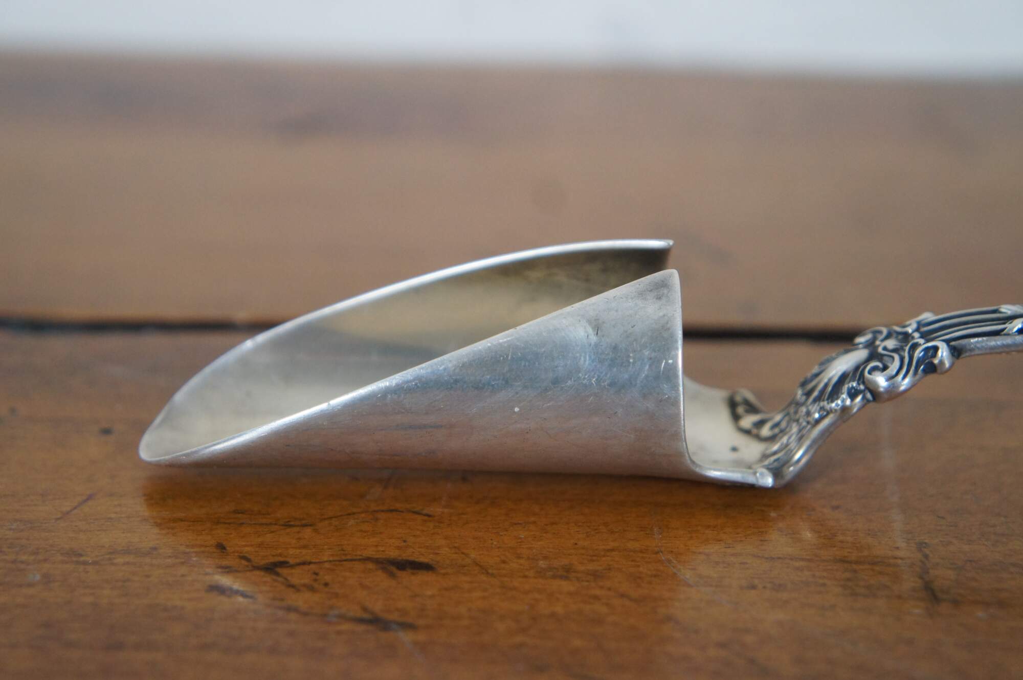 Antique Whiting sterling silver cheese scoop in the King Edward pattern (designed by Charles Osborne, first produced in 1901), monogrammed with the initial E. Circa 1920-30s