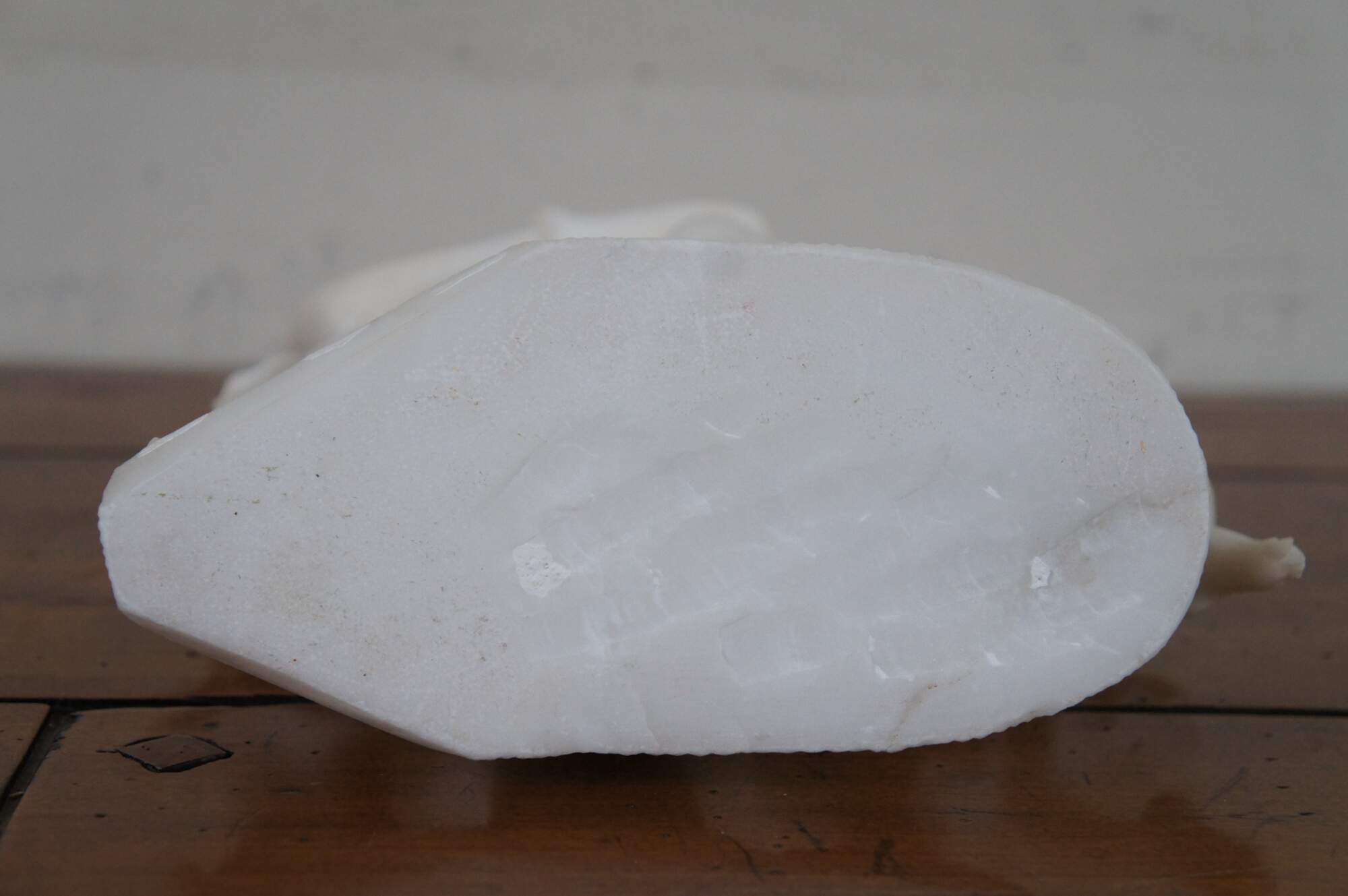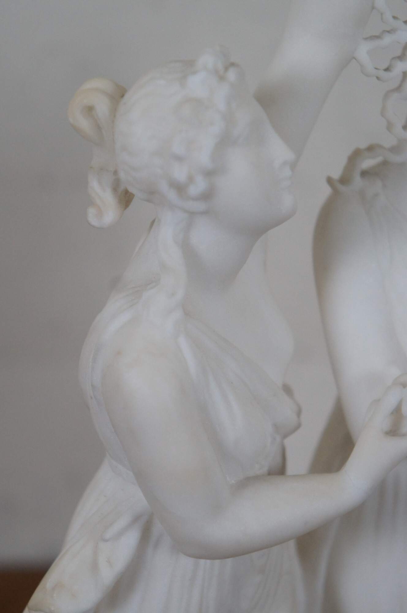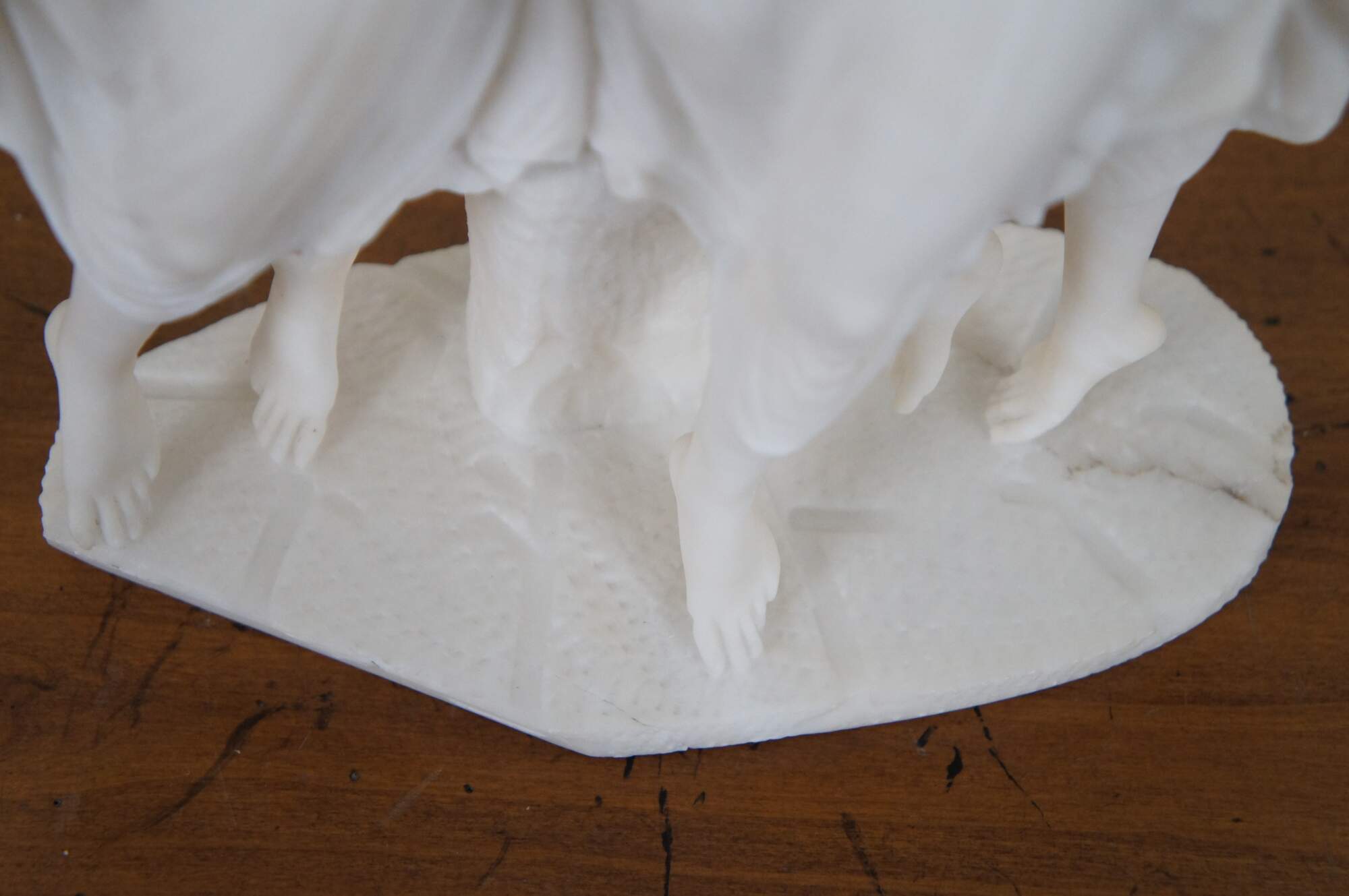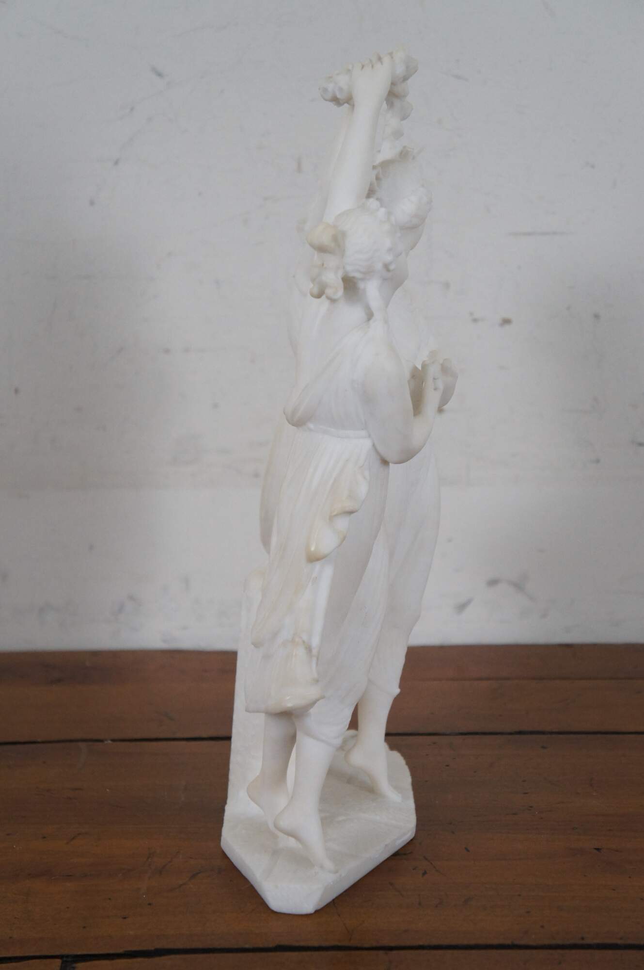 Vintage heavy alabaster / white marble neoclassical sculpture showing two Graces dancing and crowning the goddess Venus with flowers. This sculpture replicates the central group from “Venus and the Graces Dancing in the Presence of Mars” by Antonio Canova. The great neo-classical sculptor originally produced this composition in tempera on paper and in sculptural relief, long before the idea for his famous sculpture of The Three Graces was presented to him by the Empress Josephine in 1812. Canova conceived the image between 1794 and 1799 and it is not known whether the painting or the relief was the primary version. Both are in the collections at Possagno and depict the same composition, showing the three daughters of Zeus and Euryonome: Euphrosyne, Aglaia and Thalia, dancing with Venus before Mars. Aglaia plays music on her lyre, to which all four women dance on points. Her two sisters delicately balance a crown of flowers above Venus’s head. Whilst Mars is entranced a mischievous putto steals away his sword. As Hugh Honour notes, the adornment of Venus was described in the Homeric Hymn to Aphrodite and in Ovid’s Fasti, but no ancient image of the subject is known. Without antique prototype, Canova here draws upon on his own imaginative vision and his love of the theatre. The composition was designed for his own interest and only a few plaster casts of the relief were produced for particular friends and patrons.