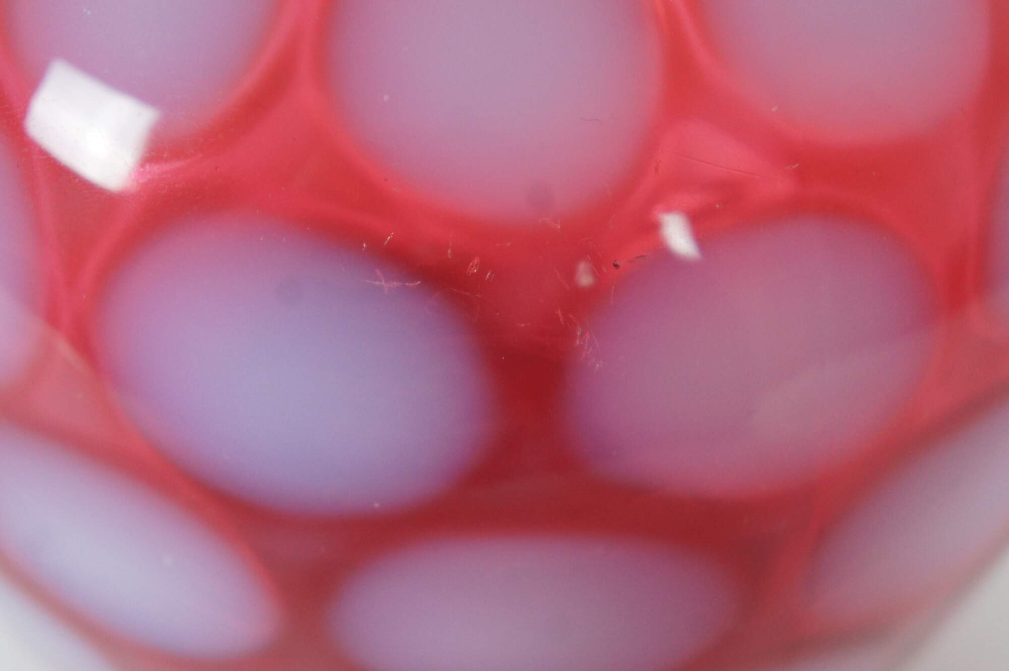 Vintage Fenton cranberry glass drink pitcher with opalescent white thumbprint / coin dots, clear handle, and crimped top.