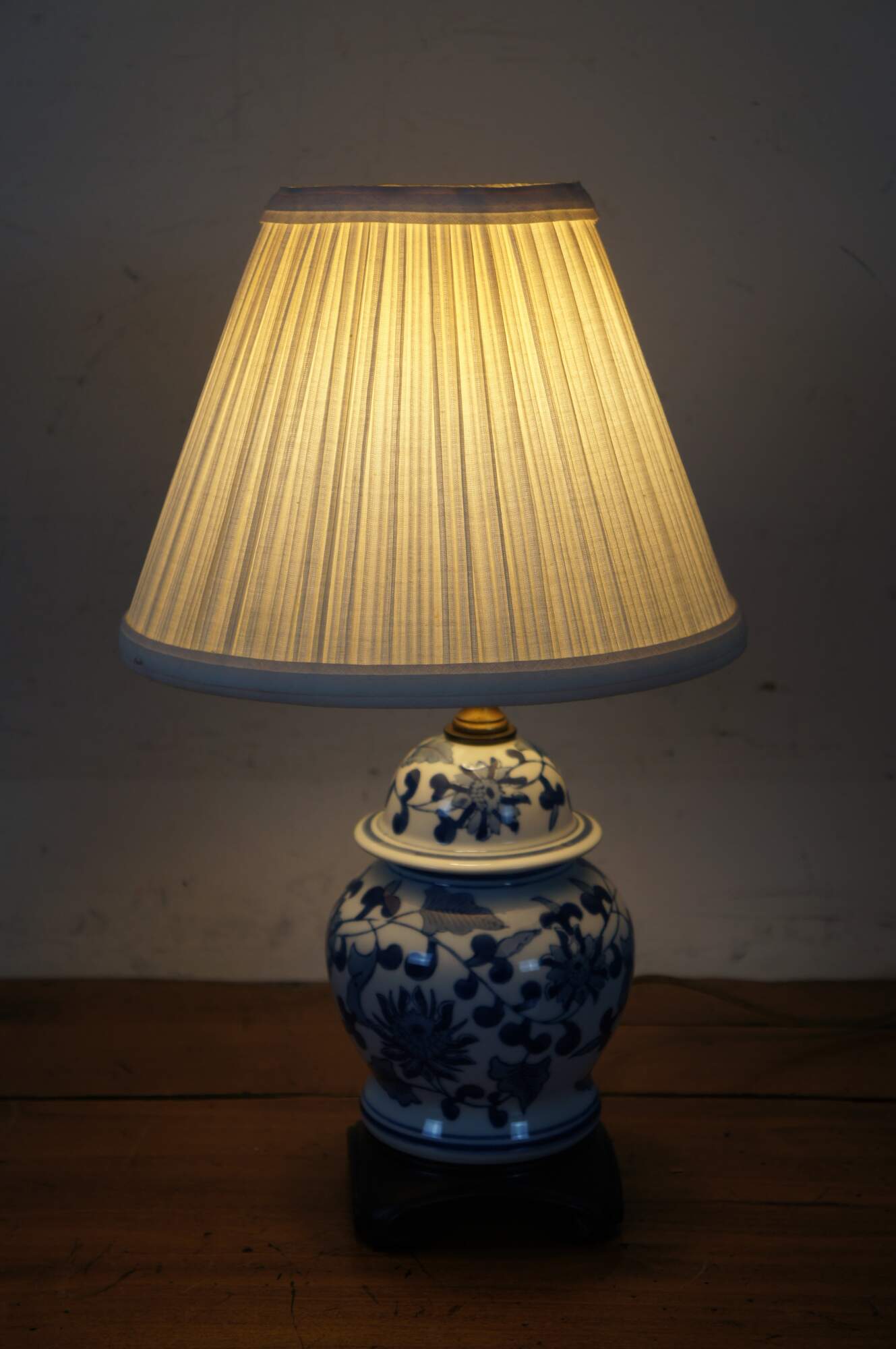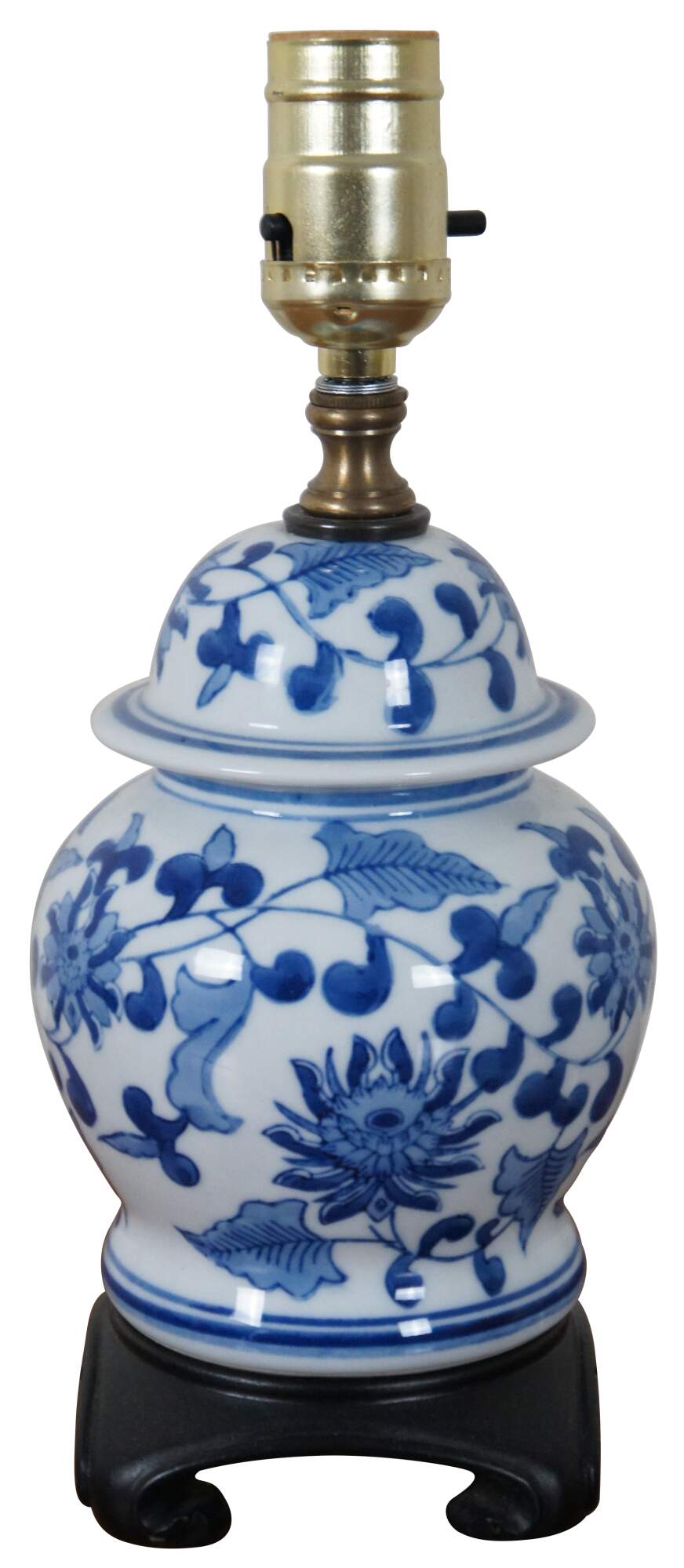 Vintage blue & white Chinese porcelain ginger jar shaped budoir / table lamp with dark wood base and white shade.