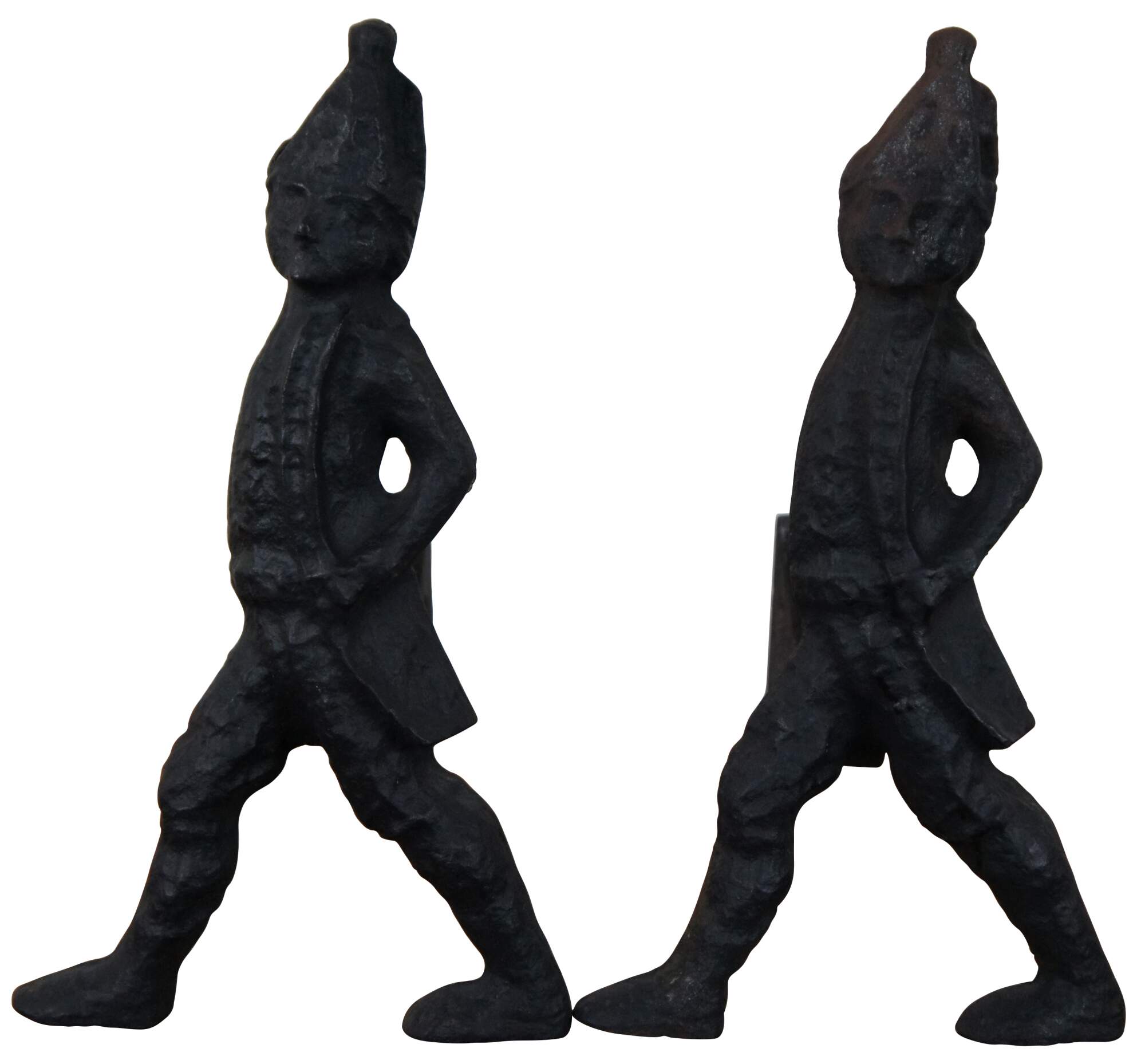 Antique Harvin Company cast iron firedogs / andirons, design number 1019 in the shape of 18th century style Hessian soldiers with removable supports. Also includes a fire poker and mantel hook for convenient hanging.