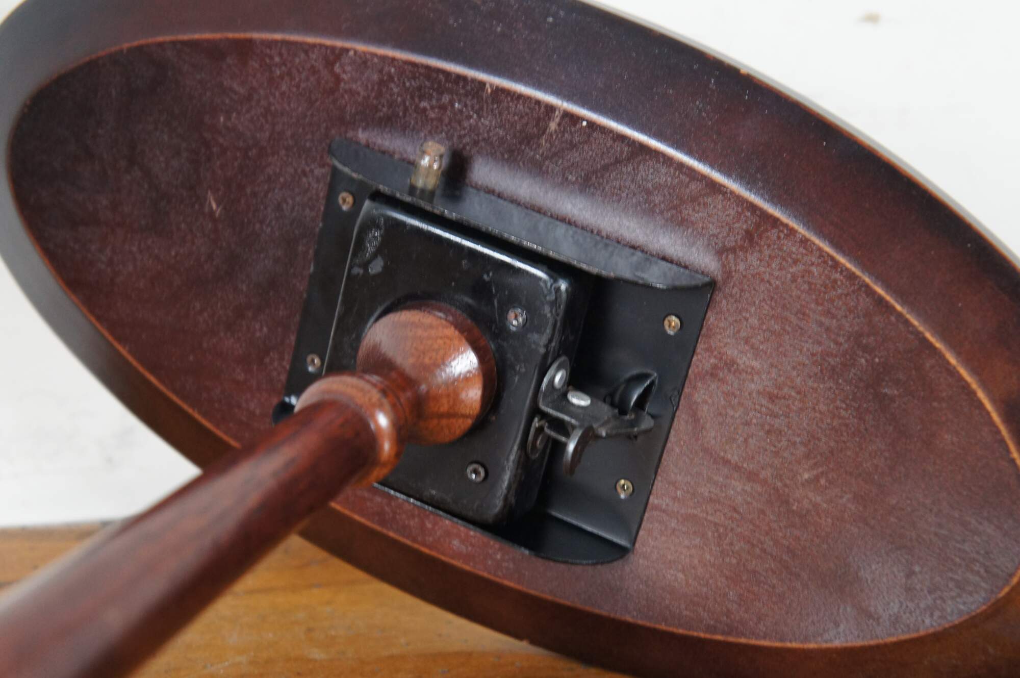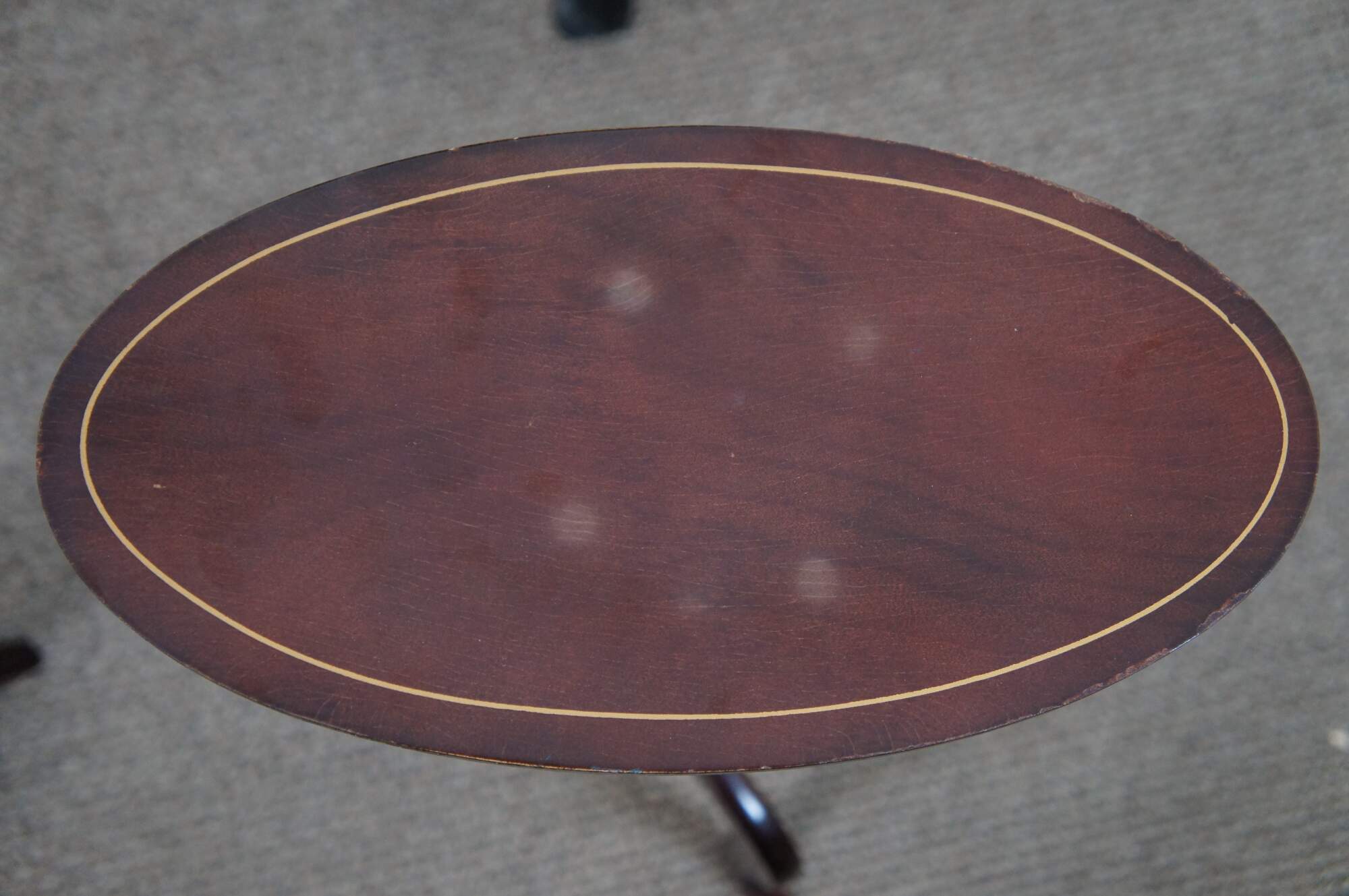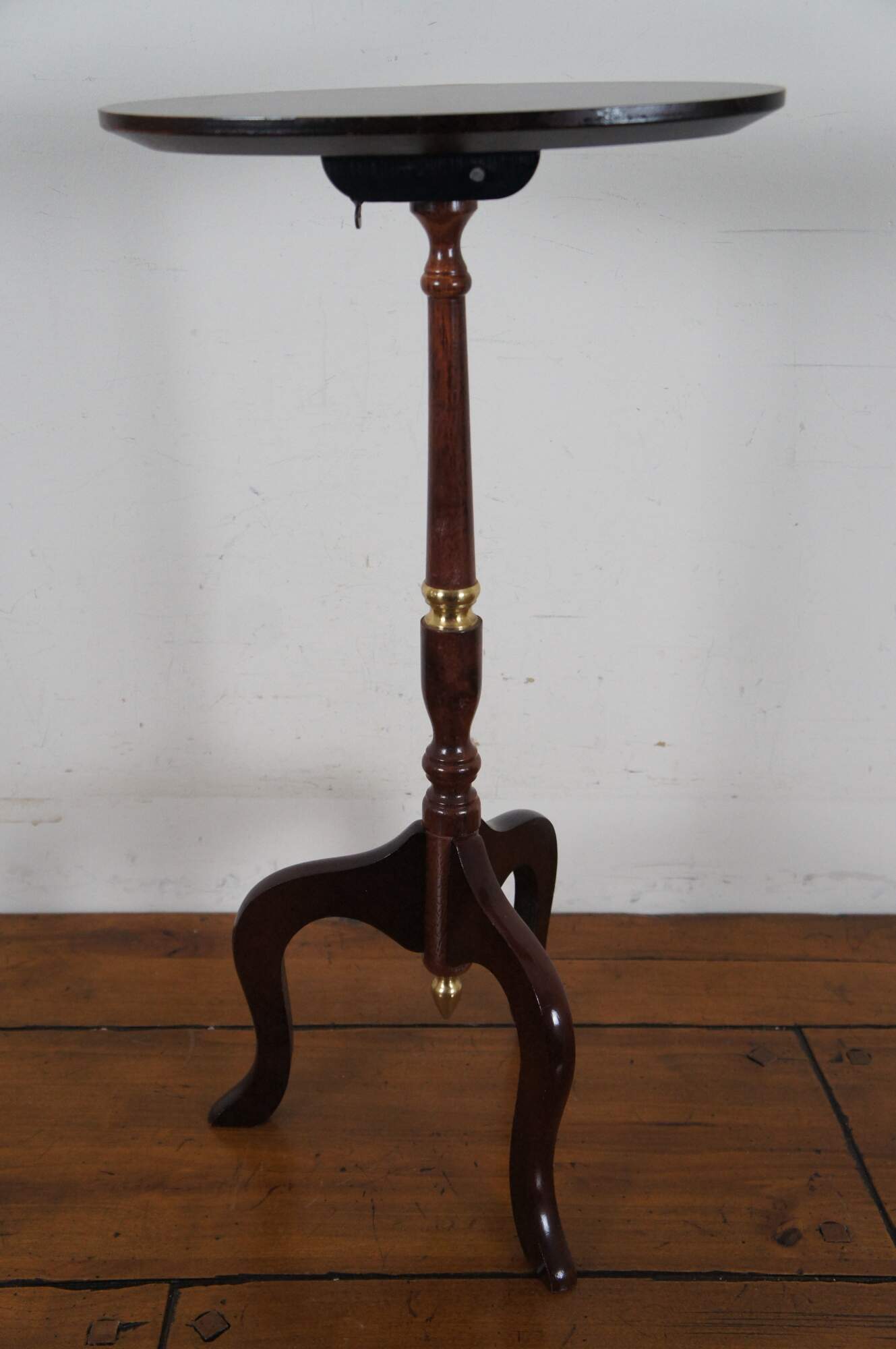 Pair of vintage Queen Anne style mahogany tilt top oval candle stands with inlaid top, tripod cabriole feet, central column and brass accents.
