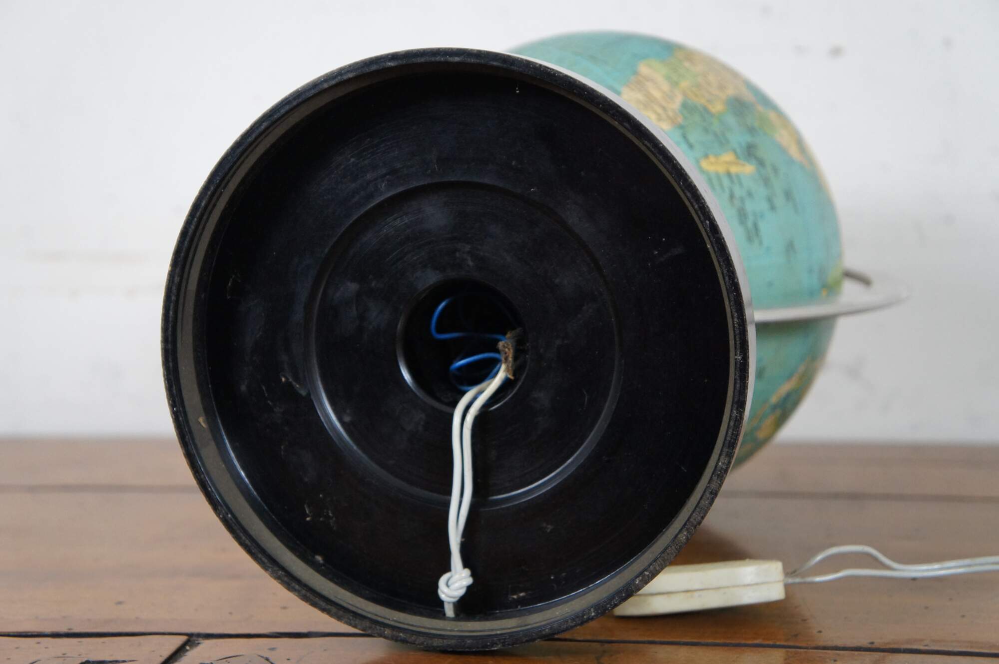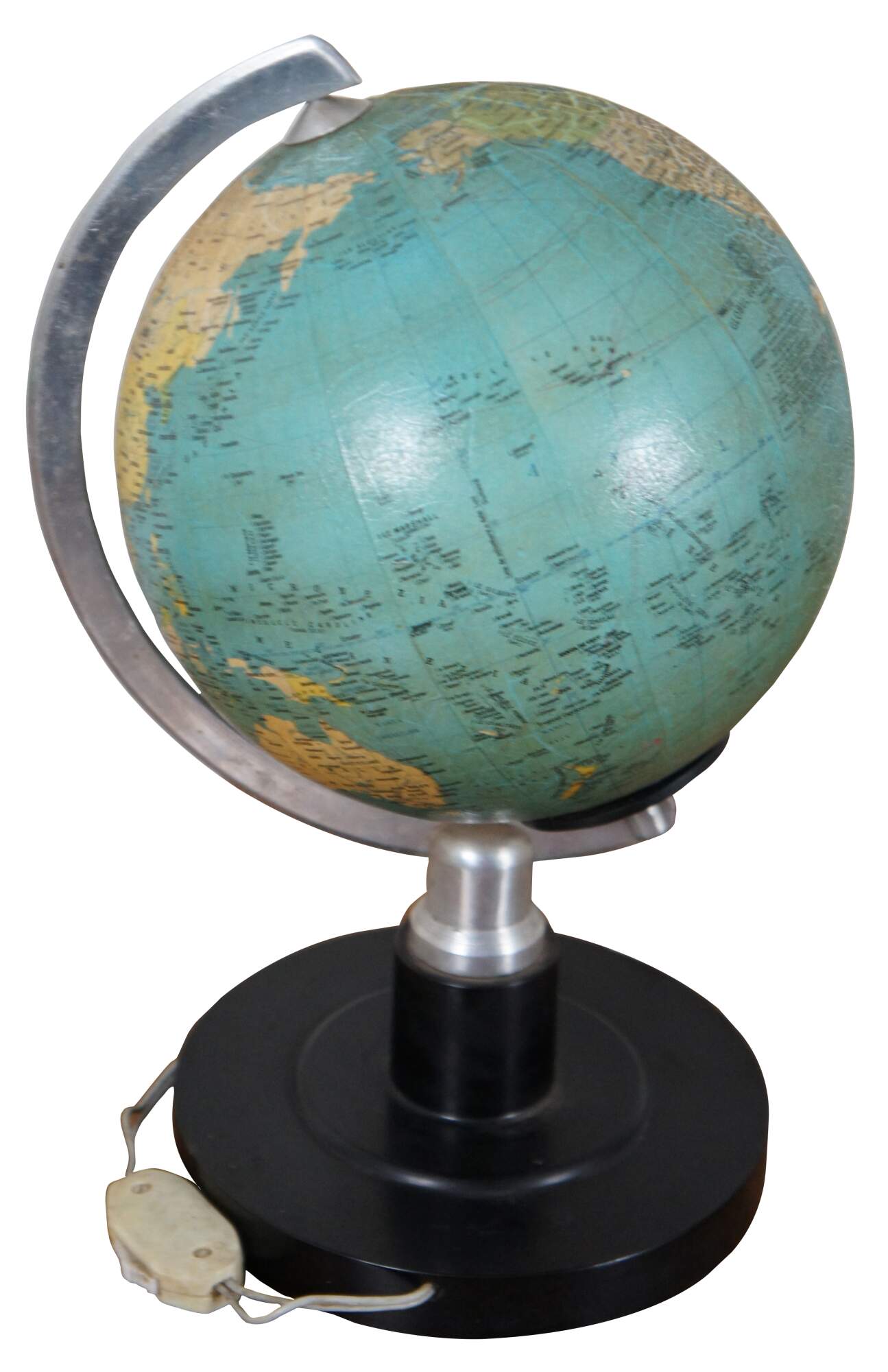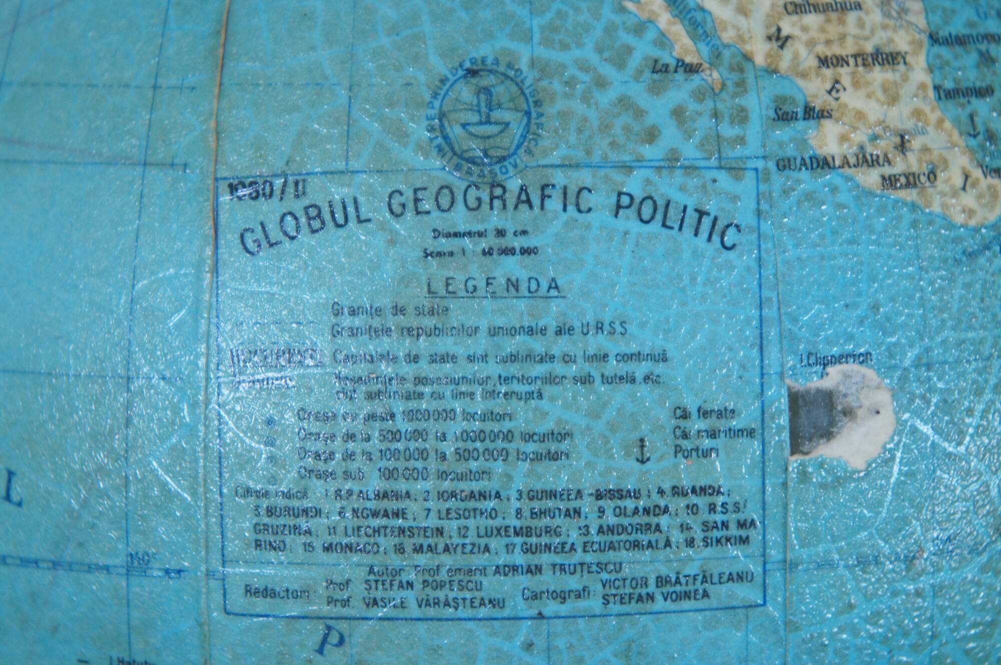 Illuminated 1980 / II Globul Geografic Politic (The Political Geographic Globe) published by the Intreprinderea Poligrafica (Polygraphic Company) of Brasov, Romania. Comprised of paper overlaid on a glass globe, mounted on a metal and plastic base. European plug.