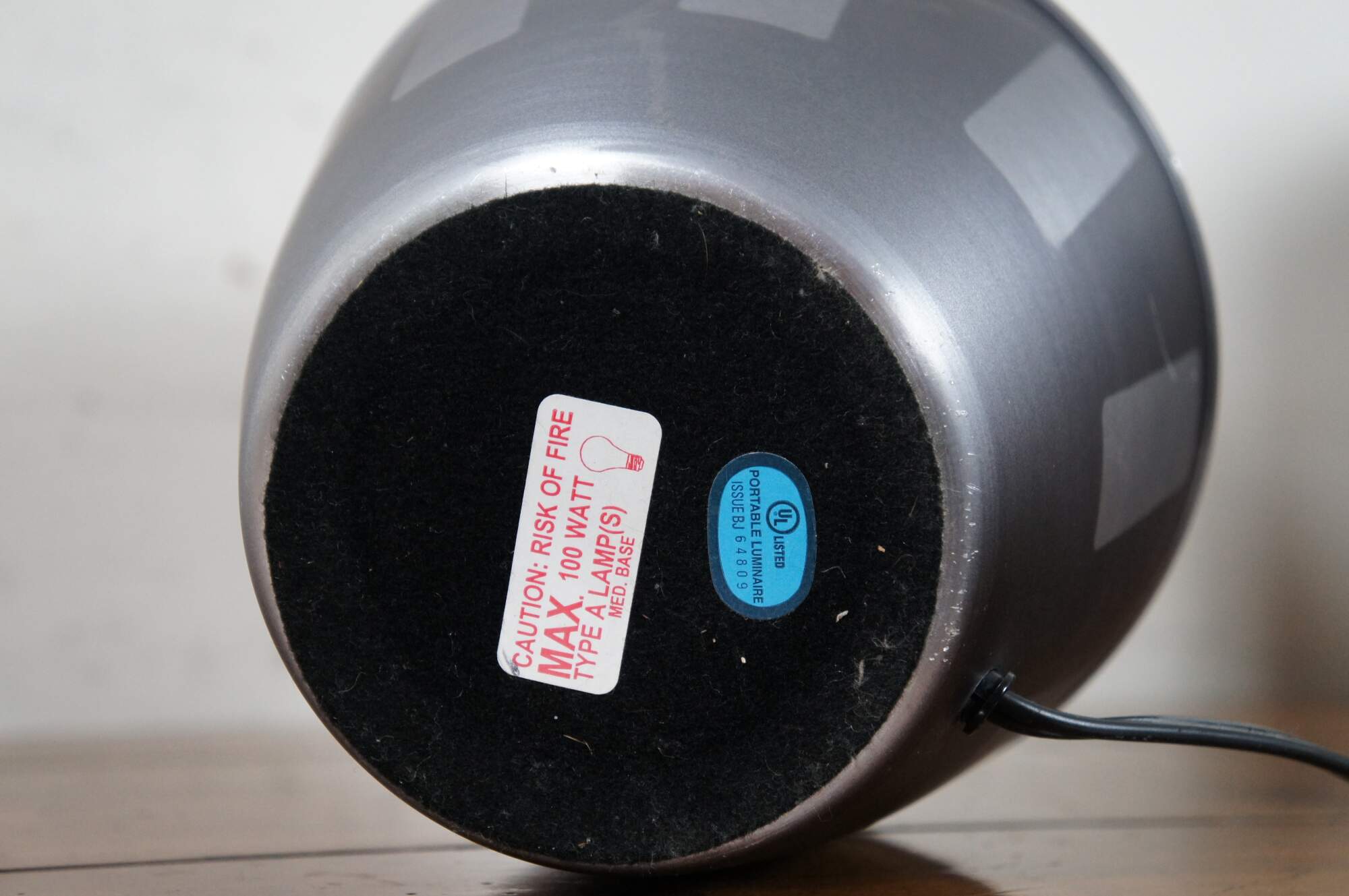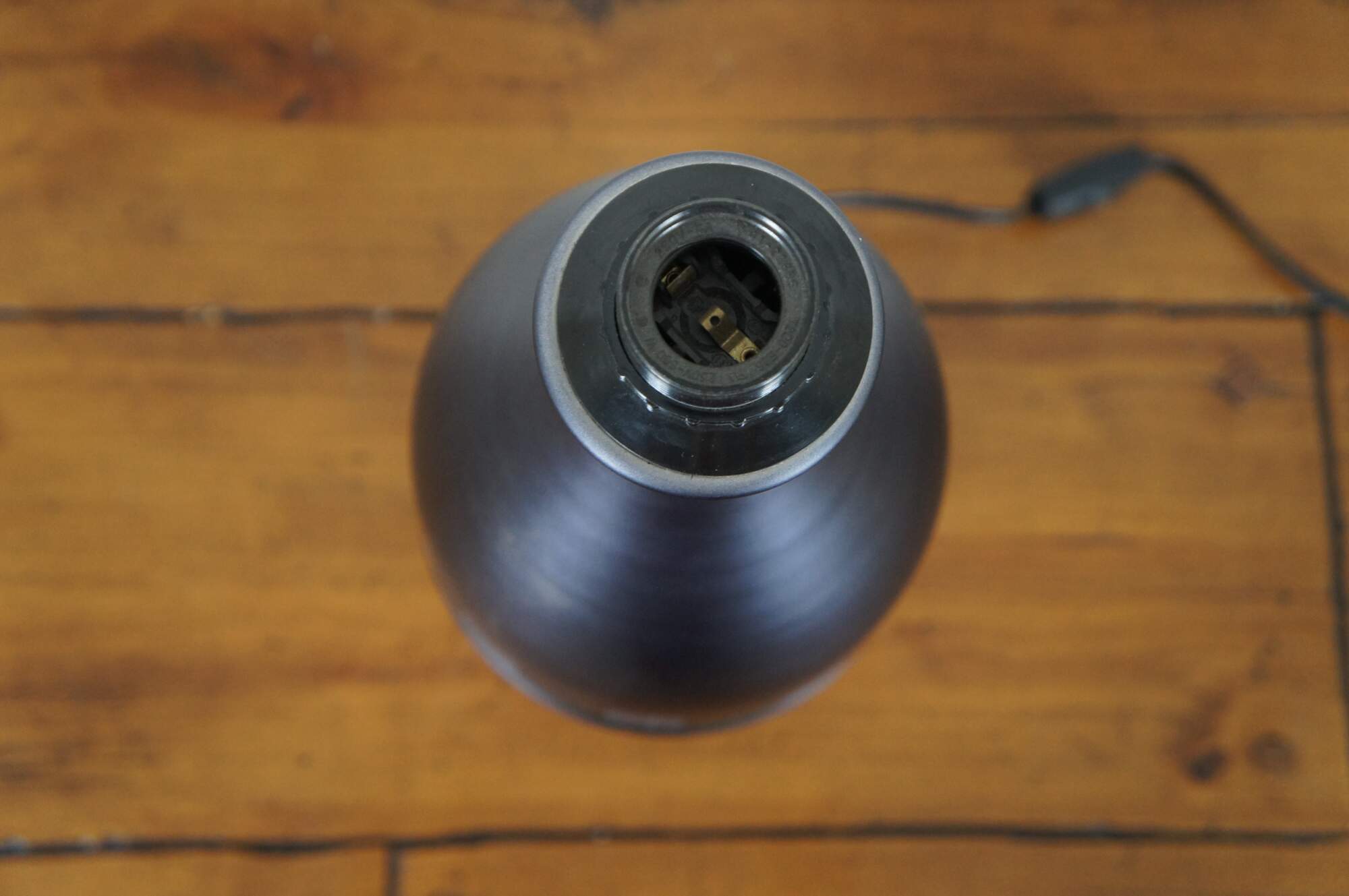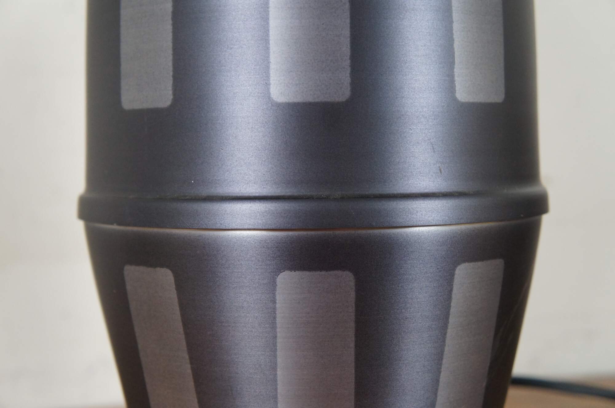 Vintage Babette Holland spun metal Juggler table lamp in graphite gray with geometric accents and an olive brown shade. The Juggler table lamp gets its name from its shape, which is similar to the pins juggled by a jester or clown. Style TL-32.