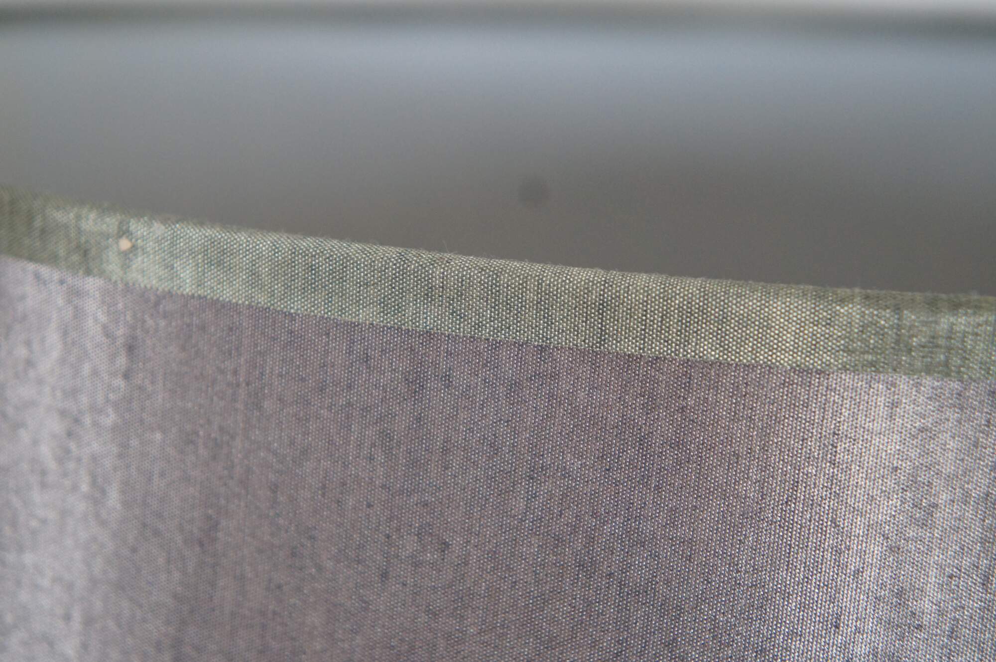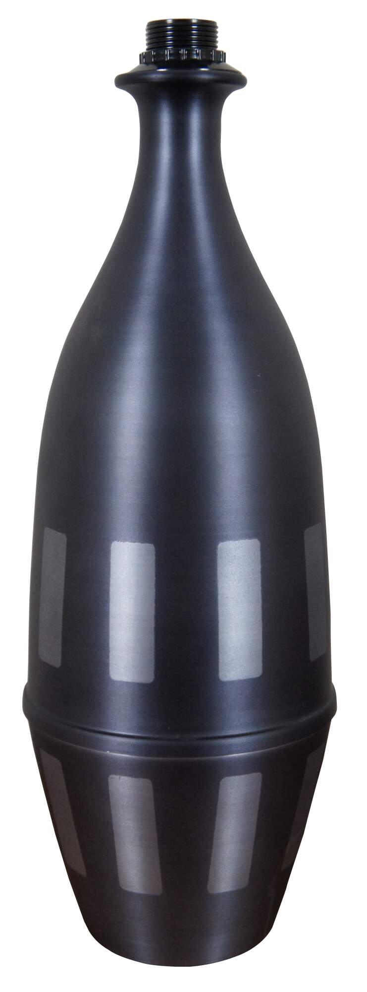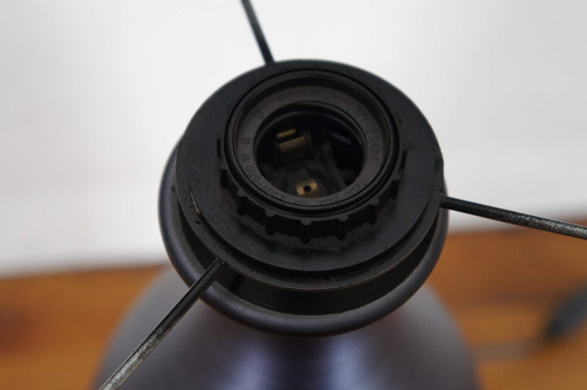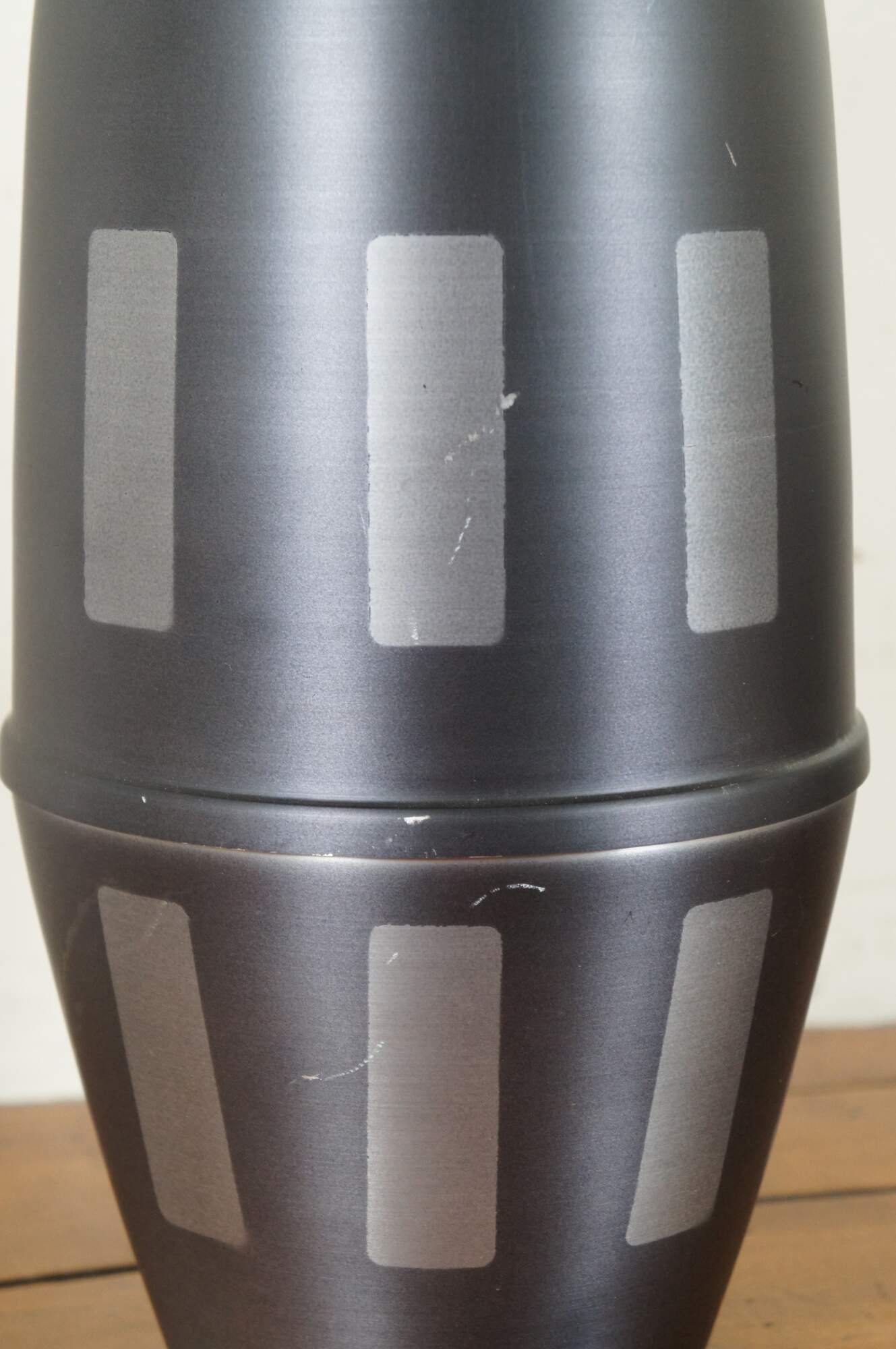 Vintage Babette Holland spun metal Juggler table lamp in graphite gray with geometric accents and an olive brown shade. The Juggler table lamp gets its name from its shape, which is similar to the pins juggled by a jester or clown. Style TL-32.