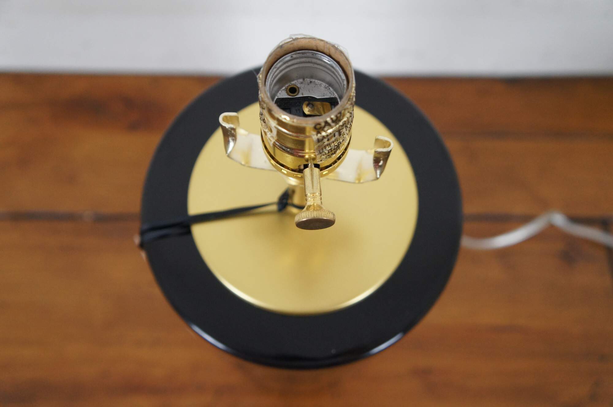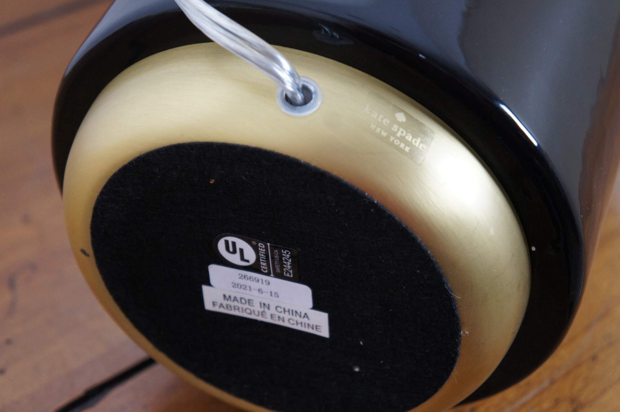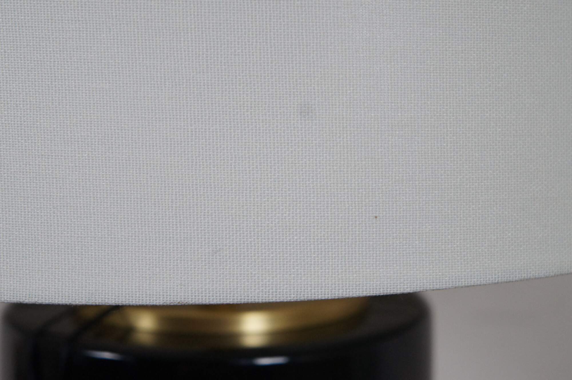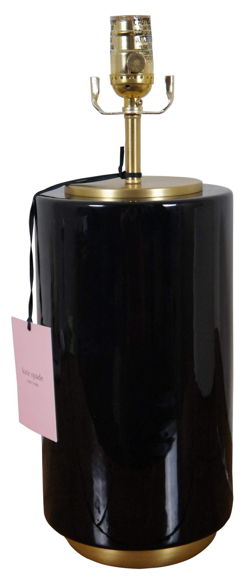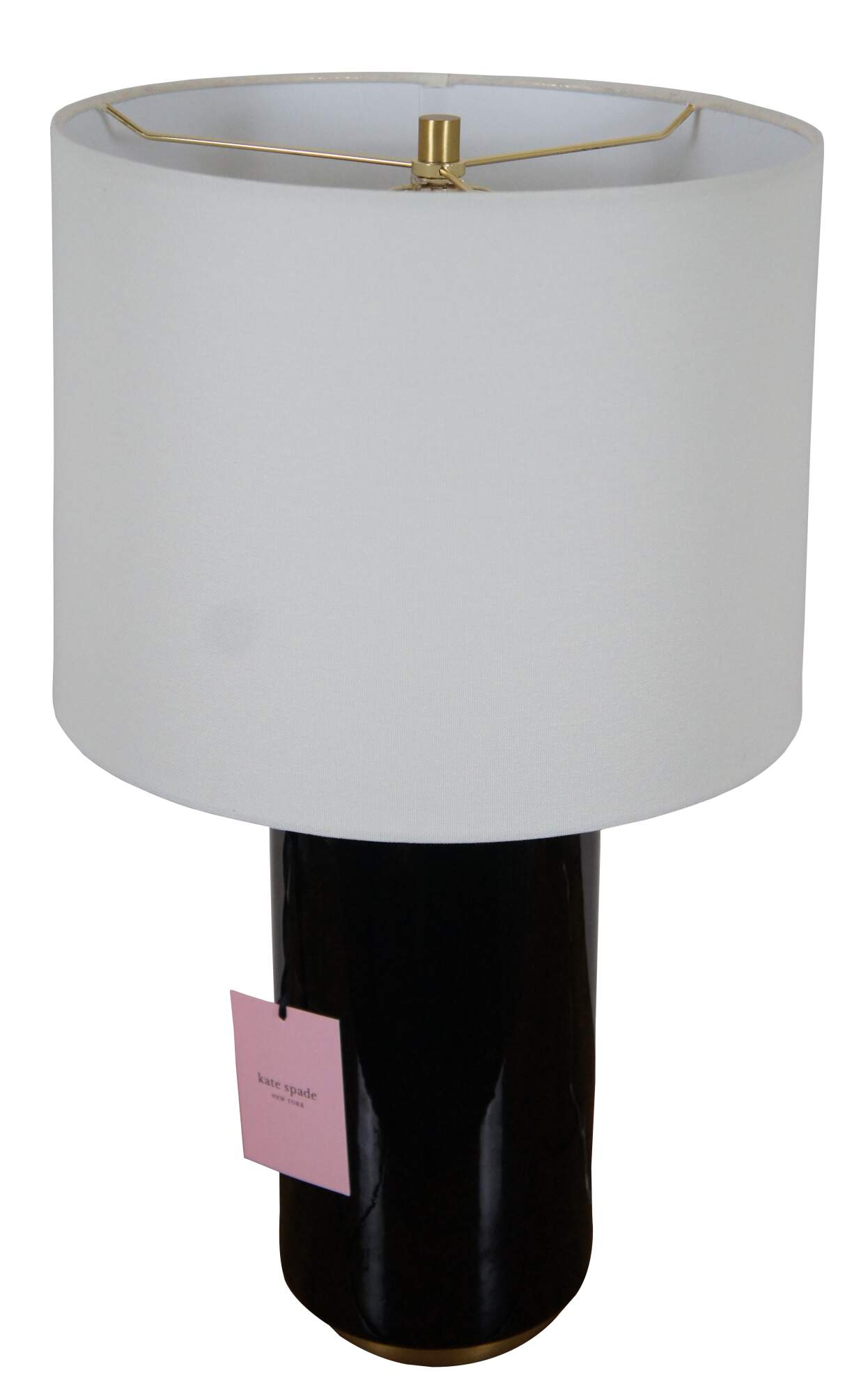 Kate Spade New York black porcelain cylindrical jar shaped table lamp with brushed brass base and top. Includes white shade.