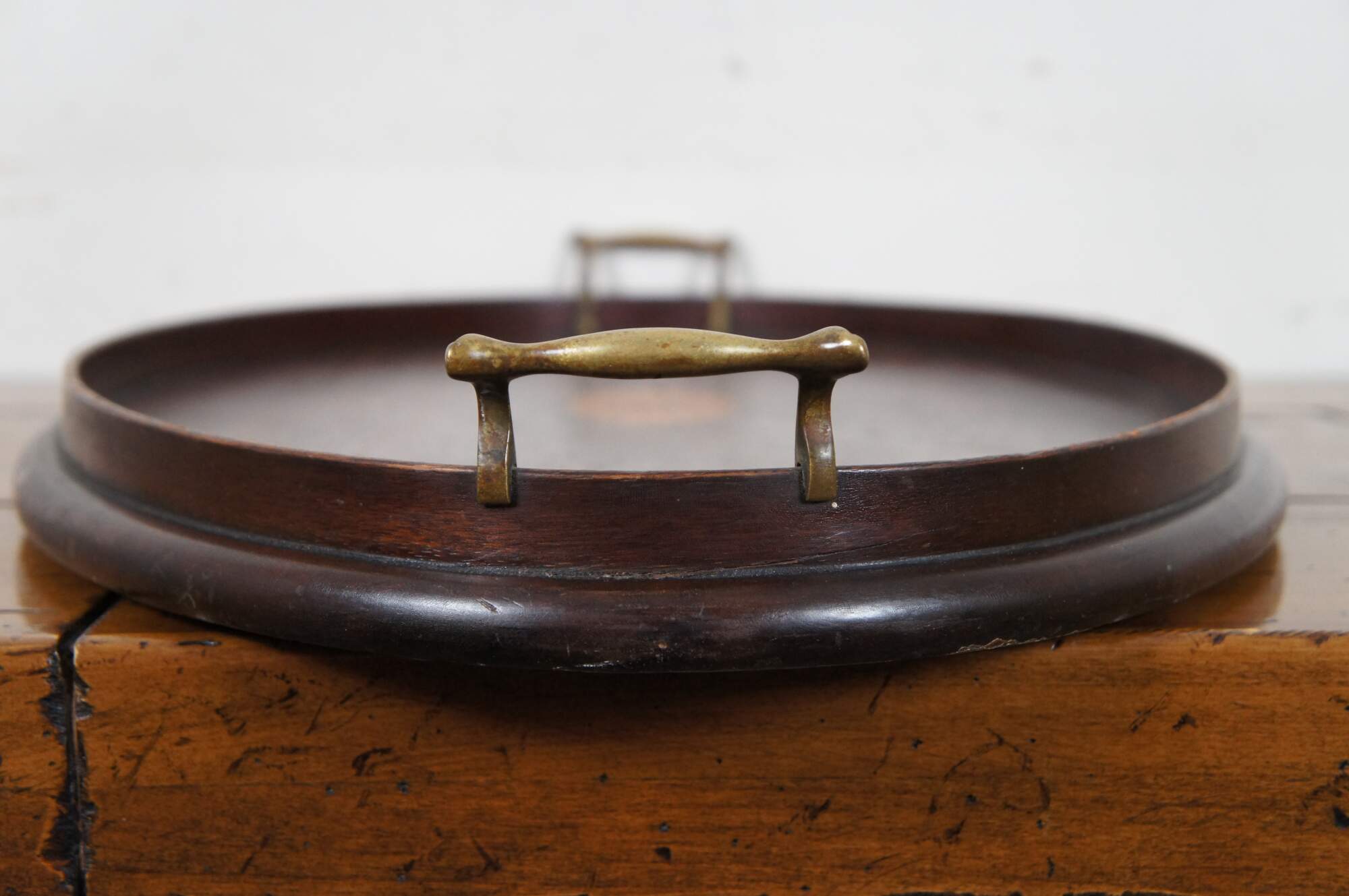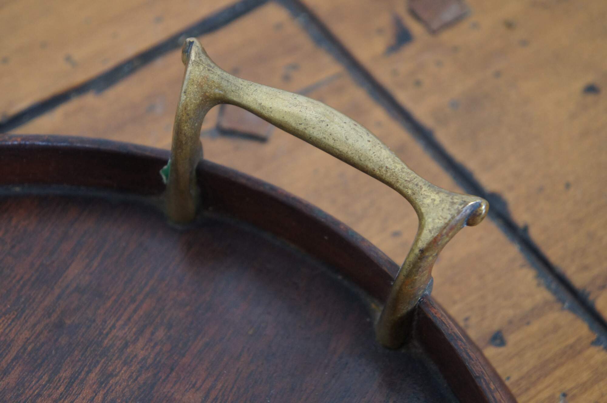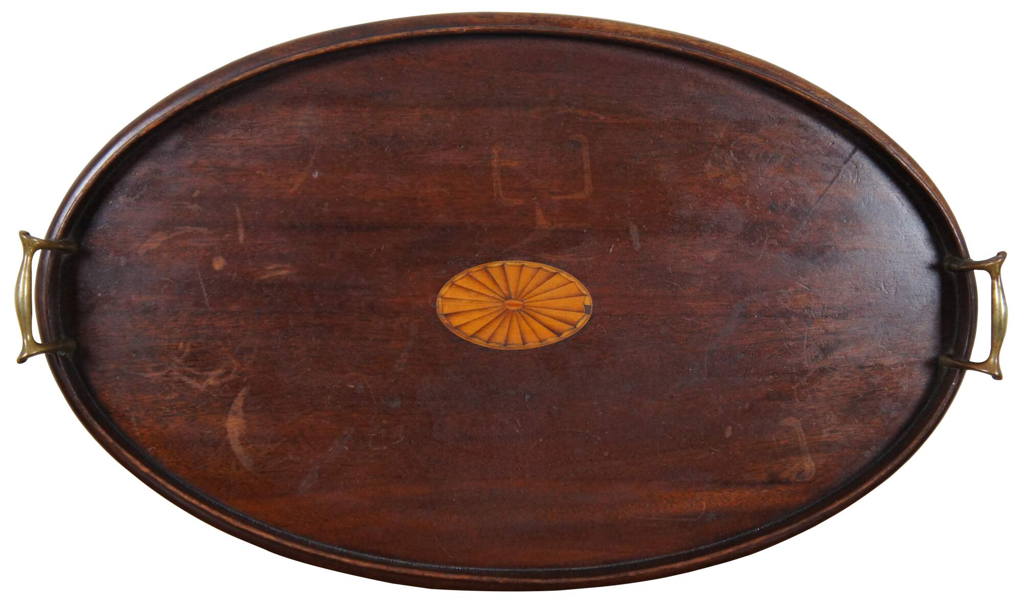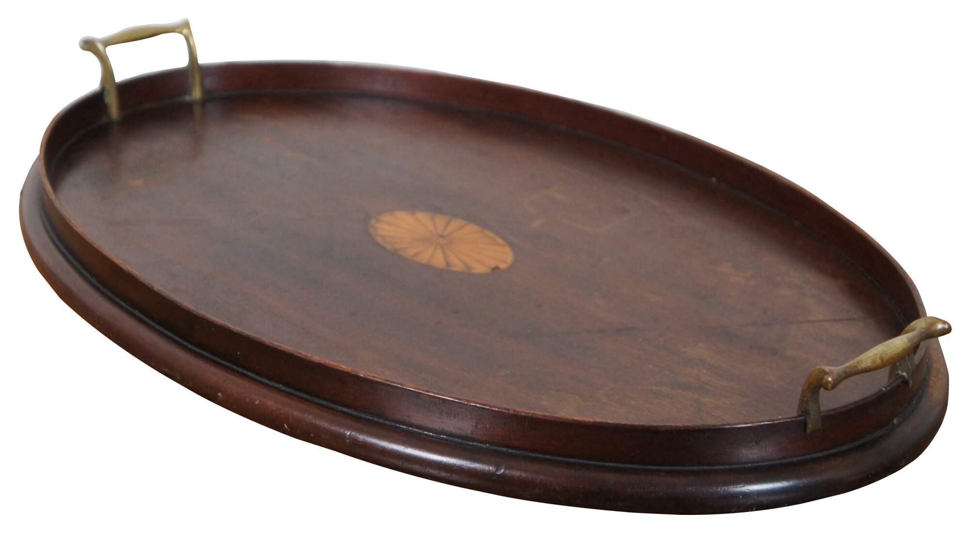 Antique Edwardian or Sheraton oval mahogany butler’s tea / coffee or bar serving tray with inlaid medallion, raised gallery edge, and brass handles.