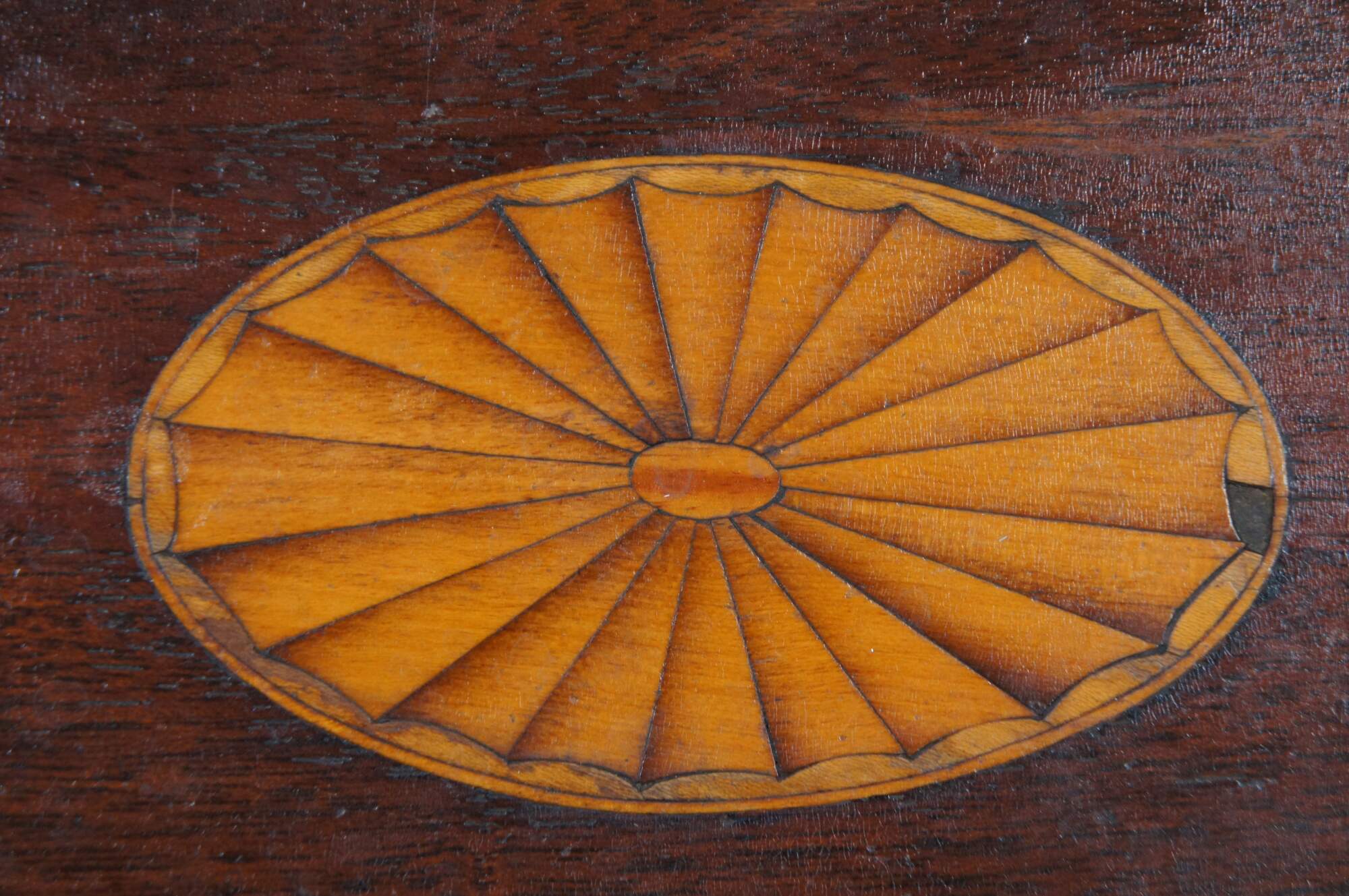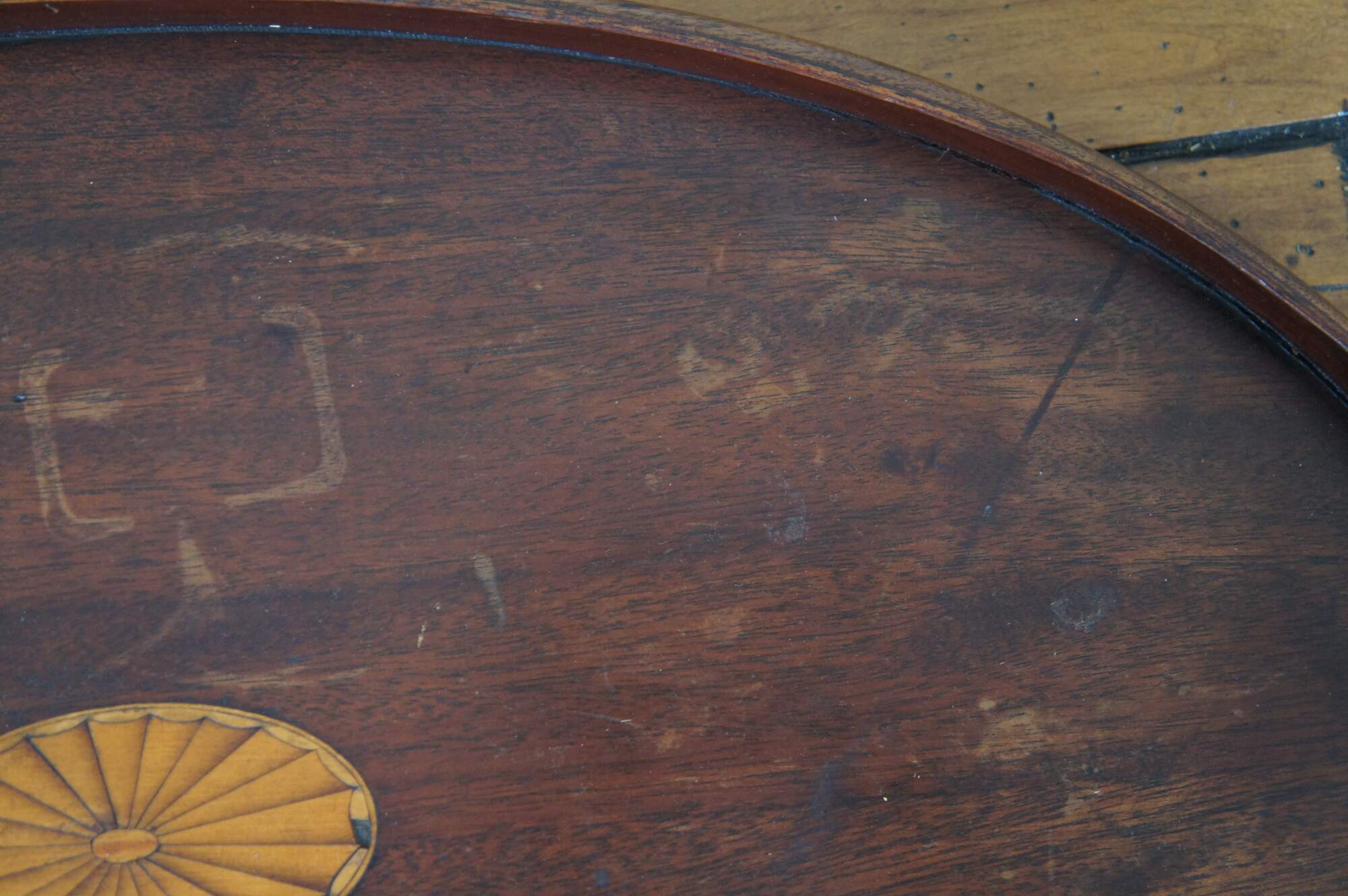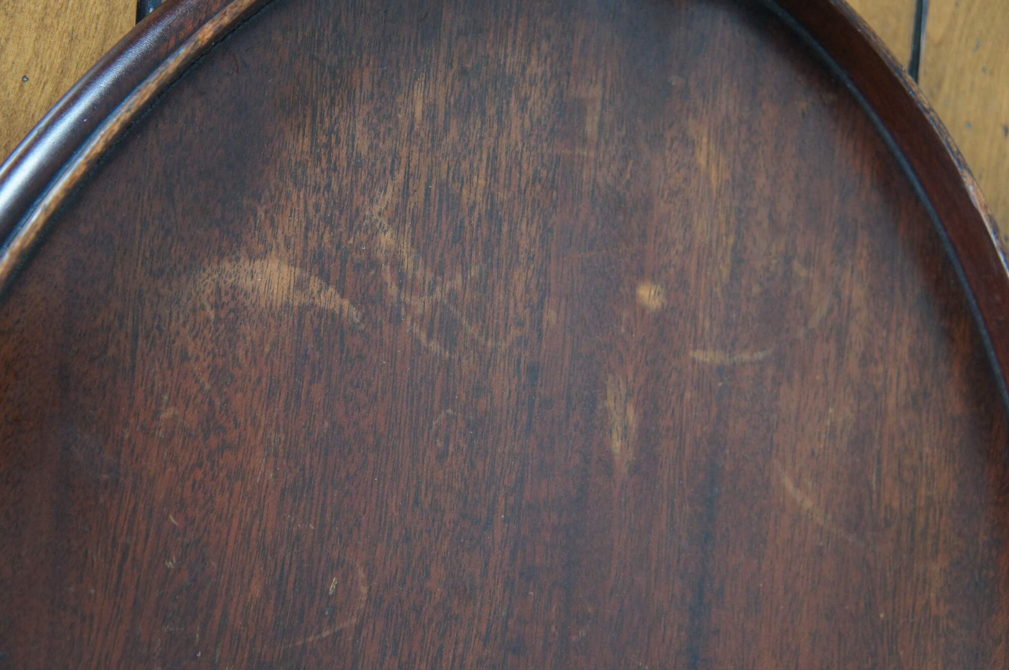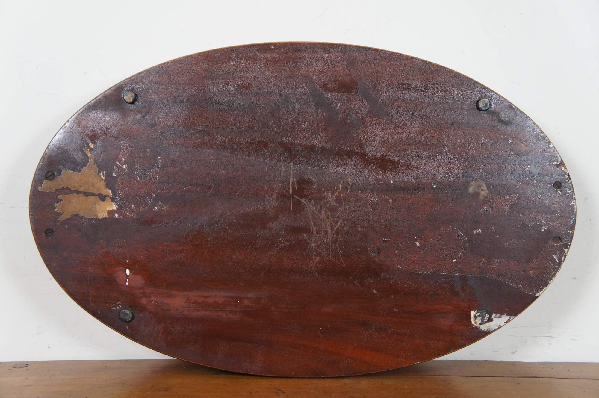 Antique Edwardian or Sheraton oval mahogany butler’s tea / coffee or bar serving tray with inlaid medallion, raised gallery edge, and brass handles.