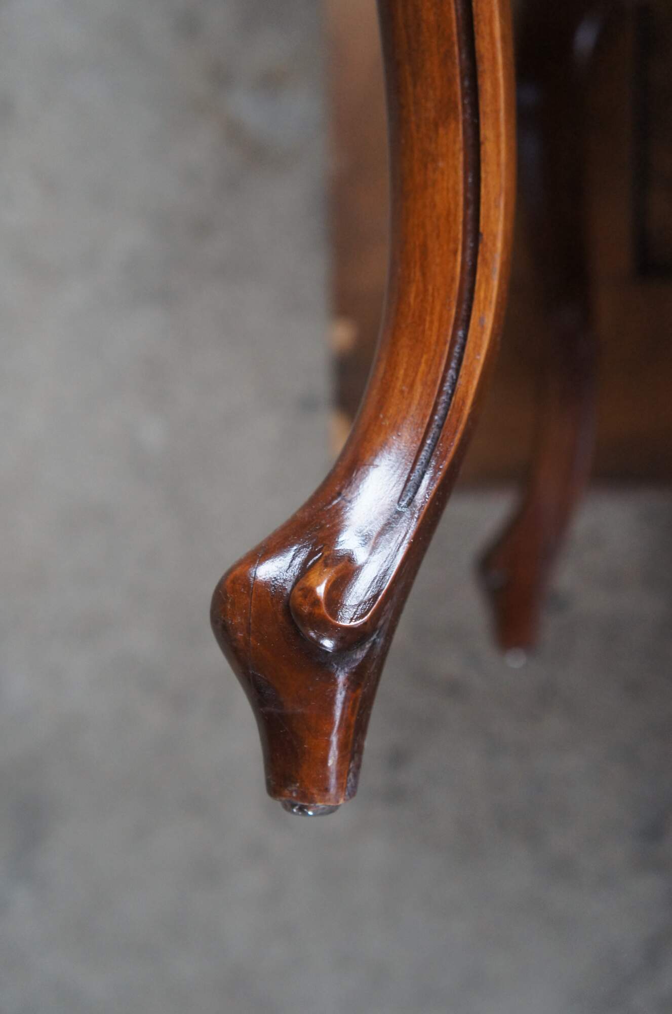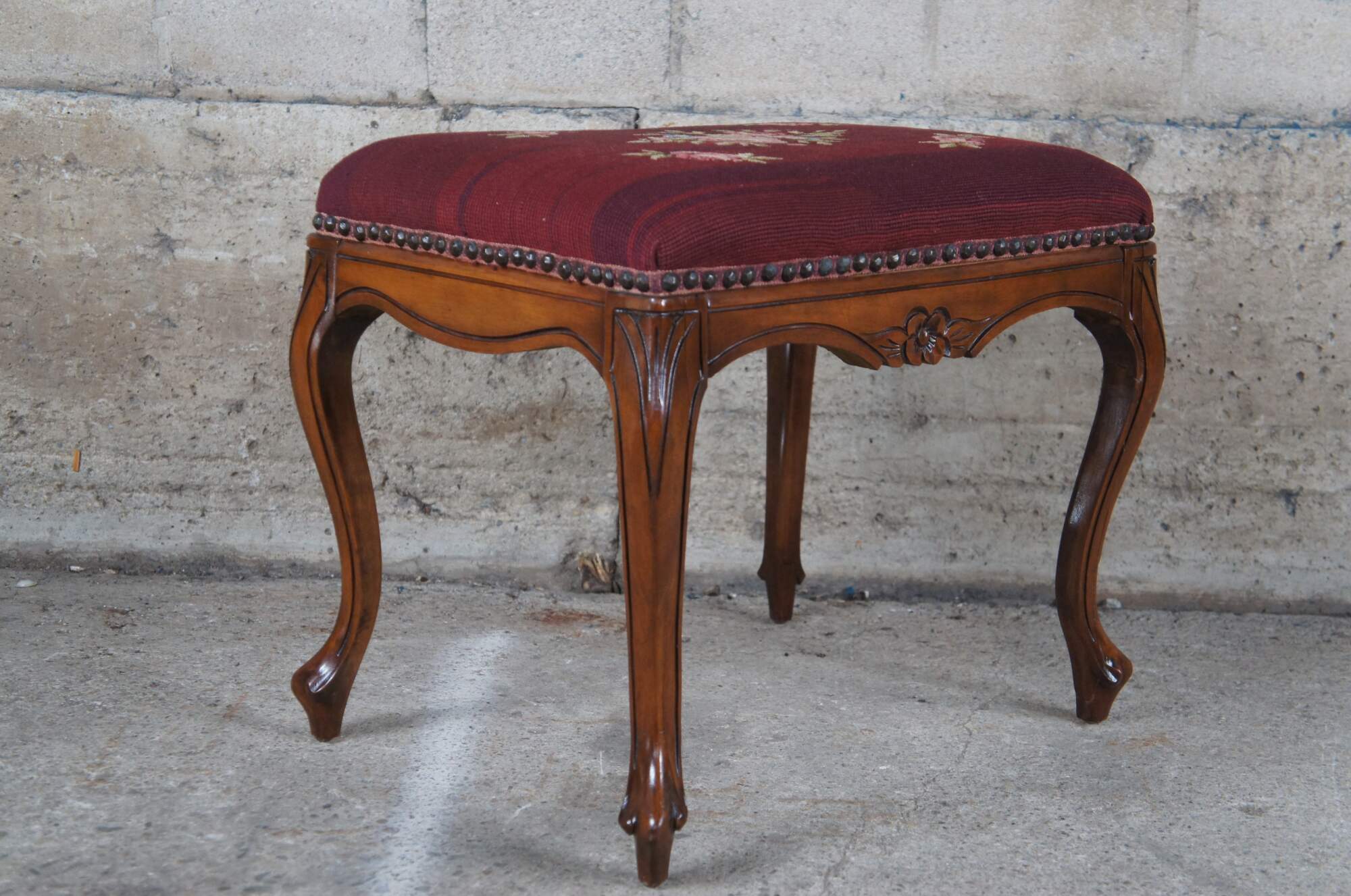 Vintage Provincial bench by Niehoff out of Oregon. Features a rectangular frame with floral embroidered seat, nail head trim and long cabriole legs.