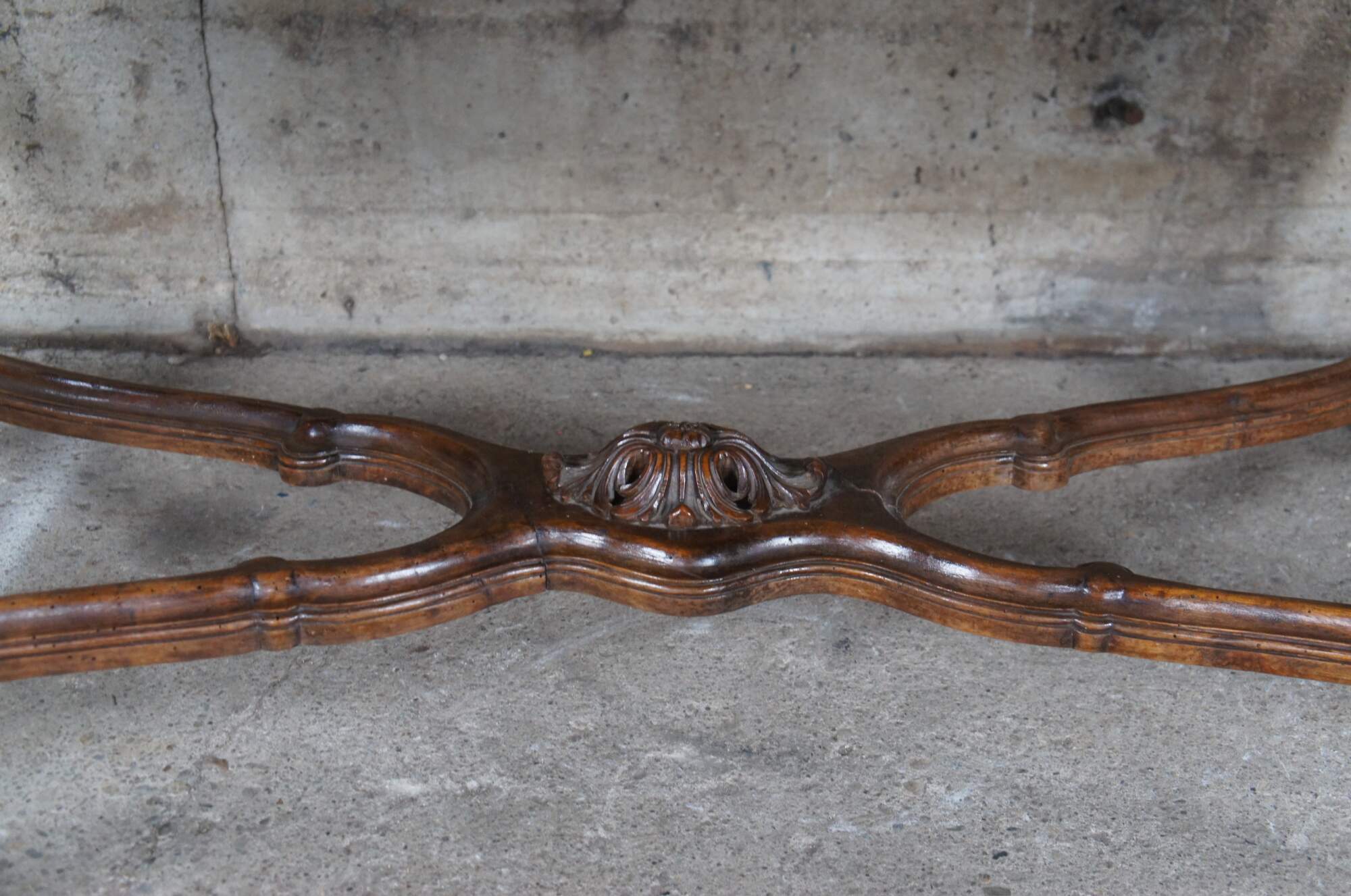 Antique French Louis XV dining table or library desk. Made of walnut featuring burl matchbook top with serpentine form and high relief carved acanthus accents, and cabriole legs connected by stretcher with central medallion.